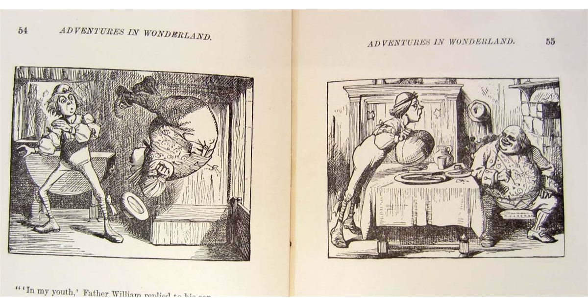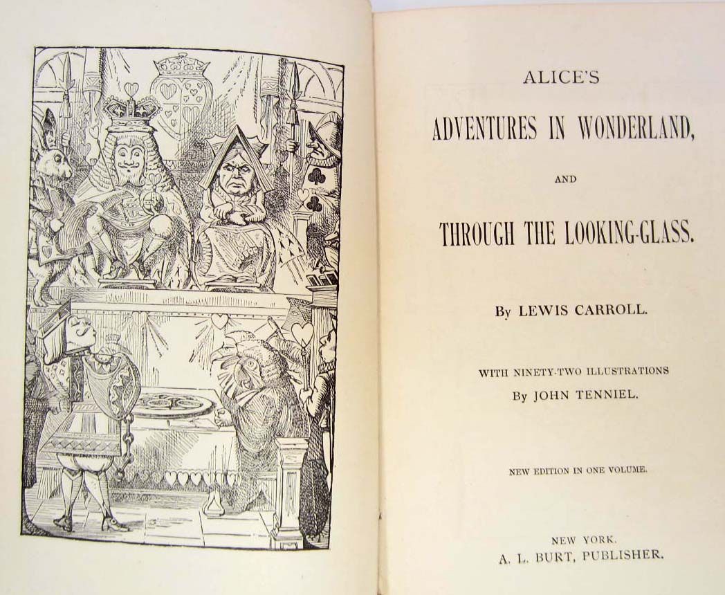 "And Through the Looking Glass" Hardcover Book. "With Ninety-Two Illustrations by John Tenniel A New Edition in One Volume." Burgundy cloth boards with gilt lettering on spine and gilded top edge.