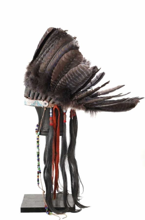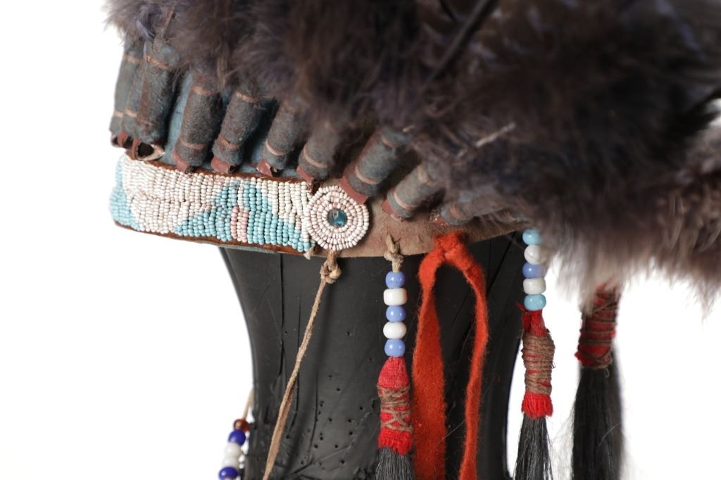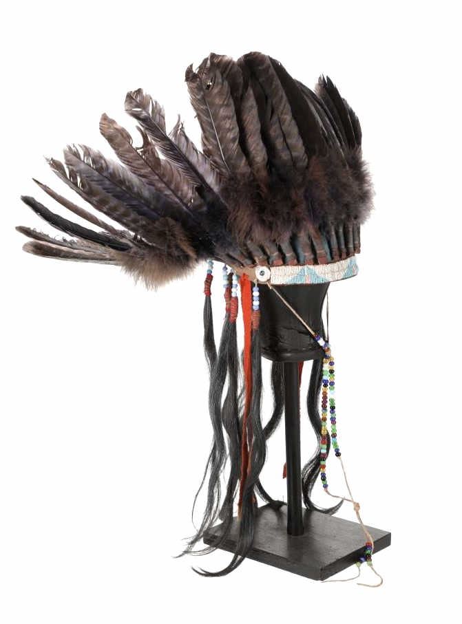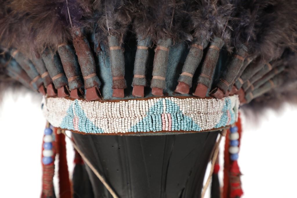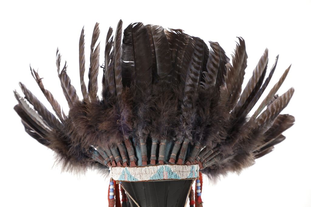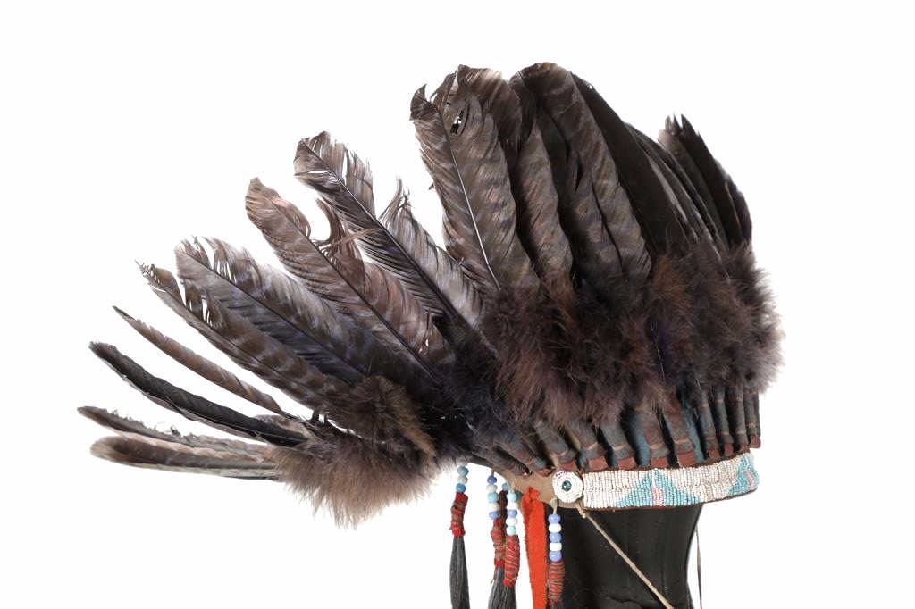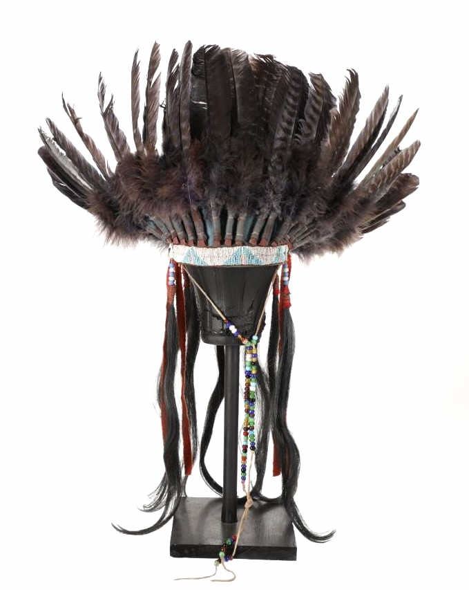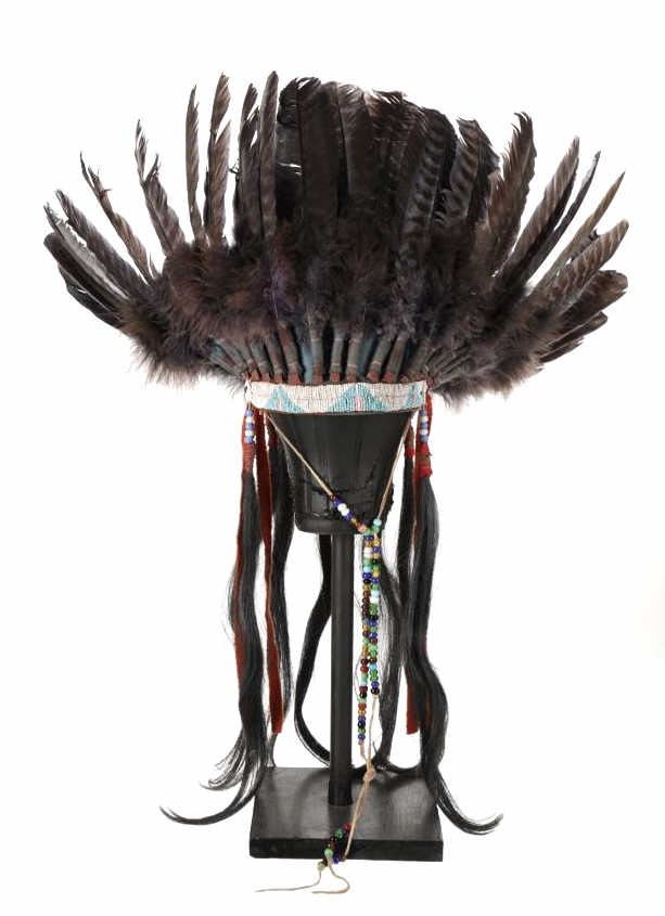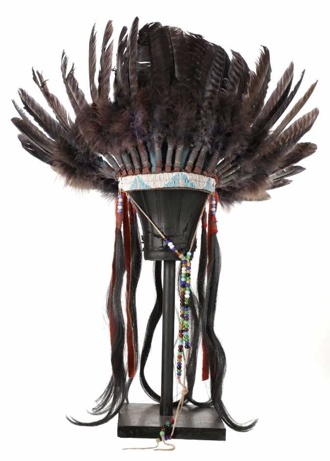 The lot features a fantastic circa early-to-mid 1900 feathered head dress attributed to the Osage Native American Indians of Oklahoma. The collector noted the pieces as being from circa 1910, but some aspects of the piece appear to have been repaired, replaced or later. The piece is made of a felt cap liner, with darkened and dyed turkey feathers along with a beaded brown band done in colors of light blue and white with a classic Osage geometric pattern. There are strips of old red stroud clothe, trade beads, and eight long human hair drops attached. The original hide tie straps are still intact. There are some minor stains from use and old brown and green paints on the feather stems along with some parts of the felt. The entire headdress is in very good condition and comes with a custom display stand. The head dress was acquired at the Osage Indian Reservation at Pawhuska, Oklahoma and was likely used as a dance head dress during the middle reservation period. Provenance from the Ex-Dale Harrison collection.