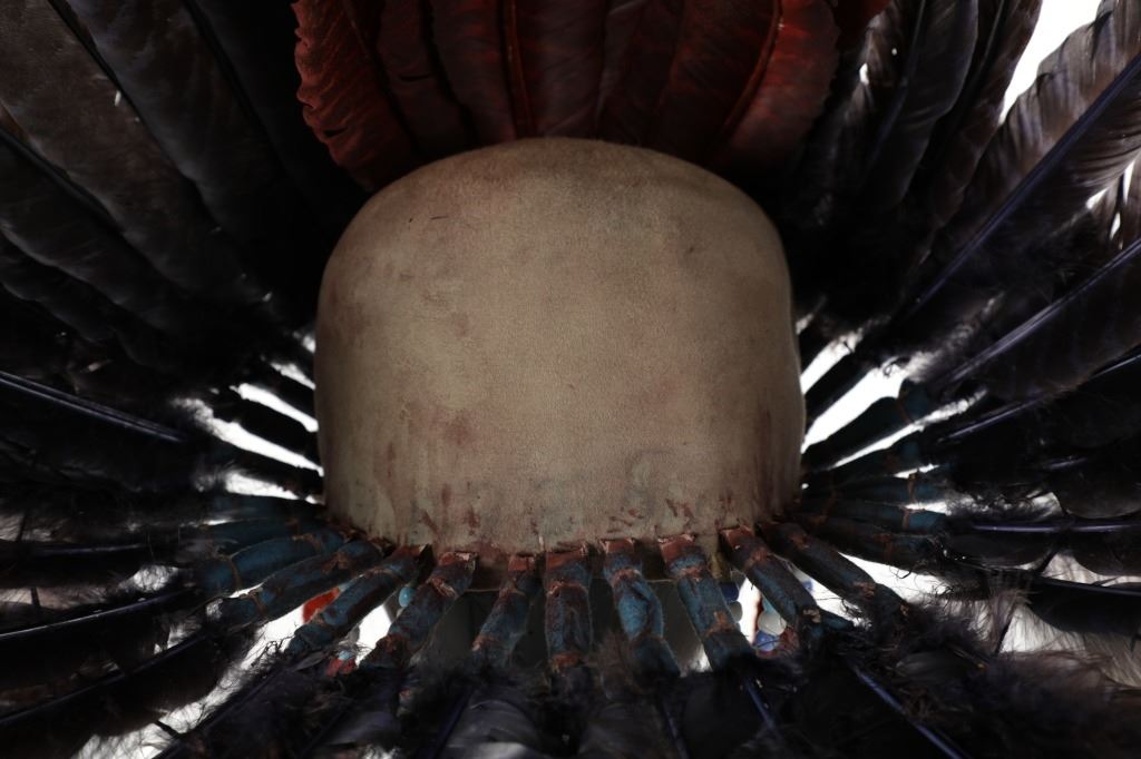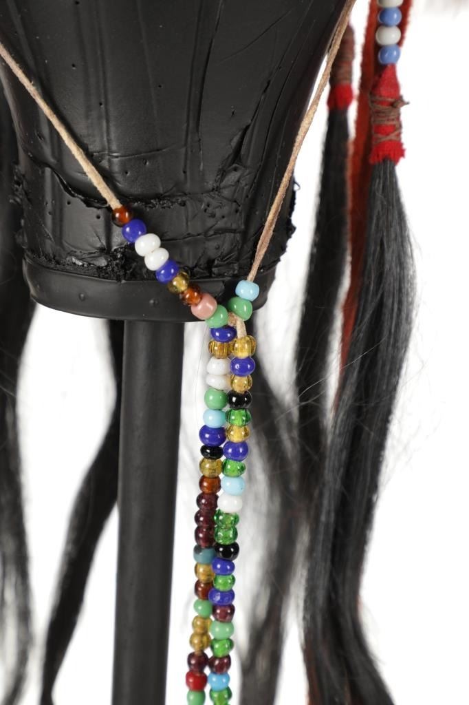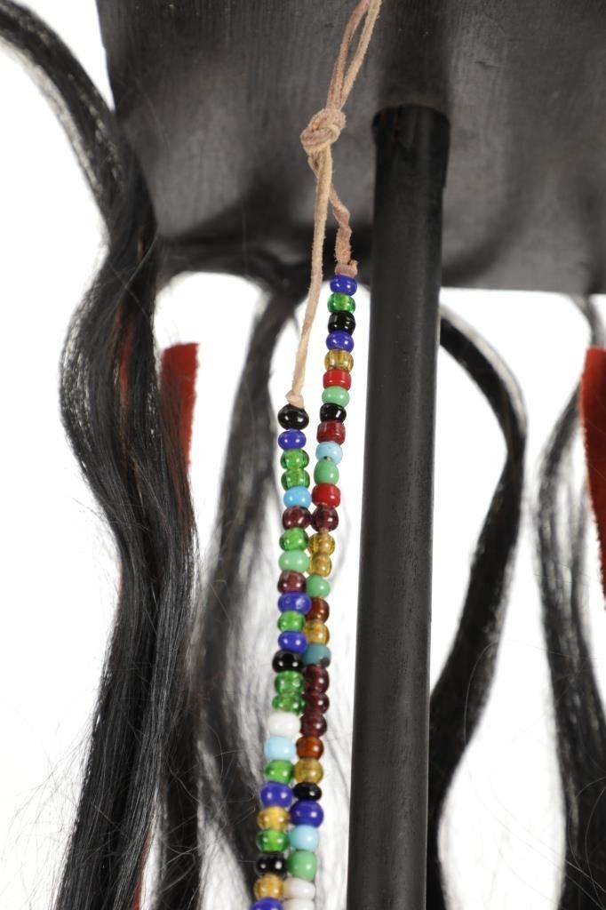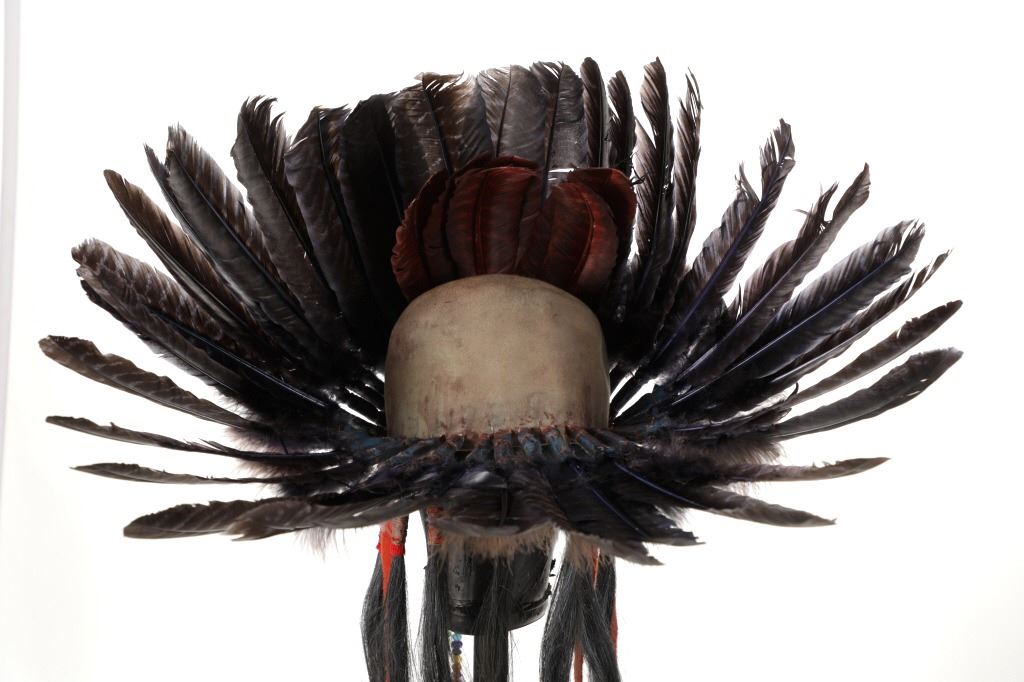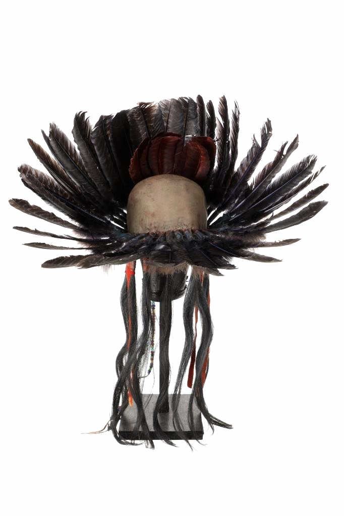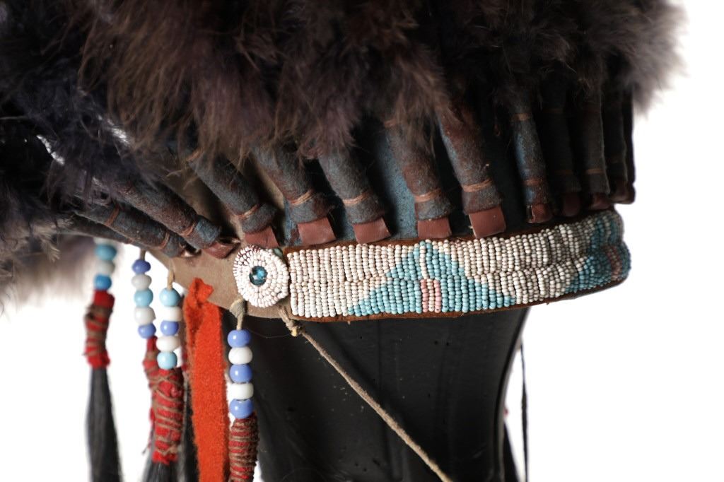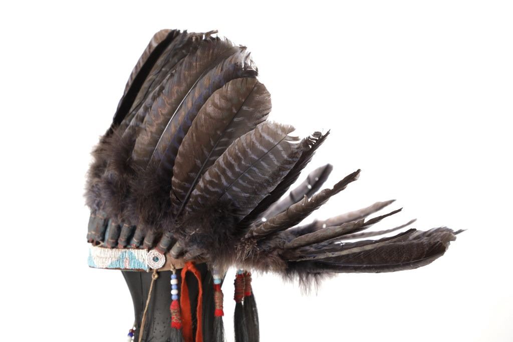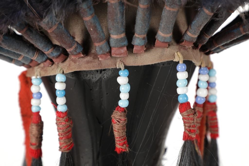 The lot features a fantastic circa early-to-mid 1900 feathered head dress attributed to the Osage Native American Indians of Oklahoma. The collector noted the pieces as being from circa 1910, but some aspects of the piece appear to have been repaired, replaced or later. The piece is made of a felt cap liner, with darkened and dyed turkey feathers along with a beaded brown band done in colors of light blue and white with a classic Osage geometric pattern. There are strips of old red stroud clothe, trade beads, and eight long human hair drops attached. The original hide tie straps are still intact. There are some minor stains from use and old brown and green paints on the feather stems along with some parts of the felt. The entire headdress is in very good condition and comes with a custom display stand. The head dress was acquired at the Osage Indian Reservation at Pawhuska, Oklahoma and was likely used as a dance head dress during the middle reservation period. Provenance from the Ex-Dale Harrison collection.