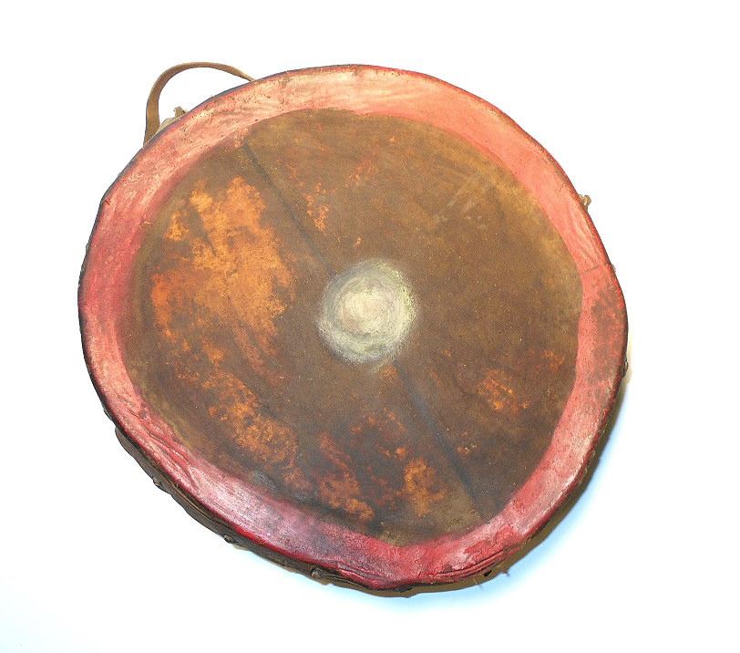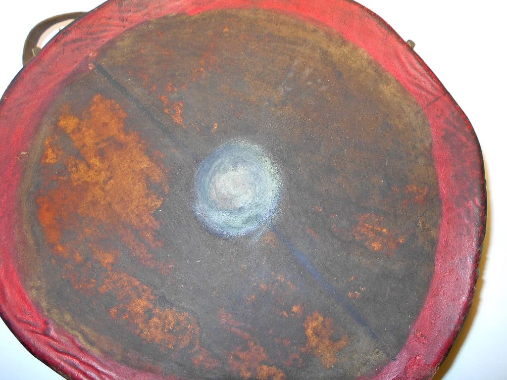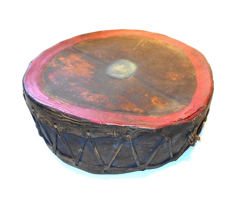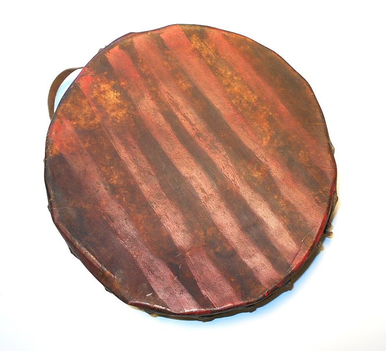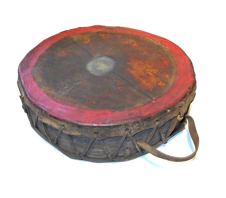 The lot features an authentic, circa 1900 polychrome painted dance drum attributed to the Cheyenne Indians of Wyoming. The piece is comprised of a bent wood frame, Buffalo hide lacing, and stretched and wetted Buffalo hide flats. The drum still has the original hand strap still attached. The piece is painted on both sides in faded colors of red and black, which were commonly used by the Cheyenne Indians of the 19th Century and early Indian Reservation era. The front has a circular border with two thin lines drawn to a circular pound spot in the center and the back side has black and red strips. Provenance: From the ex-collection of Tom Hardy of Indianapolis, Indiana. The drum measures overall 13 inches in diameter by 4 inches tall.