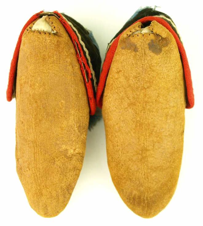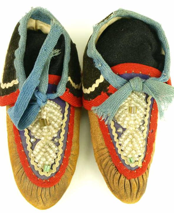 probably Iroquois with pony beaded vamps, velvet trade cloth lined, pucker toed design, 12 1/2" overall.