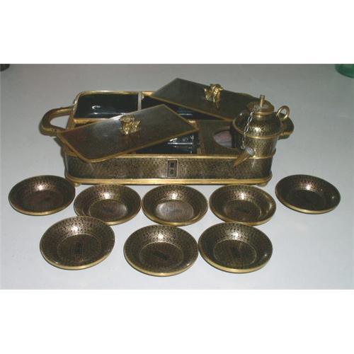 Beautiful Chinese custom-made black enamel on brass monogrammed cloisonne' opium set w/ two handles.   8.5" long x 6" wide x 1.5" high.    Set comprised of 5 compartment container base, two lids, 8 small round saucers and alcohol burner.    "S" monogram on both sides of container length, alcohol burner and all eight saucers.   Two foo dog handled lids covering three compartments.   Fourth compartment is for eight 2.5" round saucers.   Fifth compartment/slot is for the alcohol burner.   Alcohol burner (2 ¾ " high) has a handle and wick cover.   No identifying maker marks.    No cracks, chips or other damage.   Very fine cloisonne' set custom-made for a European or American customer.   Circa 1880-1920.