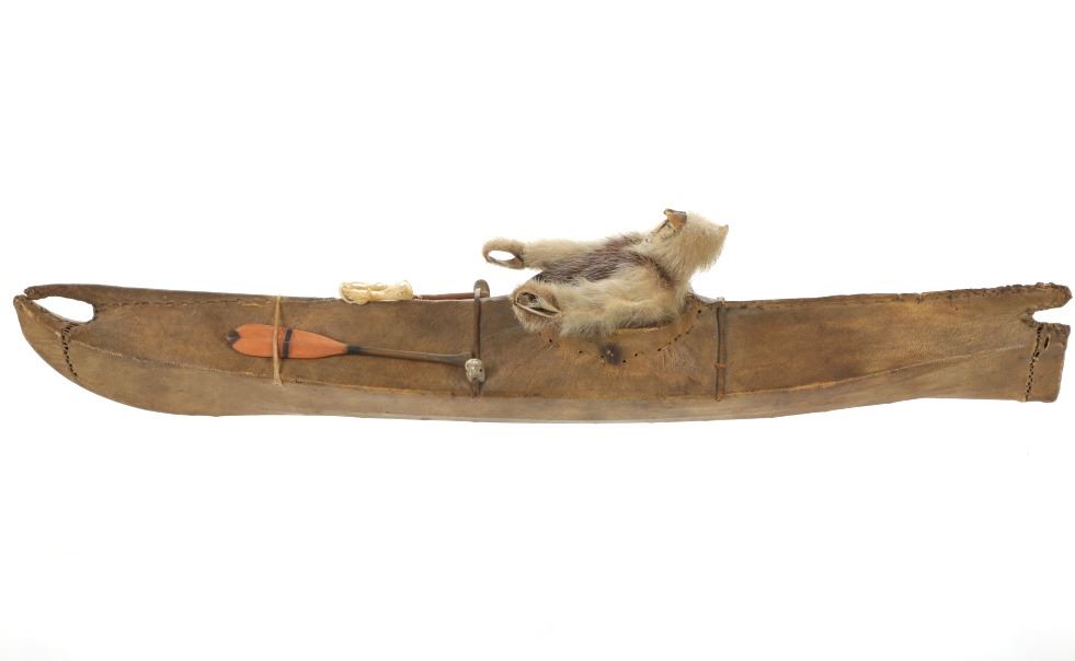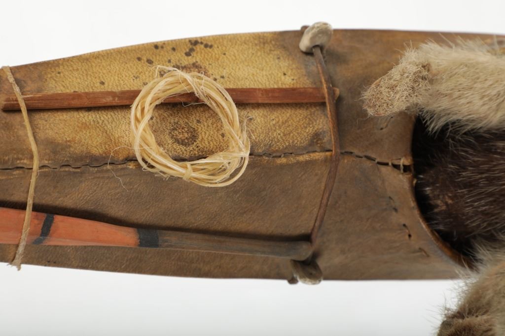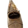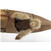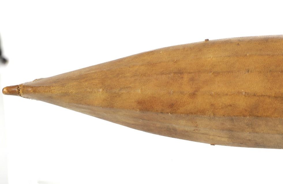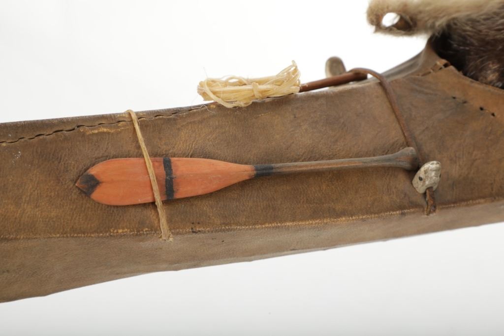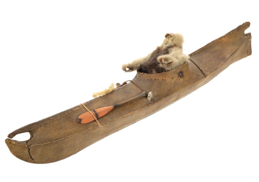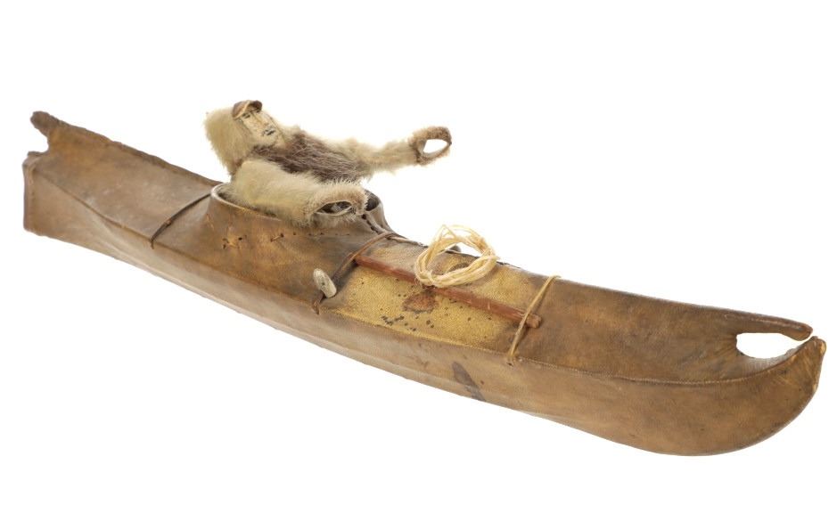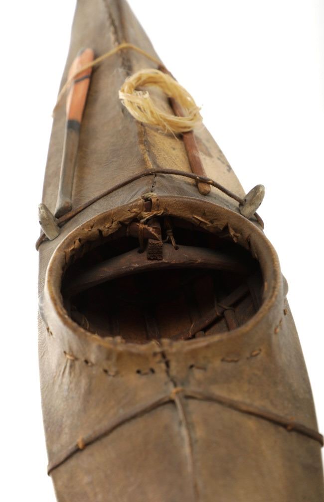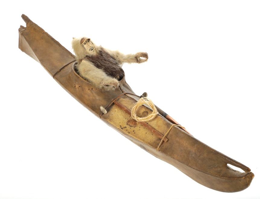 This is an authentic circa 1900 Eskimo Inuit sealskin covered wood frame model kayak with hunter figure. The piece consist of an intricate and true to scale wood frame being completely covered in sealskin or seal skin rawhide and sewn with both trade thread and sinew. The kayak is further adorned with straps of rawhide which hold miniature carved wooden paddle, staff, wrapping of sinew fishing rope and two bone amulet scrimshaw carvings or weights. The human effigy figure has only half a body which is constructed from sealskin or seal skin fur with rawhide face having black scrimshaw markings, looped hands to hold the paddle and a tie of sinew rawhide with a single lead fishing weight at the end. Each end has a unique feature, only seen on other circa 19th to early 20th Century examples, such as the whale mouth like front and rutter shaped end. This example is of larger size and higher detail than any other example we have ever brought to sale and is truly a price. Very similar the piece from the Valentine Pasvolsky Collection soldy by Heritage Auctions in 2013 for $5,312.50. Provenance: From the renowned Sundog Fine Art Bozeman, Montana collection by Bruce VanLandingham. Bruce VanLandingham was a pillar in the American Indian collecting community and a respected expert. Along with being an avid collector, Bruce was also the sole owner of Sundog Fine Art Gallery in Bozeman, which was both part museum and gallery, this piece is directly from the collection. The kayak measures overall 21 1/8”L by 4”W and approximately 5”H when the hunter figure is present and 2 7/8”H when he is not. The hunter is removable. Museum collection number of E1025.