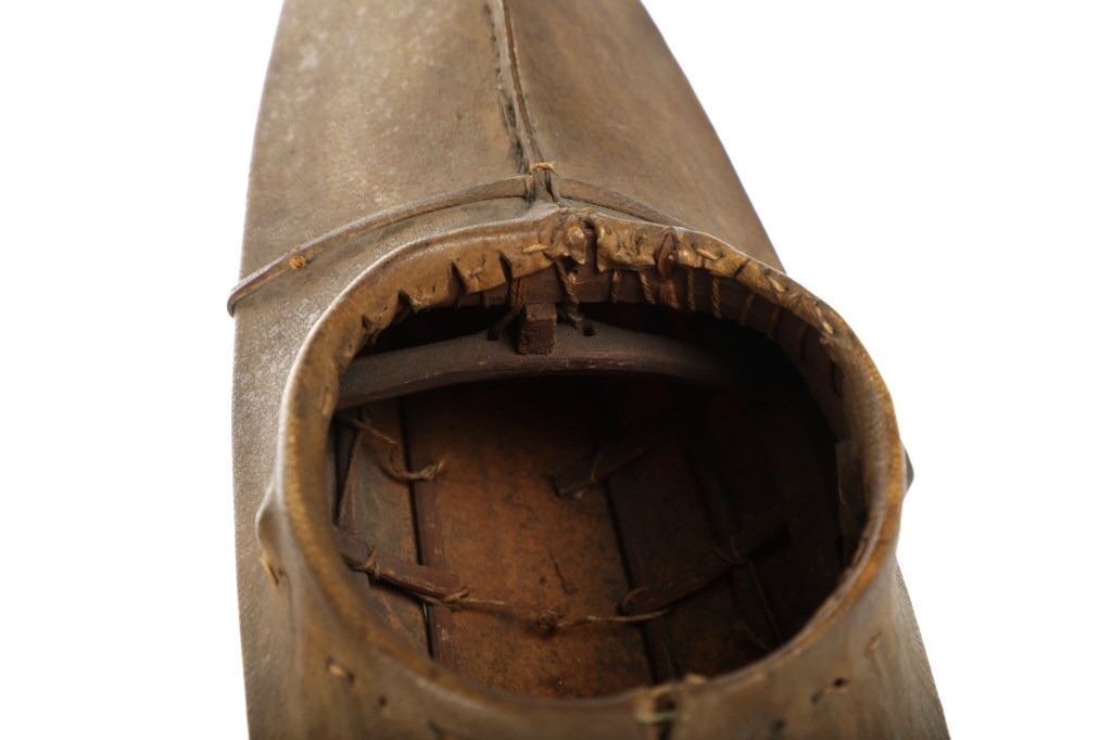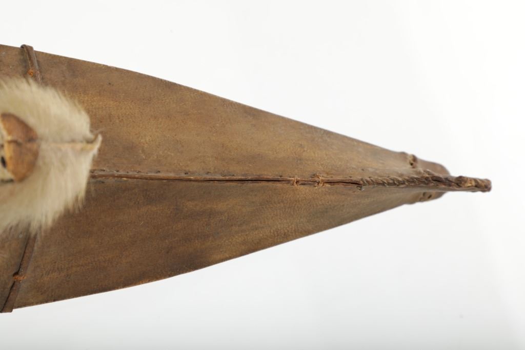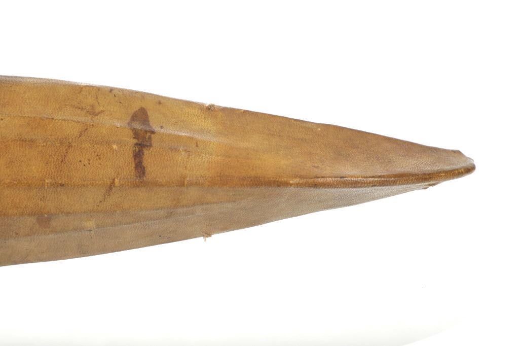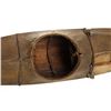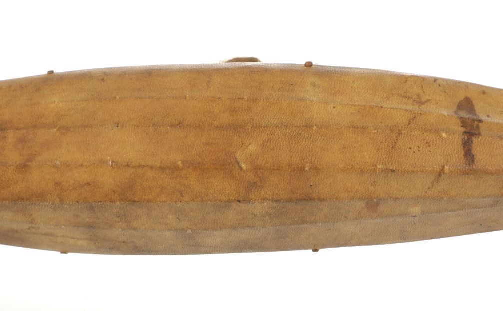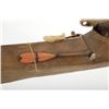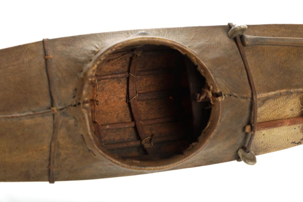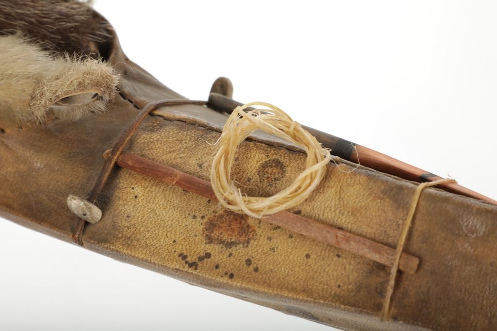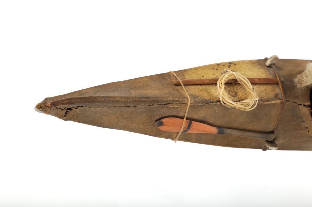This is an authentic circa 1900 Eskimo Inuit sealskin covered wood frame model kayak with hunter figure. The piece consist of an intricate and true to scale wood frame being completely covered in sealskin or seal skin rawhide and sewn with both trade thread and sinew. The kayak is further adorned with straps of rawhide which hold miniature carved wooden paddle, staff, wrapping of sinew fishing rope and two bone amulet scrimshaw carvings or weights. The human effigy figure has only half a body which is constructed from sealskin or seal skin fur with rawhide face having black scrimshaw markings, looped hands to hold the paddle and a tie of sinew rawhide with a single lead fishing weight at the end. Each end has a unique feature, only seen on other circa 19th to early 20th Century examples, such as the whale mouth like front and rutter shaped end. This example is of larger size and higher detail than any other example we have ever brought to sale and is truly a price. Very similar the piece from the Valentine Pasvolsky Collection soldy by Heritage Auctions in 2013 for $5,312.50. Provenance: From the renowned Sundog Fine Art Bozeman, Montana collection by Bruce VanLandingham. Bruce VanLandingham was a pillar in the American Indian collecting community and a respected expert. Along with being an avid collector, Bruce was also the sole owner of Sundog Fine Art Gallery in Bozeman, which was both part museum and gallery, this piece is directly from the collection. The kayak measures overall 21 1/8”L by 4”W and approximately 5”H when the hunter figure is present and 2 7/8”H when he is not. The hunter is removable. Museum collection number of E1025.
