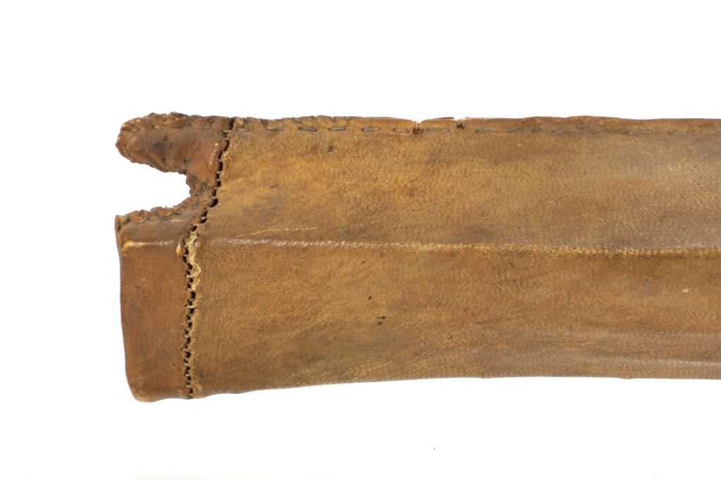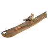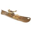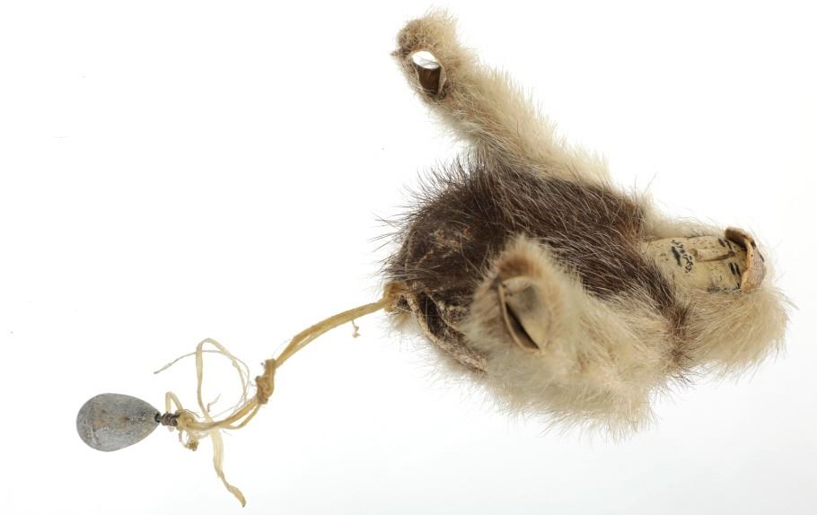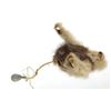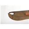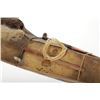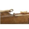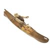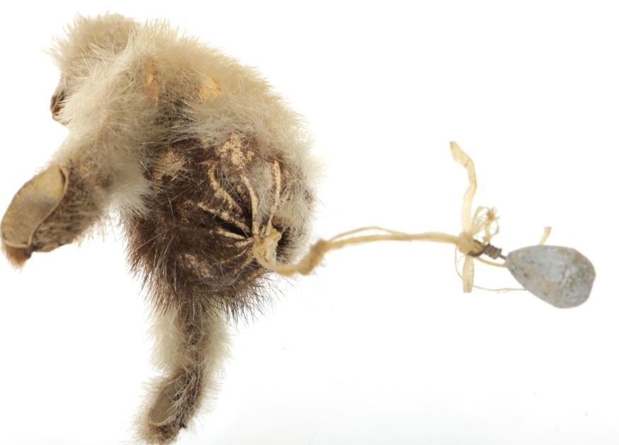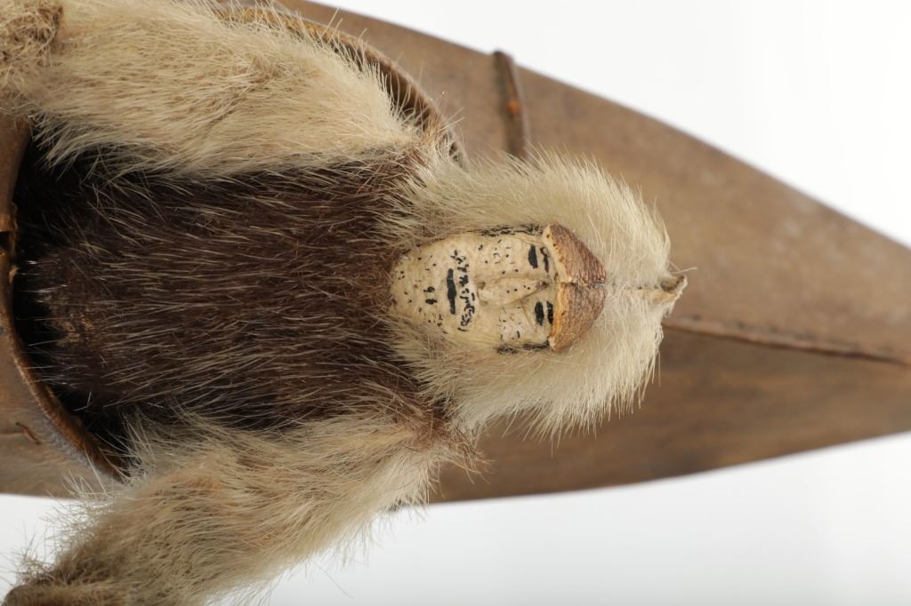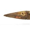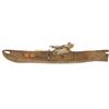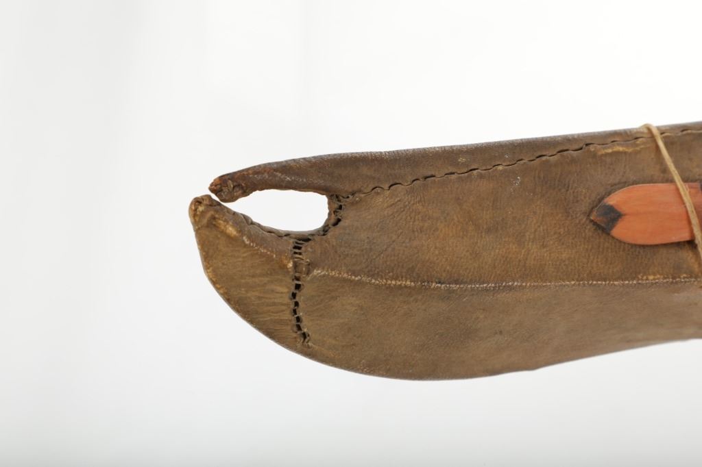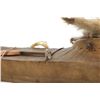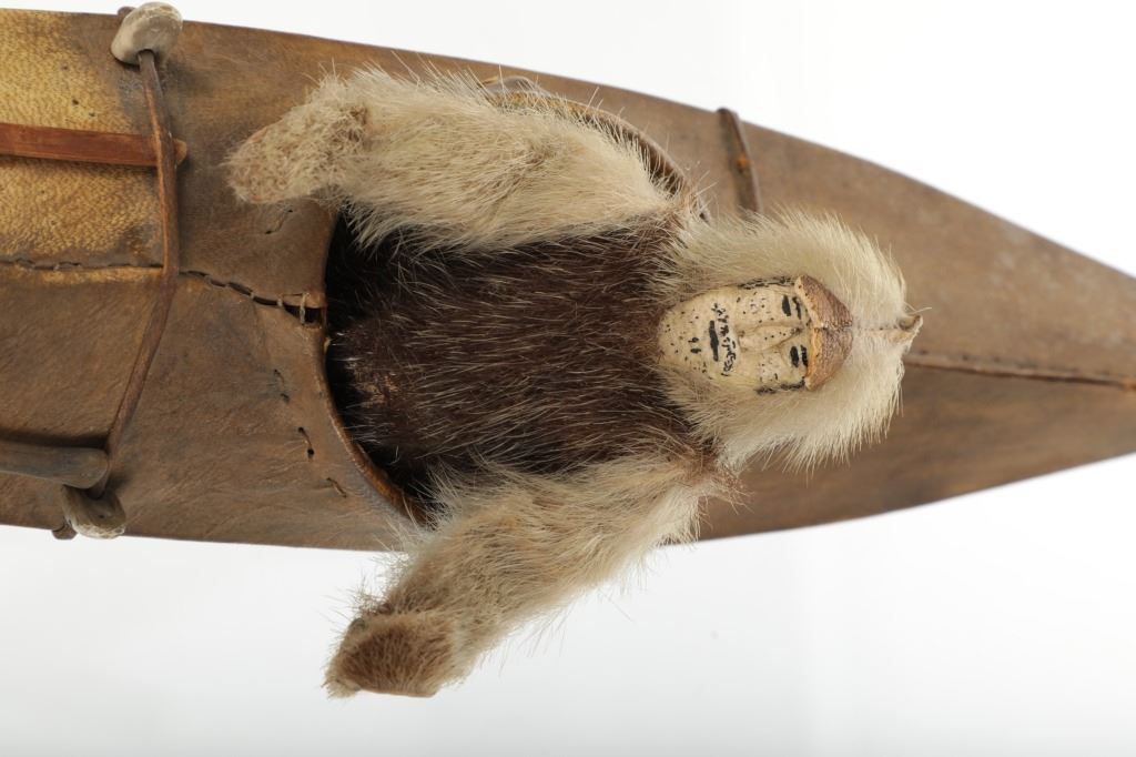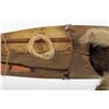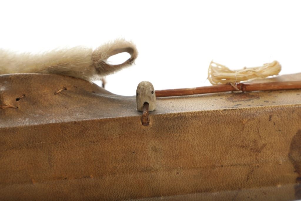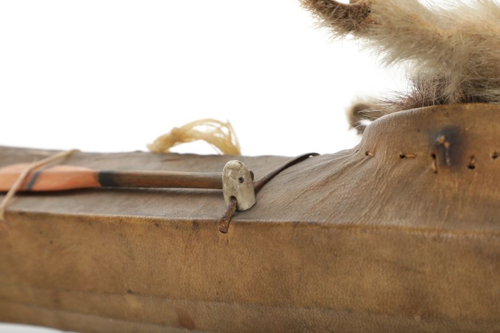 This is an authentic circa 1900 Eskimo Inuit sealskin covered wood frame model kayak with hunter figure. The piece consist of an intricate and true to scale wood frame being completely covered in sealskin or seal skin rawhide and sewn with both trade thread and sinew. The kayak is further adorned with straps of rawhide which hold miniature carved wooden paddle, staff, wrapping of sinew fishing rope and two bone amulet scrimshaw carvings or weights. The human effigy figure has only half a body which is constructed from sealskin or seal skin fur with rawhide face having black scrimshaw markings, looped hands to hold the paddle and a tie of sinew rawhide with a single lead fishing weight at the end. Each end has a unique feature, only seen on other circa 19th to early 20th Century examples, such as the whale mouth like front and rutter shaped end. This example is of larger size and higher detail than any other example we have ever brought to sale and is truly a price. Very similar the piece from the Valentine Pasvolsky Collection soldy by Heritage Auctions in 2013 for $5,312.50. Provenance: From the renowned Sundog Fine Art Bozeman, Montana collection by Bruce VanLandingham. Bruce VanLandingham was a pillar in the American Indian collecting community and a respected expert. Along with being an avid collector, Bruce was also the sole owner of Sundog Fine Art Gallery in Bozeman, which was both part museum and gallery, this piece is directly from the collection. The kayak measures overall 21 1/8”L by 4”W and approximately 5”H when the hunter figure is present and 2 7/8”H when he is not. The hunter is removable. Museum collection number of E1025.