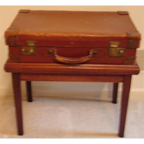 Circa 1900 Leather Suitcase Mounted on a New Hand Made mahogany stained custom stand. Several years ago we purchased 100's (hundreds) of leather suitcases from a chain of ladies clothing stores that they used as decoration in all of their stores. We sold many of the suitcases by themselves and after a while we foung a very skilled carpenter who hand made about 20 Custom Stands fitted fore the suitcases.