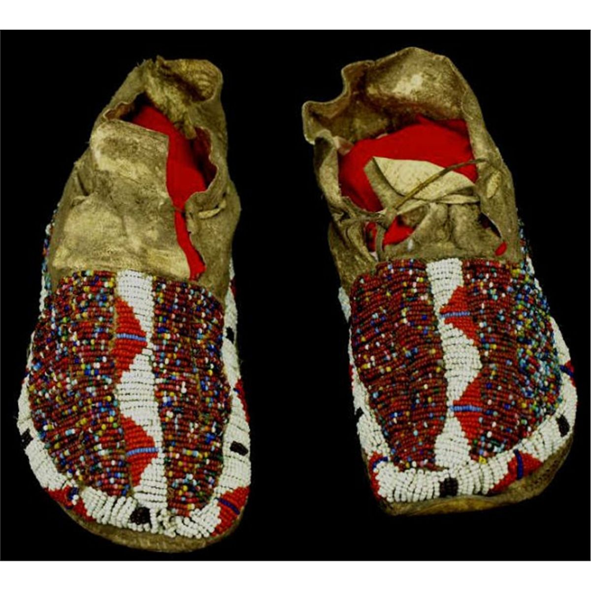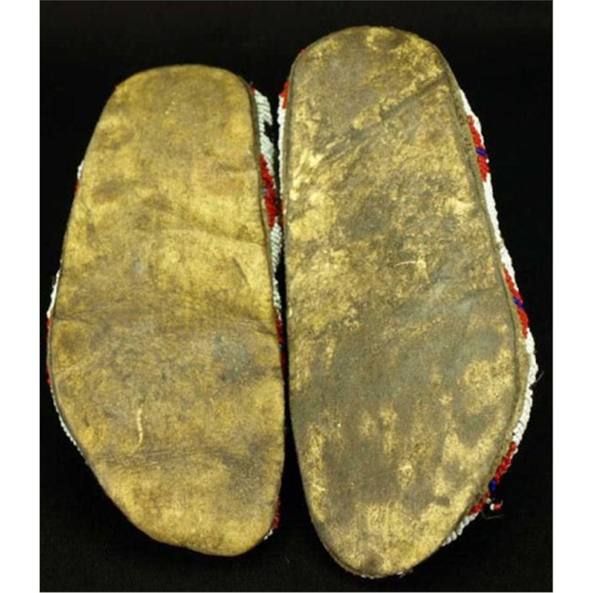 C. 1900 Sioux fully beaded moccasins salt and pepper with beaded border, 8 1/2" long.