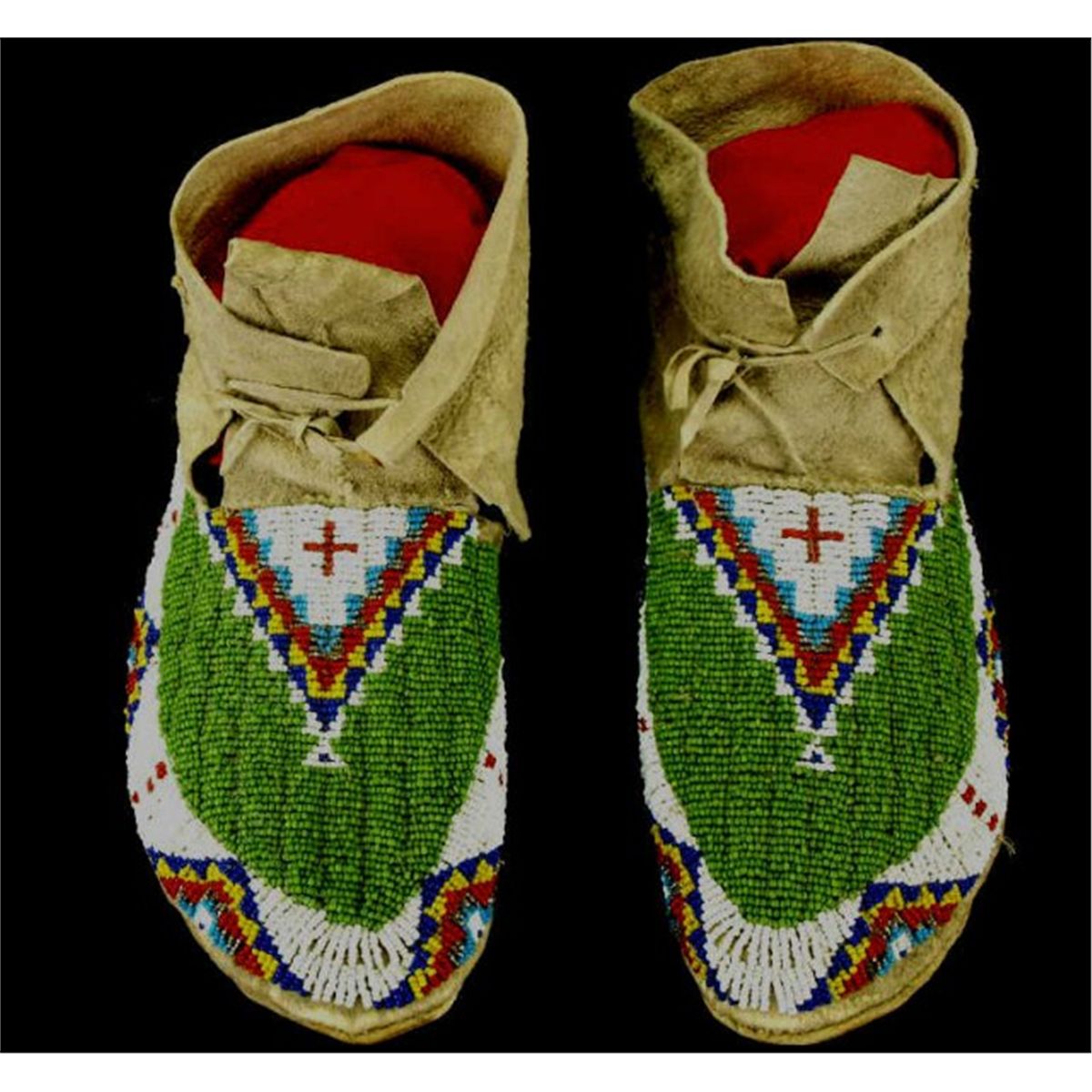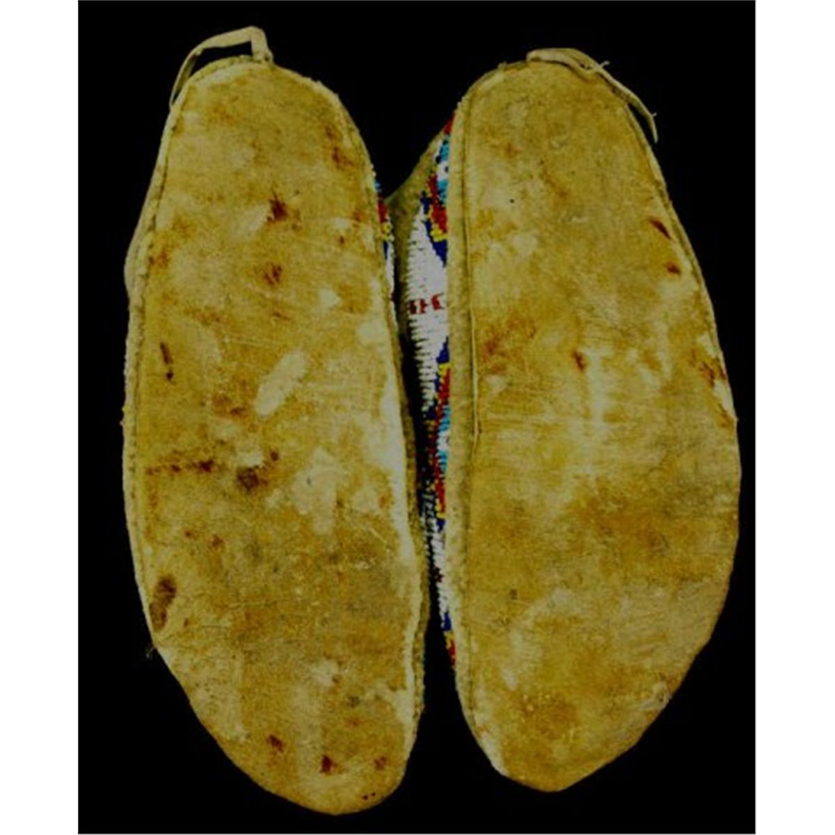 C. 1900 Sioux moccasins collected by Dick Wessert of Martin SD. in 1920, hung in Wesserts Hardware. Moccasins remain very good, hard sole bottoms, strings attached, 9 1/2" long.