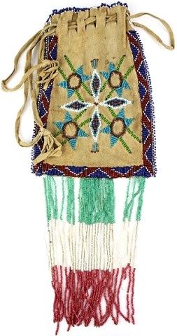 soft native tanned leather, 8 1/2" without fringe, 15" overall. Fringe with white centered reds, overall good condition with some loss to fringe otherwise near fine. Est. 300-600
