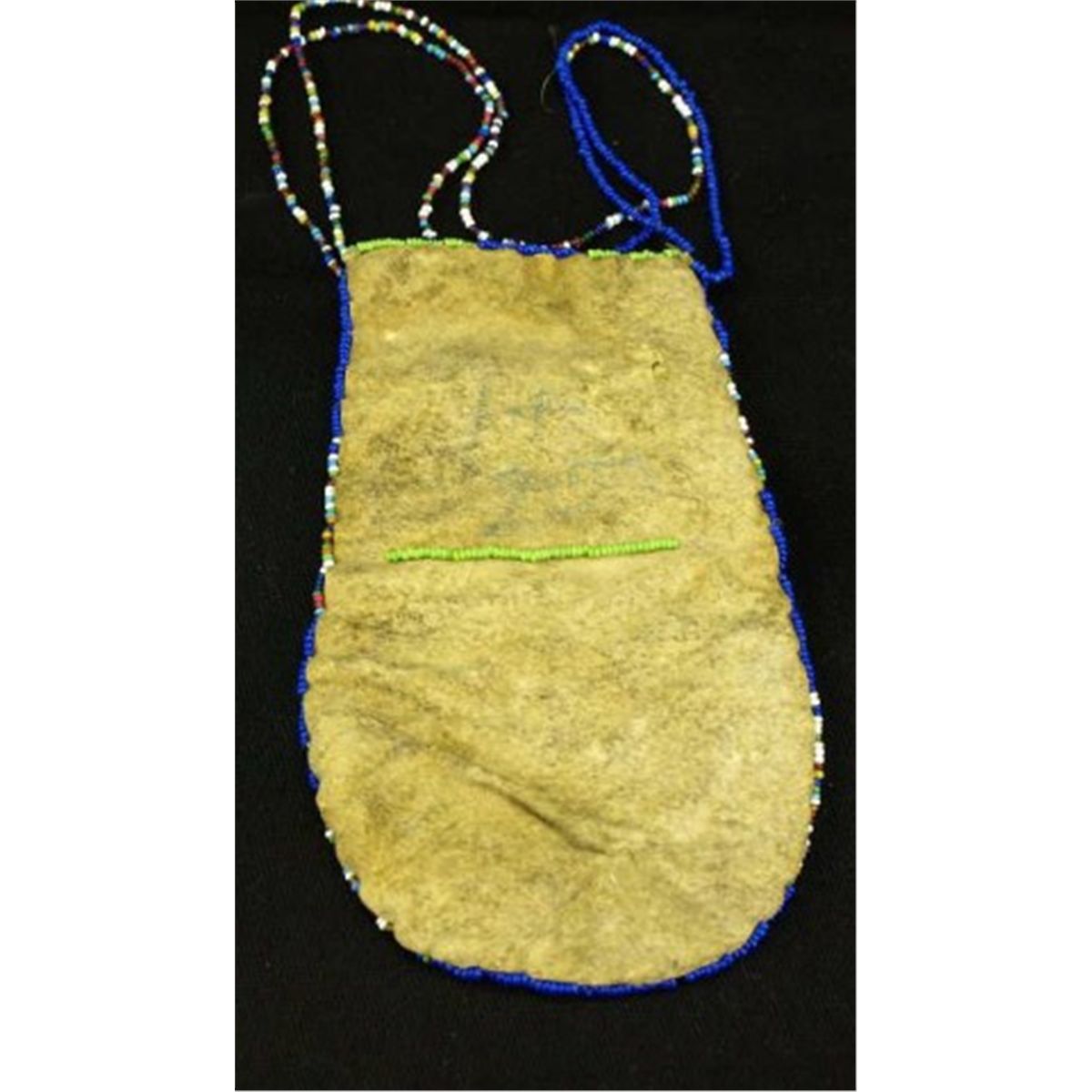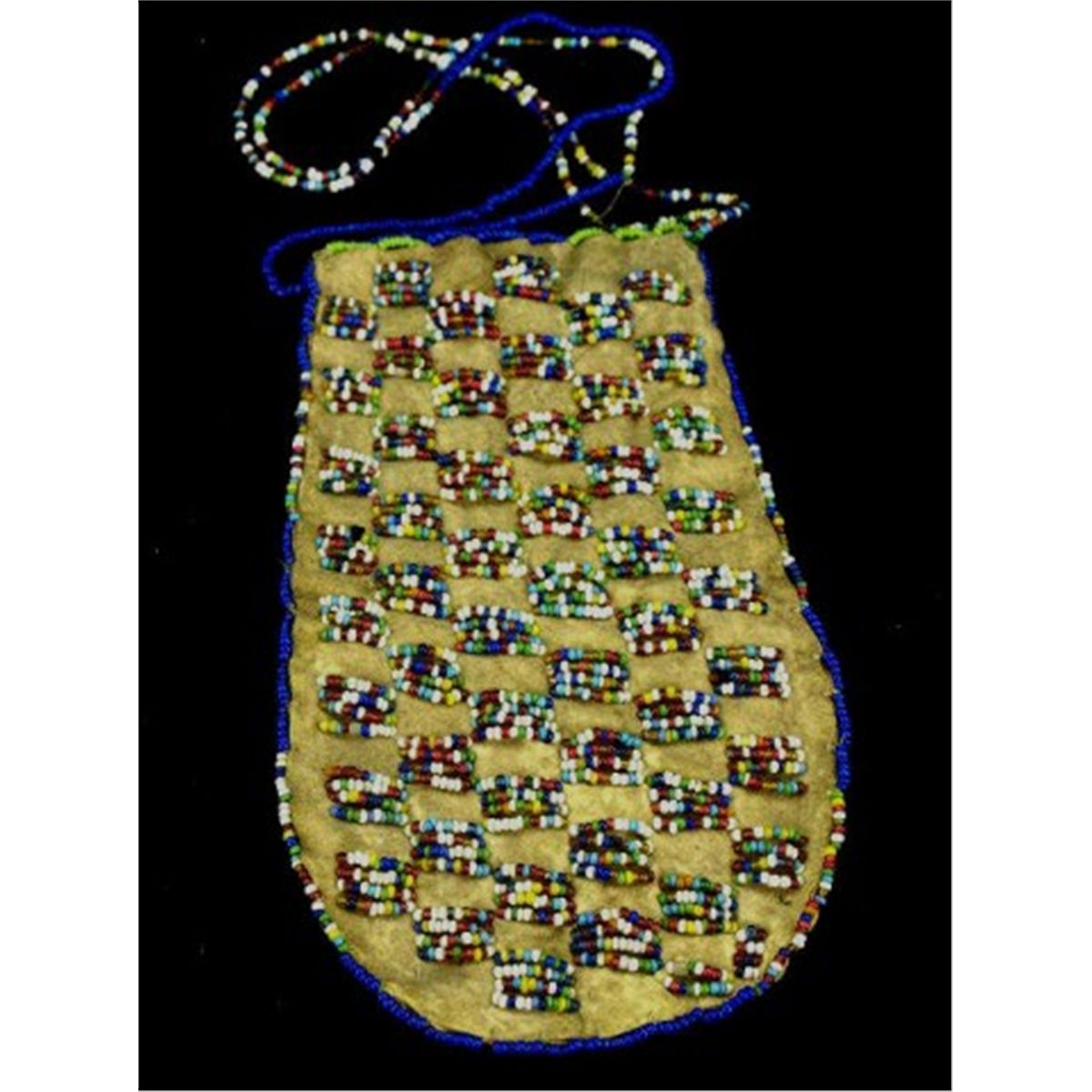 C. 1900's Sioux bag with beaded checker board design to front, single line row of beads to back, 6 1/4" long.