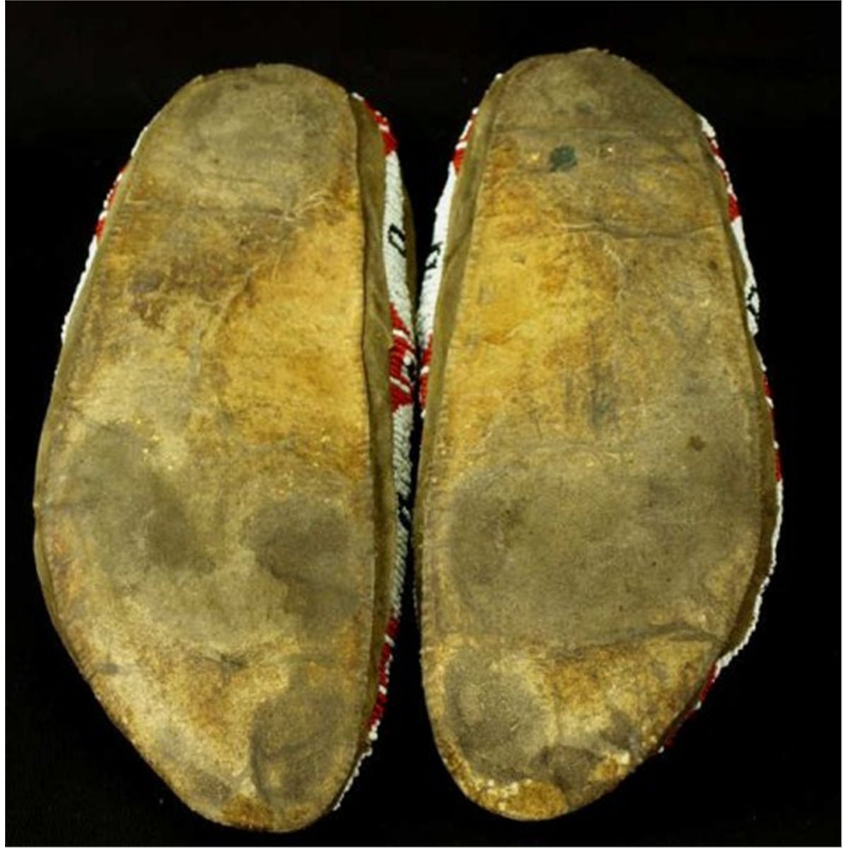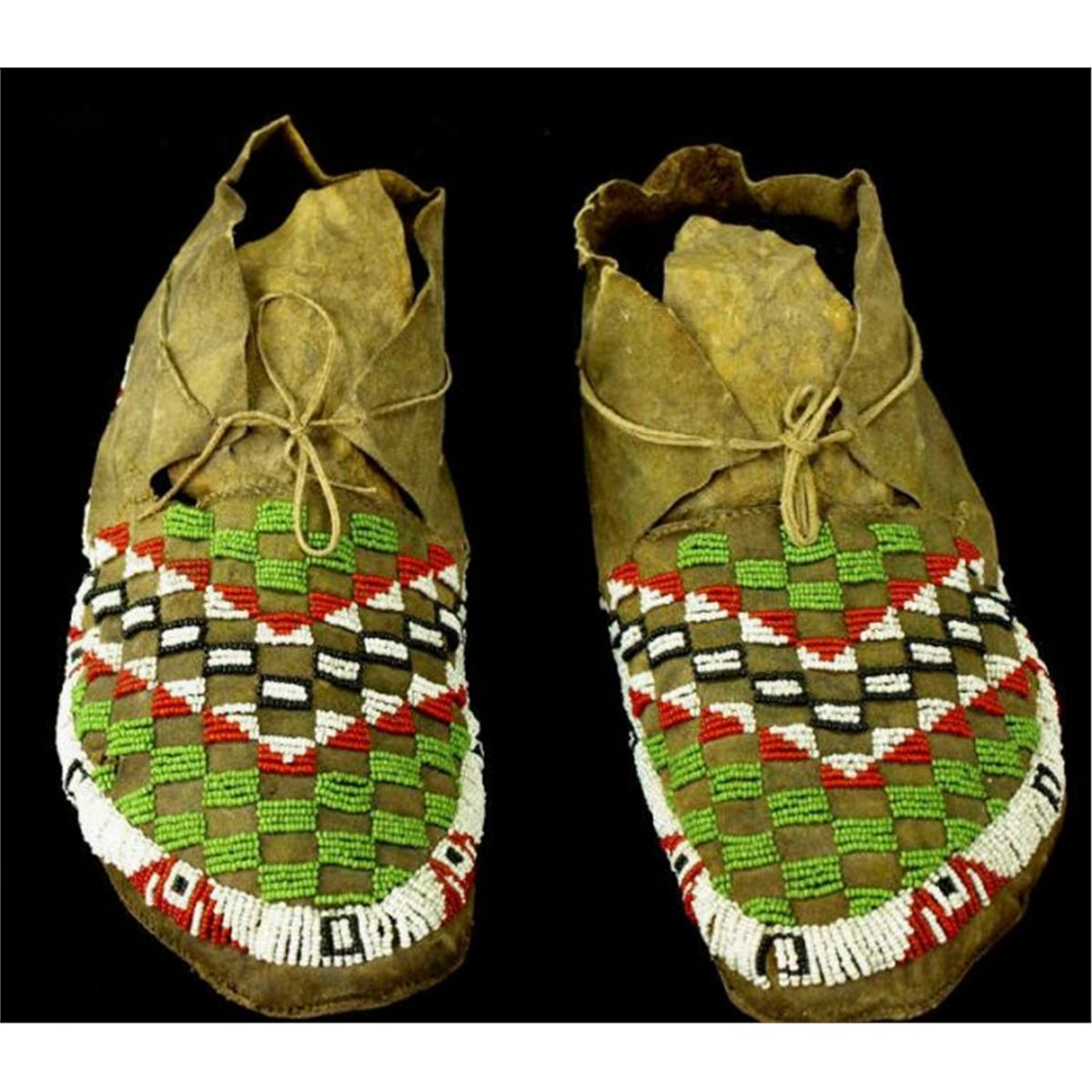 C. 1900's Sioux moccasins buffalo paunch pattern, hard soles, beadwork in green, red white heart, white and black. Leather somewhat stiff, 10 1/2" long.