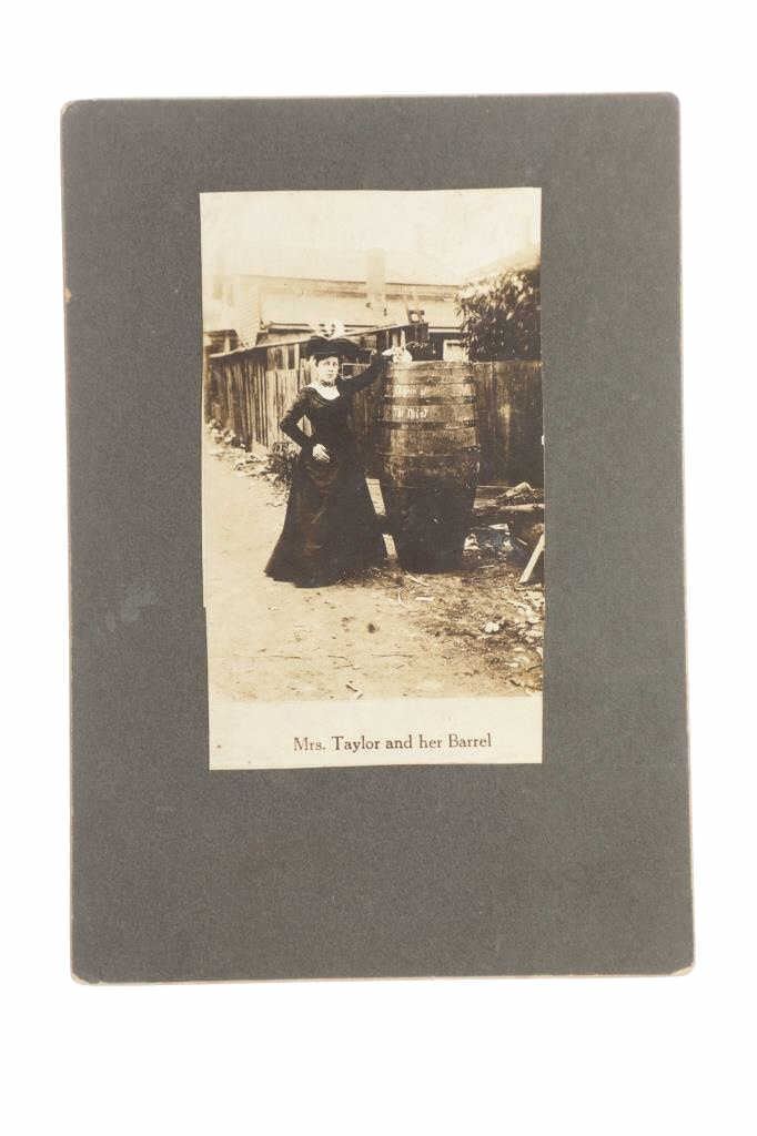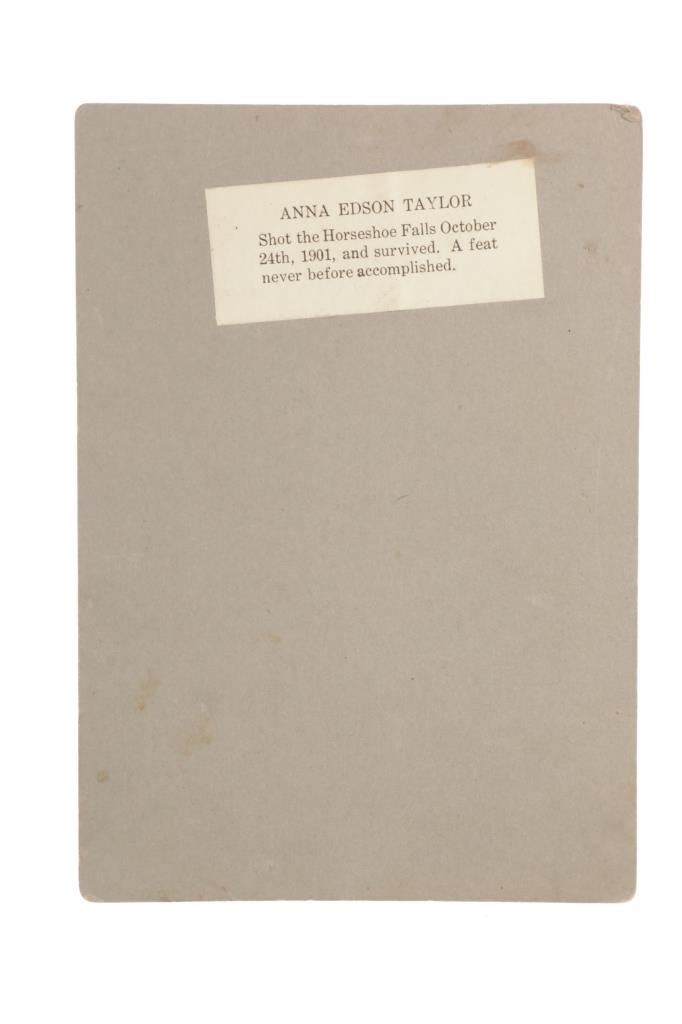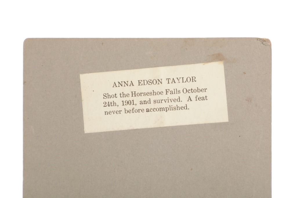 Offered in this lot is a cabinet card original photograph of Annie Edson Taylor in circa 1901 with the barrel she rode over Niagara Falls with. Annie Edson Taylor (October 24, 1838 – April 29, 1921) was an American schoolteacher who, on her 63rd birthday, October 24, 1901, became the first person to survive a trip over Niagara Falls in a barrel. Her motives were financial but she never made much money from her adventure. This card shows Anna Edson Taylor next to the barrel she went over the falls in, and the cat that went over the falls in the barrel the day before her. This photograph is mounted on a board that measures 7 1/4' x 5". Below the photo is typed "Mrs Taylor and her Barrel". On the back of the card is a piece of paper that reads "ANNA EDSON TAYLOR Shot the Horseshoe Falls October 24th, 1901 and survived. A feat never before accomplished." . This cabinet card is in good shape with minor damage given its age.