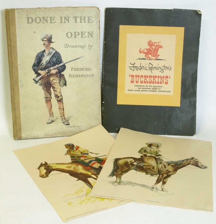 Remington" hard bound book printed by Colliers. Book shows separating to the binding. Also included is "Frederic Remington's Buckskins 8 Portraits of the Old West" 1956, by Penn Prints, NY.