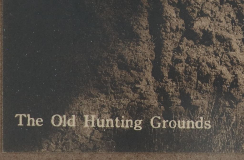Featured in this lot is a silver gelatin photograph called "The Old Hunting Grounds," circa 1900-1910 by notable American photographer, Charles Carpenter, who was born in 1869 and died in 1949. This photograph is wonderfully and professionally crafted in a sepia toned silver gelatin photograph with applied color of a mounted Plains Indian on a hillside looking out over the valley. The photographer's signature is shown in the bottom right hand corner along with the title of the piece in the bottom left hand corner "The Old Hunting Grounds." Charles Carpenter (1869-1949) worked as the photographer for Chicago's Field Museum between 1899 and 1947. During his time there, he participated in several excursions. His last trip sent him to the St. Louis World's Fair (1904) where he produced 3000 negatives of American Indians. The condition of this framed Silver Gelatin photograph shows a well preserved stature with some slight wear to the corners of the frame but otherwise shows no obvious signs of damage. The measurements of this framed photograph are 11 7/8" x 14" and the visible photograph measures 7 1/2" x 9 3/8".*