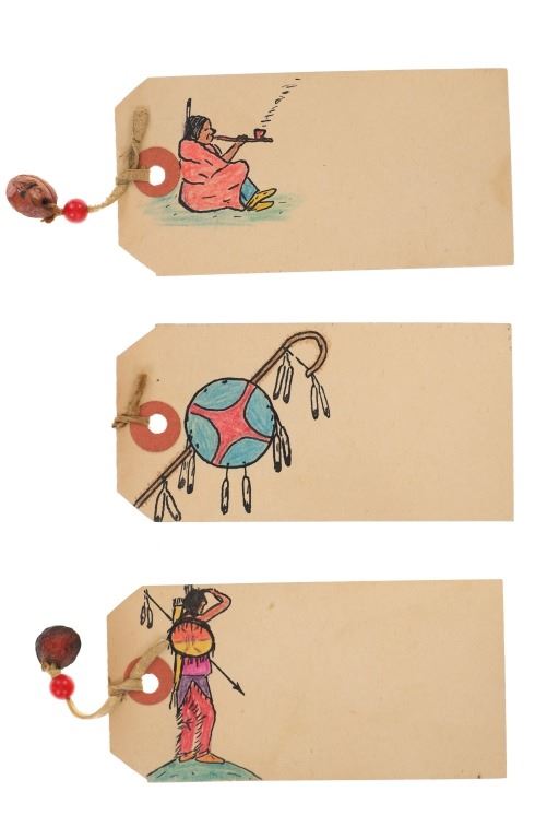 The lot features three original circa 1910-1940’s Sioux Ledger Art tag from the Duhamel Trading Post in Rapid City, South Dakota. The tags were done by the Sioux from the Pine Ridge and Rosebud Indian Reservations. The Duhamel Trading Post was established in Rapid City, South Dakota in 1907 by Pete Duhamel, born in 1839 in Canada and moved to Rapid City, Dakota Territory in 1879. A digital photograph is shown in the description of the inside of Duhamel Trading Post with the walls lined with Indian wares such as Indian blankets, rugs, sculpture, beadwork, leather goods and more. The lot shows three original tags, all of which made by and marked Dennison Manufacture Company, established in 1844. The tags likely date to circa 1910-1920’s. Each tag has Indian tanned hide ties, two of which have wound glass trade beads and painted shell or nut beads. The tags have original Ledger Art drawings, one showing a Sioux Warrior looking out from a hill top with shield and arrow quiver on his back and holding a lance spear in war regalia. Next shows a Sioux man smoking a peace pipe. Lastly shows a Sioux War Shield polychrome painted with feathers and in front of a Coup stick. Rare original pieces. From the Duhamel Trading Post and Pine Ridge Indian Reservation from the Sioux circa 1910-1940’s. Each tag without fringes is 4.25” by 2 1/8” with an additional 1.5”L fringe.
