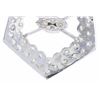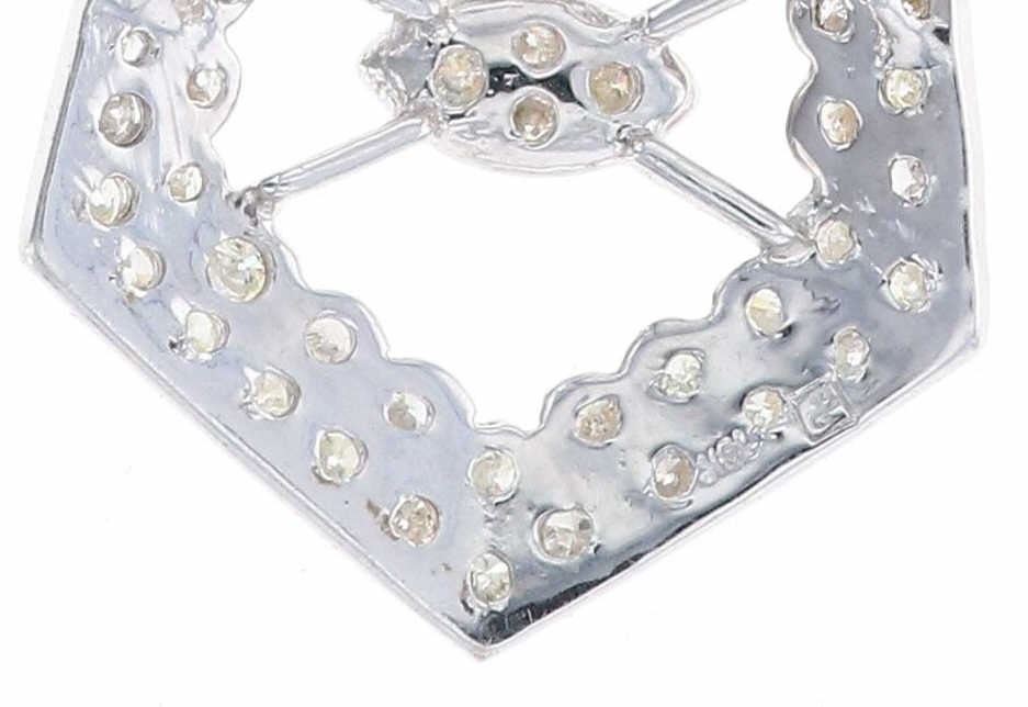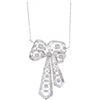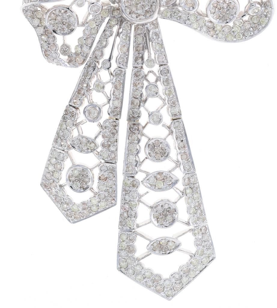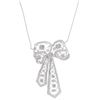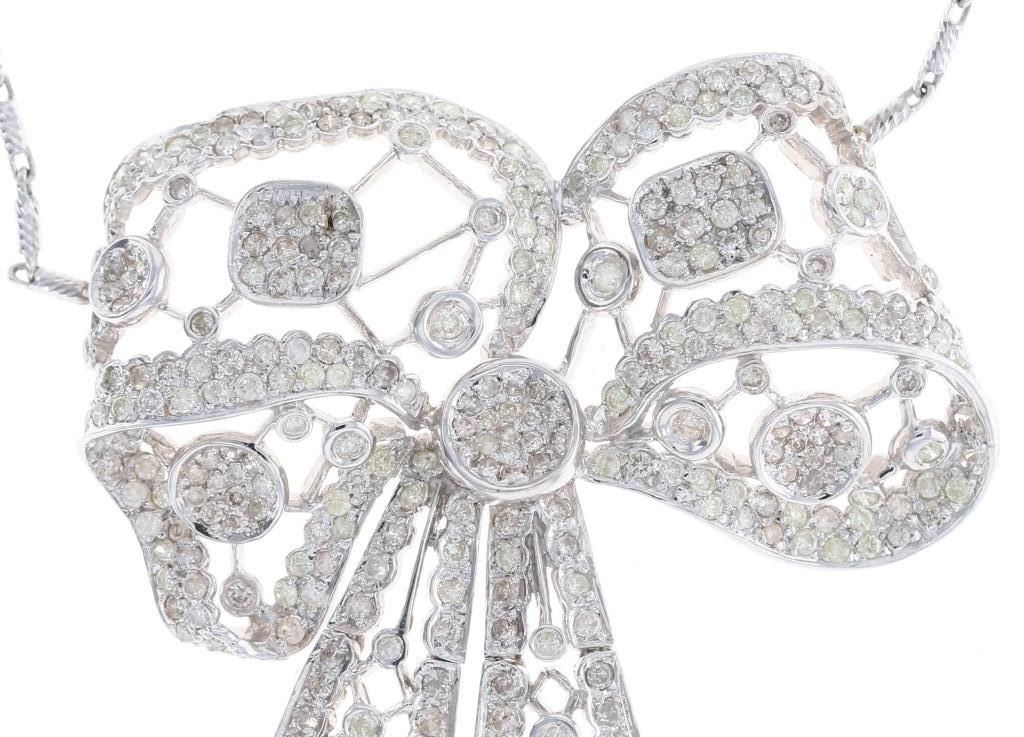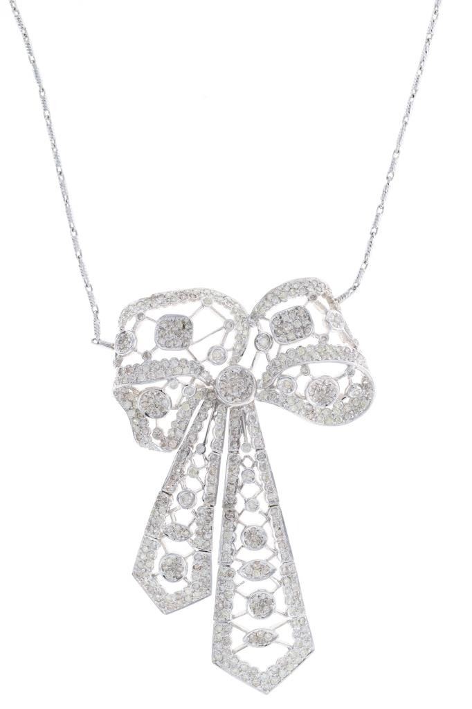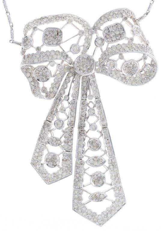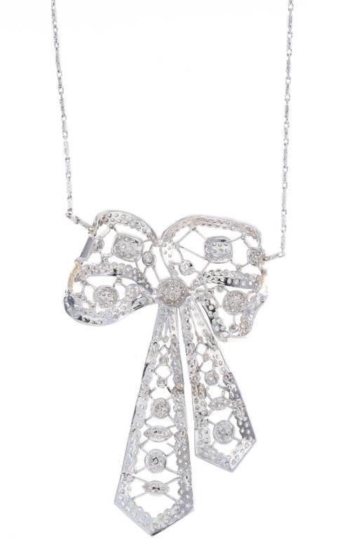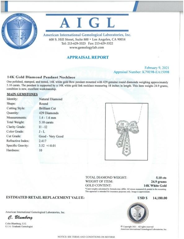 This is an astounding Edwardian style 18K white gold Bow Lavallière necklace set with natural Diamonds dating to the early-to-mid-1900’s and comes with an AIGL gemology report and appraisal. The Edwardian era derives its name from the reign of the English King, Edward VII (1901-1910). Edwardian jewelry featured garlands, ribbons, laurel wreaths, tassels, lace and bow knots such as our piece nearly always done in white gold or platinum and set predominantly with Diamonds and sometimes accented by other stones such as peridot, aquamarine, pearl, opals, amongst others. This example shows a freeform bow knot lavalliere necklace pendant with negligee like uneven bow ends with scalloped and filigree leading to a center of round and marque shaped settings flowing into a circle knot which then radiates the two bow ties which are further accented by a delicate design of scalloped edge, filigree and circle and curved corner square settings. The American Estate necklace pendant is set with 429 natural Diamonds with a total weight 5.10 carats, clarity of I1-I2 and color of J-L. The bow ends themselves have joints with a slight articulation and is stamped “18K”. The necklace is set with a contemporary 14K white gold etched chain link necklace strand which is in very good new condition. The pendant itself is in good condition with no damages and appears to be very well preserved. Comes with an AIGL (American International Gemological Laboratories, INC.) gemology report and appraisal which confirms the above info and gives an estimated value of $14,180.00 and weight of 24.9 grams (K79E98-EA15098), see the pictures for a copy of the report.