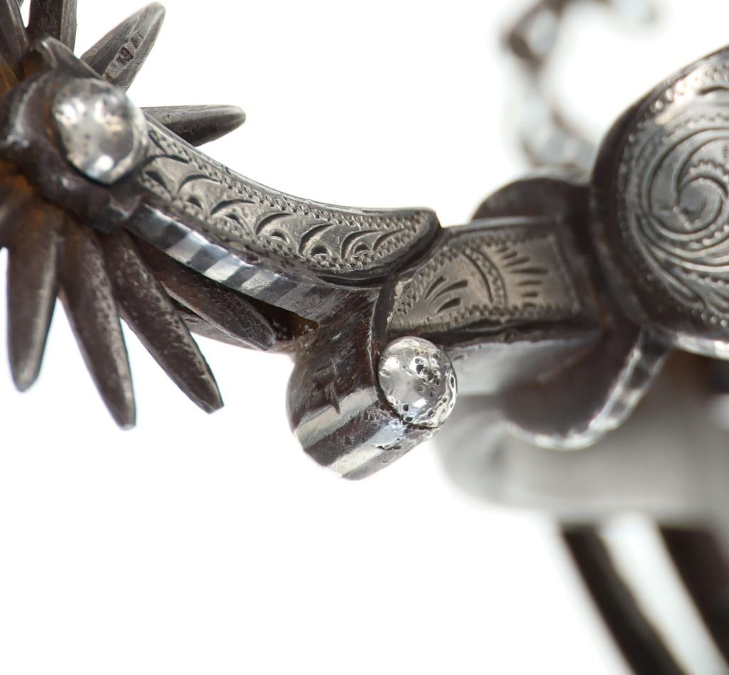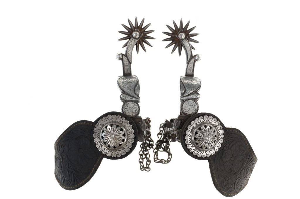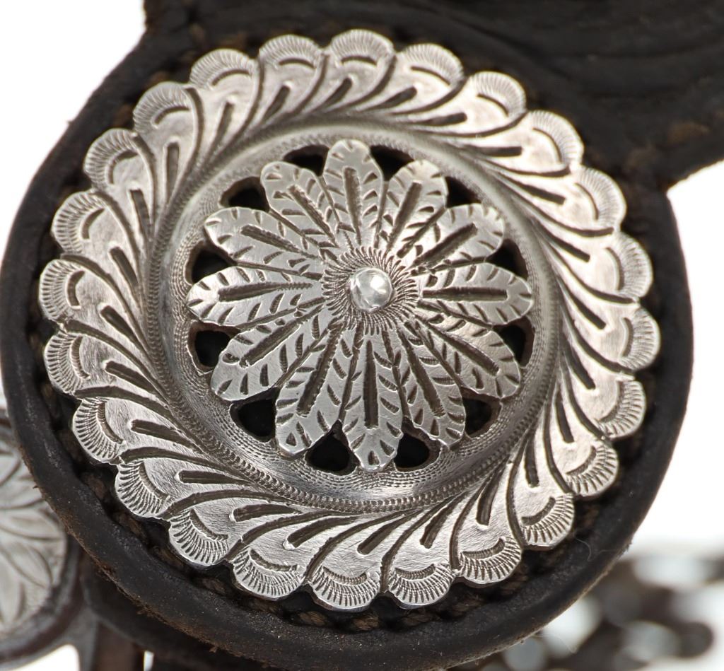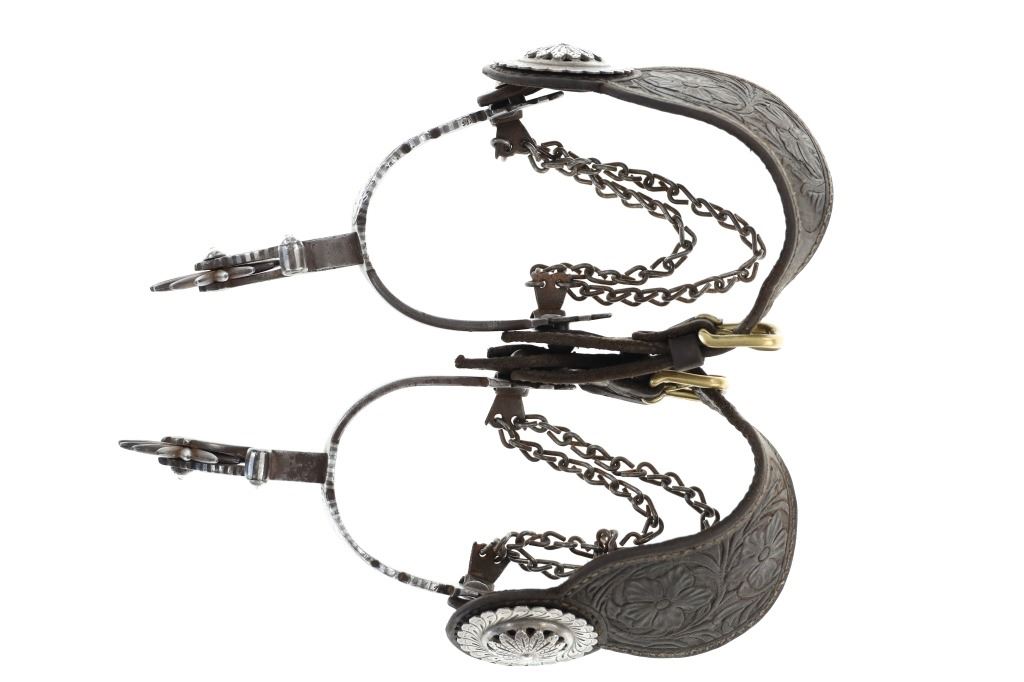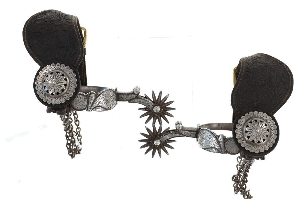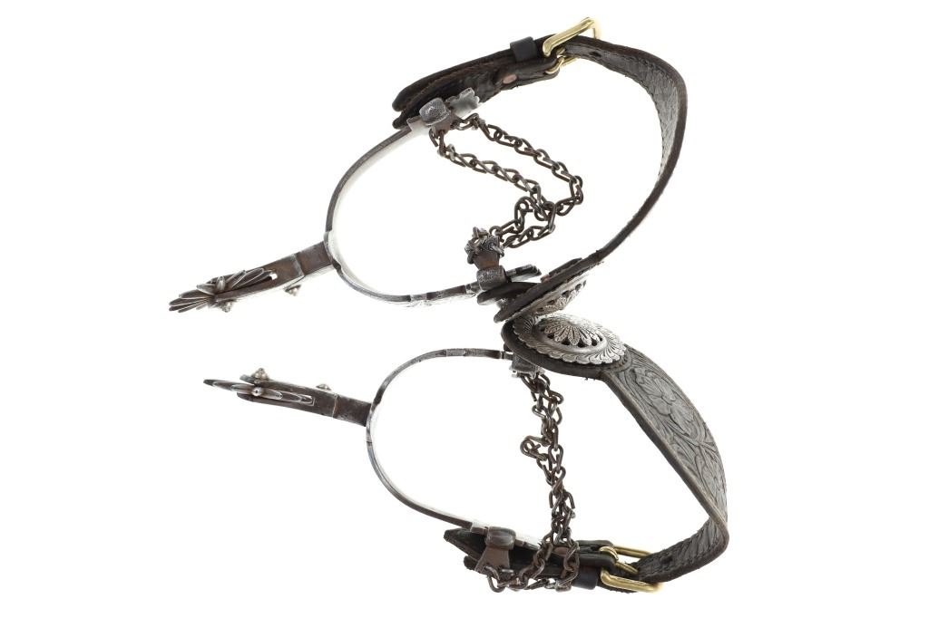 This is an original set of Jesus M. Tapia (1856-1931) circa 1910 silver mounted spurs with Jesus M. Tapia tooled three-piece leather straps with domed engraved and filigree silver conchos, the spurs and strap concho feature the trademark Tapia raised concho with nipples. J. Tapia is considered the Holy Grail of California spur makers with this being an amazing set from a renowned Pacific Northwestern collection. Jesus M. Tapia (1856 - 1931) spurs and bits are the most coveted and valued of the early California makers and was renowned for the elegance and grace of his pieces which frequently included very stylized iron work, tendrils and the elegant and artistry of filigree. Tapia’s work was seldom marked but his style and quality were so distinctive that a knowledgeable California spur and bit collector will have little trouble identifying the few pieces that come to the market. The set shows many telltale Tapia characteristics including the nesting bird design at the base of each heel-band, raised concho with nipples, 14-point spoked rowels. The drop shank spur shows the silver mounting with amazing hand engraving, vaquero style double heel-chains and having two raised concho spots on the shank both with the trademark Tapia nipples, one of the most unique and identifiable attributes of authentic Jesus M. Tapia spurs. The three-piece carved and tooled leather heel straps each have a classic Tapia large silver concho which is domed having a scalloped edge and fine engraving with a the rare Tapia filigree cutout work as well as the trademark Tapia nipple atop the concho. Tapia spurs are truly the most collected California maker with examples selling over $100,000 at auction. One of very few known Tapia’s with the filigree the raised nipple concho on the spur and raised nipple concho on the spur strap. Each spur is about 10.5"L with heel strap by 5"W with leather heel strap as well. Rowels are each about 2 1/16 inches in diameter. Heel strap is about 12"L along the outside and the concho is 2 1/8" in diameter.