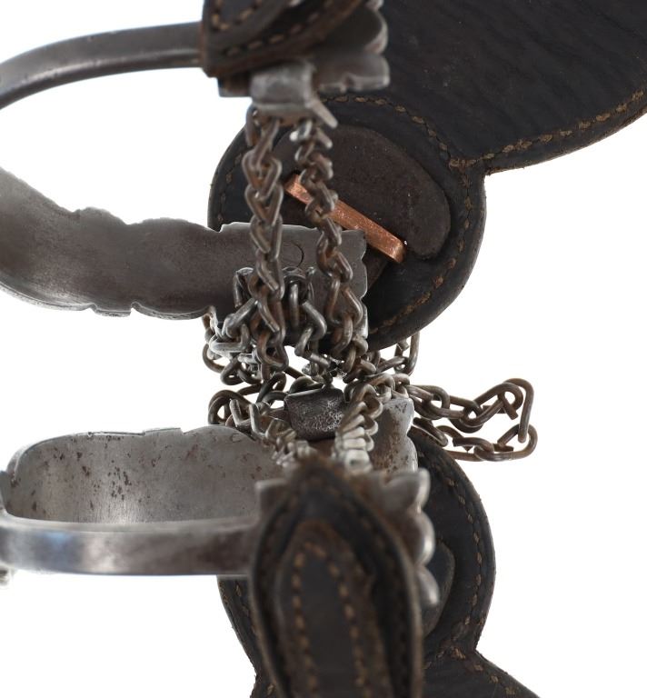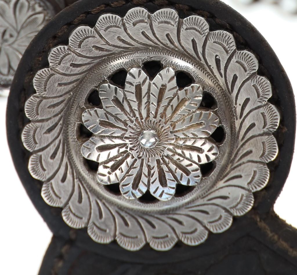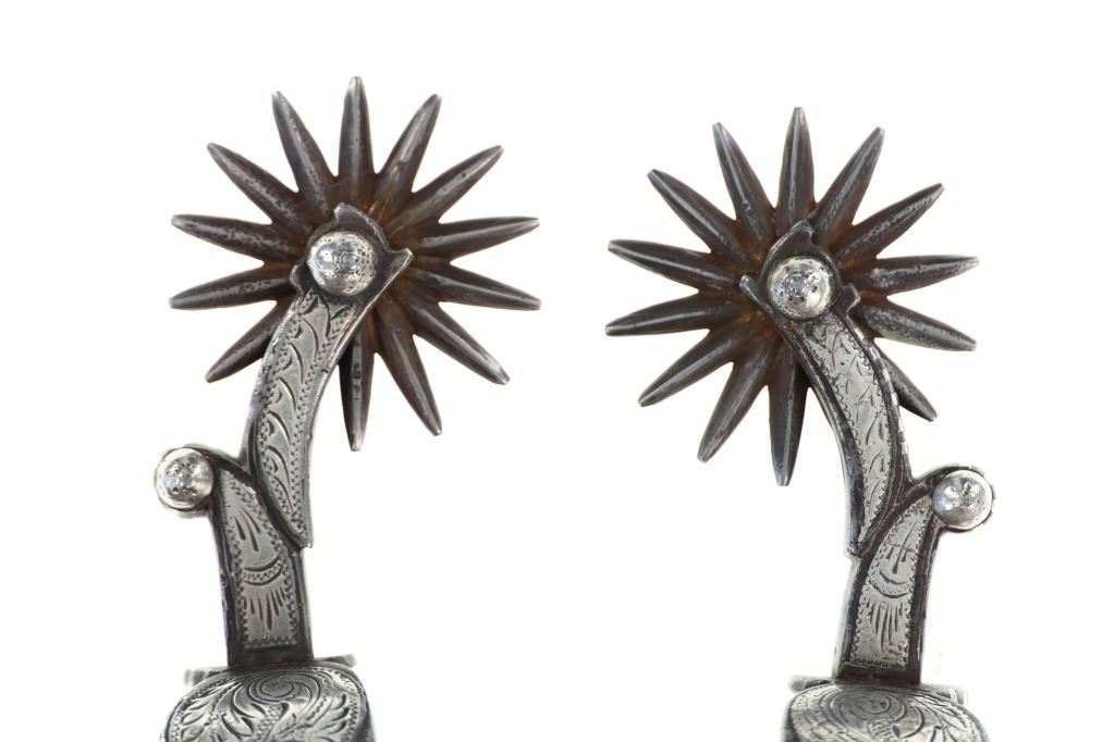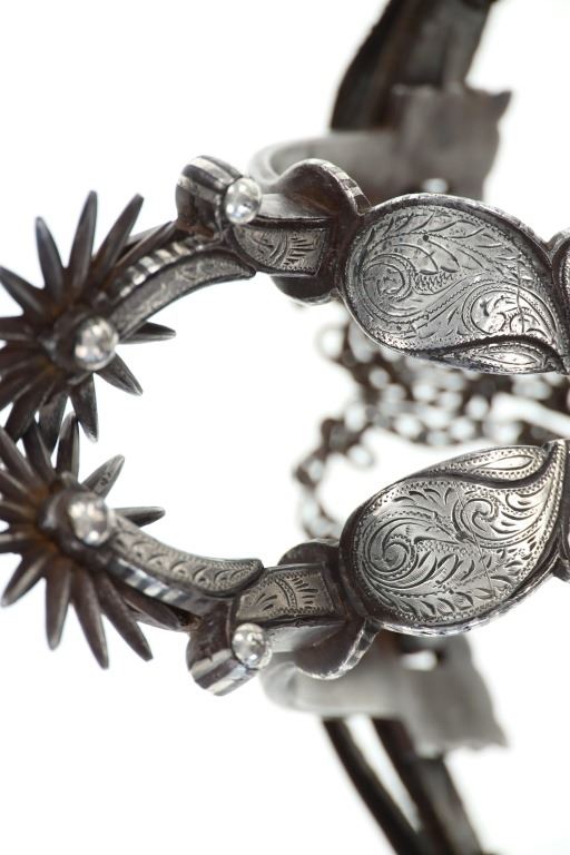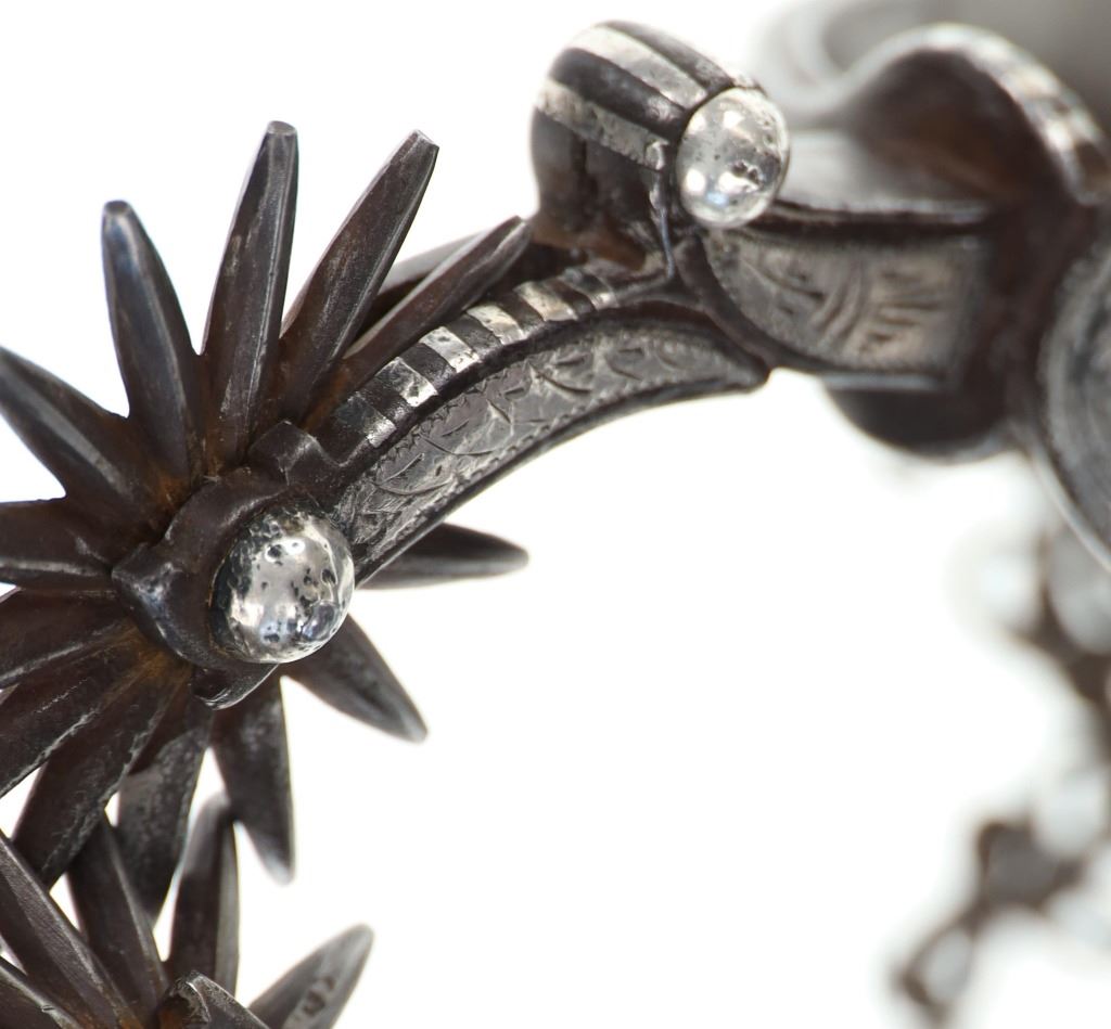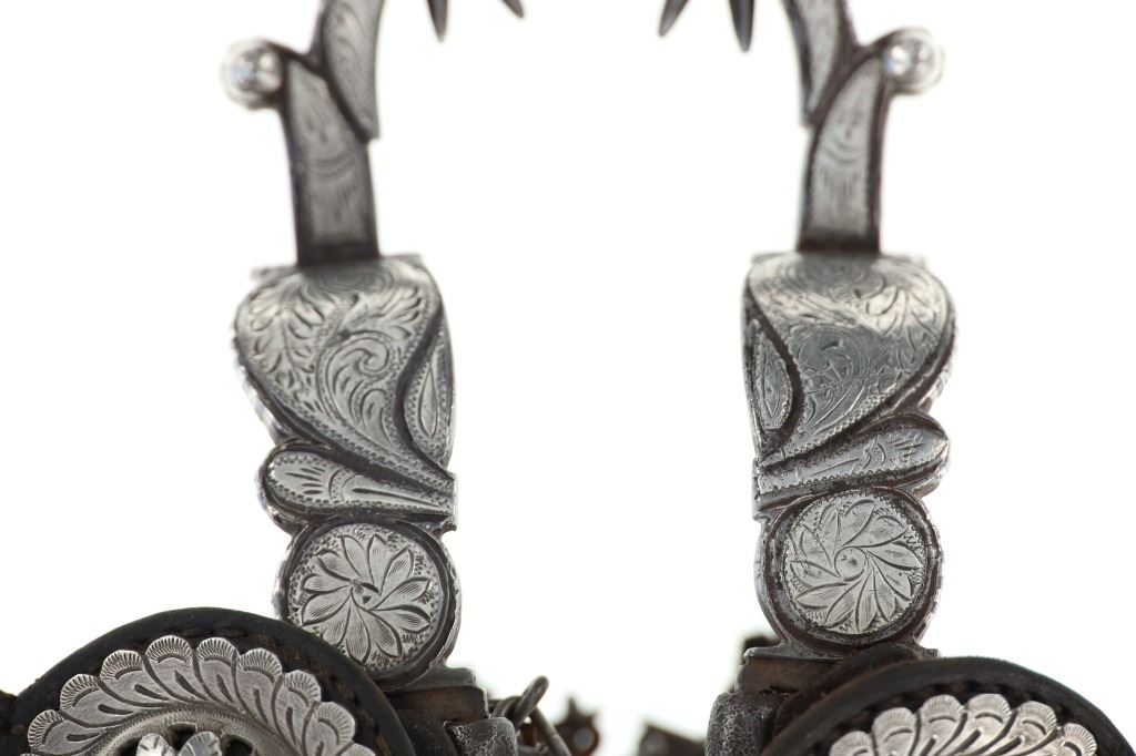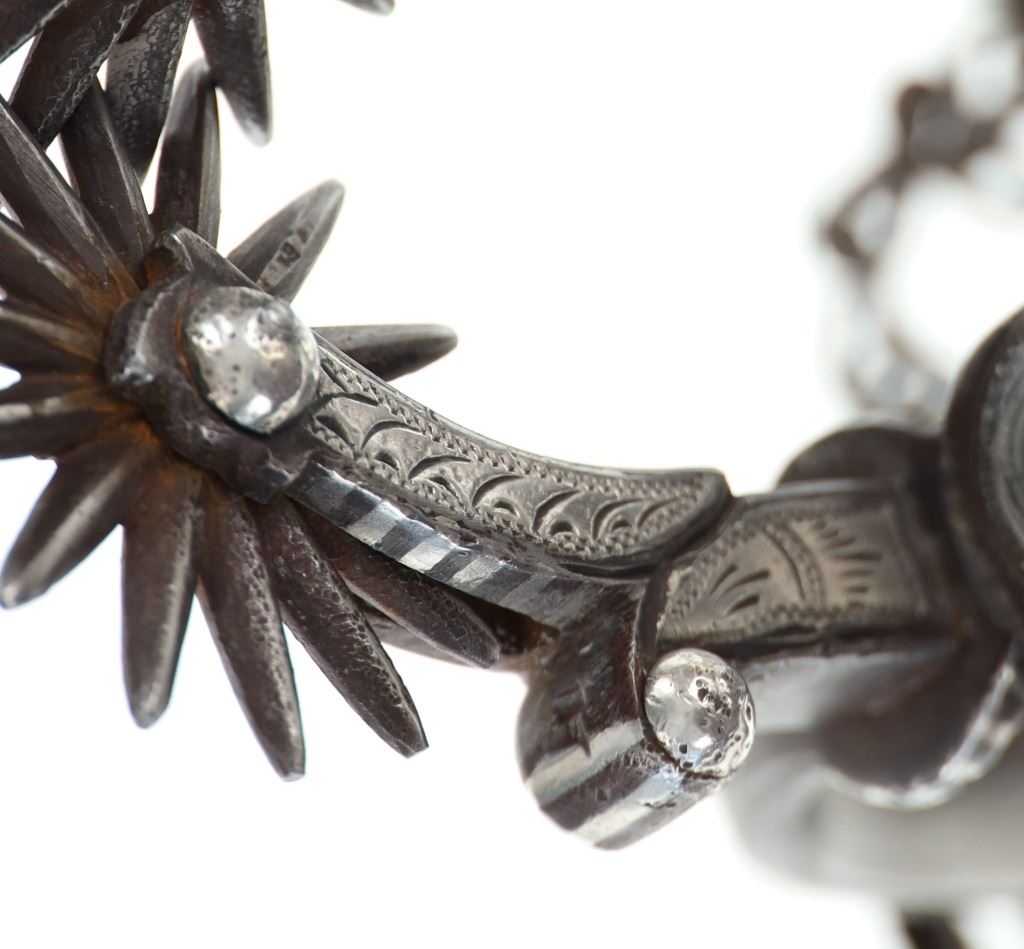 This is an original set of Jesus M. Tapia (1856-1931) circa 1910 silver mounted spurs with Jesus M. Tapia tooled three-piece leather straps with domed engraved and filigree silver conchos, the spurs and strap concho feature the trademark Tapia raised concho with nipples. J. Tapia is considered the Holy Grail of California spur makers with this being an amazing set from a renowned Pacific Northwestern collection. Jesus M. Tapia (1856 - 1931) spurs and bits are the most coveted and valued of the early California makers and was renowned for the elegance and grace of his pieces which frequently included very stylized iron work, tendrils and the elegant and artistry of filigree. Tapia’s work was seldom marked but his style and quality were so distinctive that a knowledgeable California spur and bit collector will have little trouble identifying the few pieces that come to the market. The set shows many telltale Tapia characteristics including the nesting bird design at the base of each heel-band, raised concho with nipples, 14-point spoked rowels. The drop shank spur shows the silver mounting with amazing hand engraving, vaquero style double heel-chains and having two raised concho spots on the shank both with the trademark Tapia nipples, one of the most unique and identifiable attributes of authentic Jesus M. Tapia spurs. The three-piece carved and tooled leather heel straps each have a classic Tapia large silver concho which is domed having a scalloped edge and fine engraving with a the rare Tapia filigree cutout work as well as the trademark Tapia nipple atop the concho. Tapia spurs are truly the most collected California maker with examples selling over $100,000 at auction. One of very few known Tapia’s with the filigree the raised nipple concho on the spur and raised nipple concho on the spur strap. Each spur is about 10.5"L with heel strap by 5"W with leather heel strap as well. Rowels are each about 2 1/16 inches in diameter. Heel strap is about 12"L along the outside and the concho is 2 1/8" in diameter.