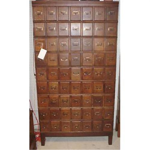 Super quarter sawn oak card catalogue with 63 drawers, circa 1910. It consists of 11 different sections which retain all their original hardware. Recently refinished in a beautiful, mellow rich stateman's oak color. Measurements are: 79" tall, 42" wide and 17" deep. Interior drawers measure: 14 3/4" deep and 4 1/8" wide. All drawers have adjustable supports inside. Just the perfect item for your office. No excuses here; ready to go! Buyer to pay for shipping and insurance. Contact us for rate.