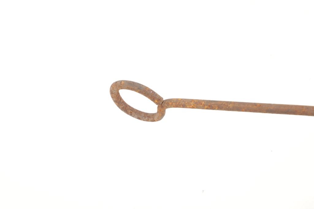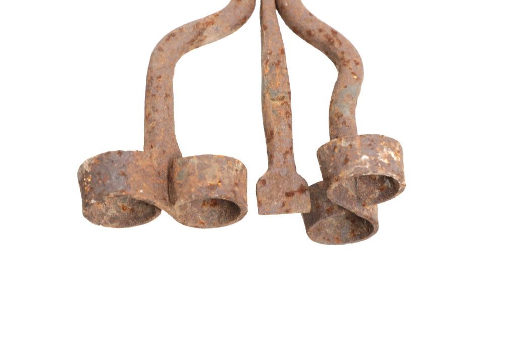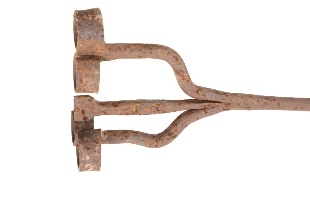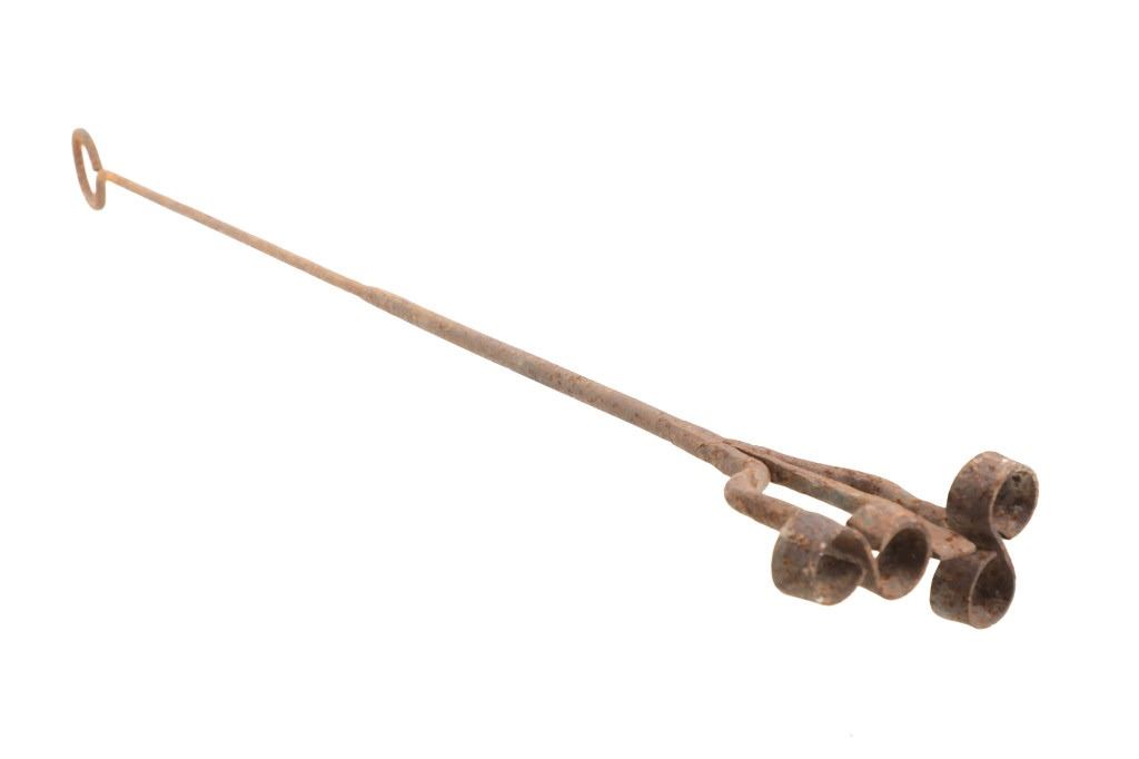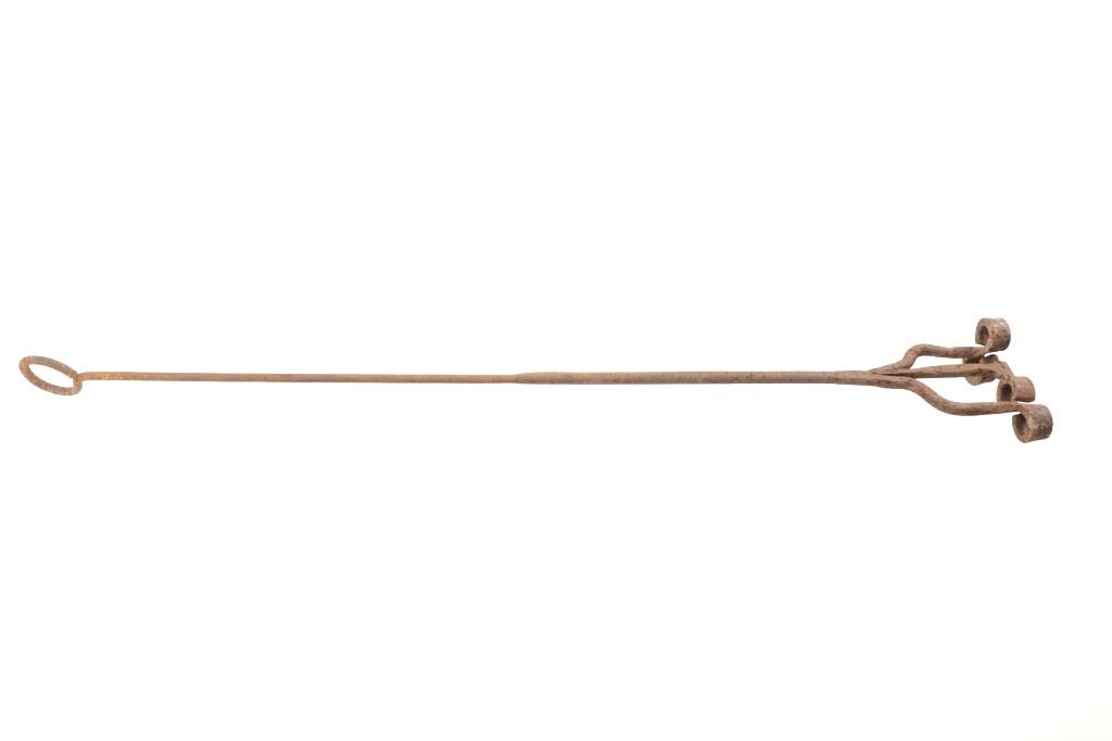 Featured in this lot is this 8 Bar 8 branding iron mid east Montana circa 1911-1920. The branding iron features blacksmith construction that shows a sucker rod construction with a triple split frame attached to the brand which shows an 8 with a bar and a horizontal 8. The brand and age was identified using the Montana State Library Montana History Portal registry and shows a reference number of '2418'. The condition of this branding iron is well preserved with oxidation due to the age of the branding iron but otherwise shows no obvious signs of damage. The measurements of this branding irons is 48 3/4" x 6 7/8" x 3 5/8". The collective weight of this branding iron is 4lb 6oz.
