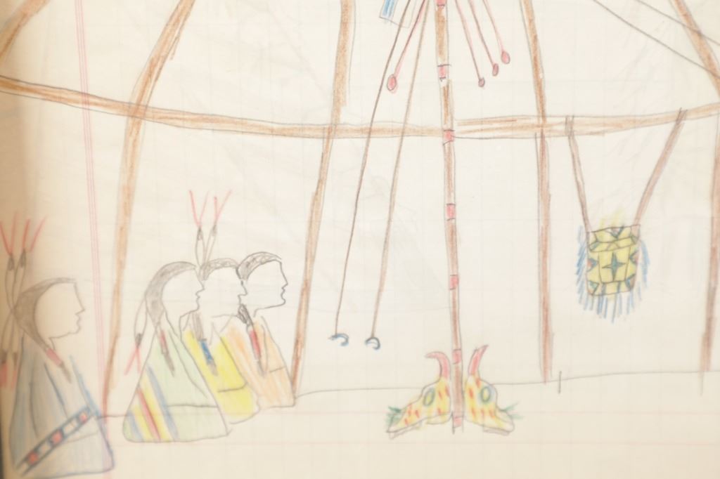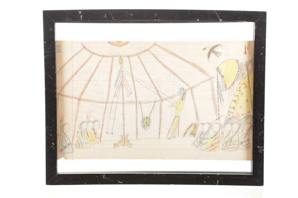 The lot features a double-sided original set of ledger drawings from the Northern Sioux of the rare Sun Dance dating to circa 1911-1940’s from the Robert Dickens Little Blue Hand collection. These ledger drawings are from the same ledger book collection offered and sold from our company back in 2013. The original ledger book would have been traded to the Northern Sioux and was said to be handed down from their ancestors at the Sioux Pine Ridge Indian Reservation and later traded to the collector many years ago back in the 1970-1980’s. The set ranging in age from circa 1890 on and is mostly believed to be drawn in circa 1920-1930’s. The ledger art shows an unmarked ledger accounting sheet, likely from Sam Lievine and shows the iconic Lakota Sun Dance. The first image shows the large lodge with the pole at the center having the main dancer attached to the pole with two hooks at his breast as he leans back, his elders and chief sit around him. There are painted buffalo skulls, a raven or eagle, beaded wearing blankets, full feathered headdresses, painted parfleche and more. The other side also shows the Sun Dance with a tipi lodge wonderfully painted having four warriors faces just peeking past watching the dancer in full regalia with a painted hide, war shirt, coup staff and more walking towards the Sun Dance pole with ropes and hooks attached. There are Ghost Dance imagery of four-point Morning Stars, Half Moons and the earth or sun. Truly a rare piece. The condition of this framed ledger art is good with very slight wear to the frame and some wear to the edges of the artwork but otherwise shows good well preserved condition. The measurements of this framed ledger art is 15” by 12.25" and the visible artwork measures 13 5/8”” by 8.5”.