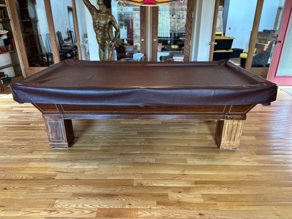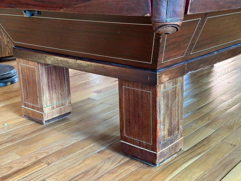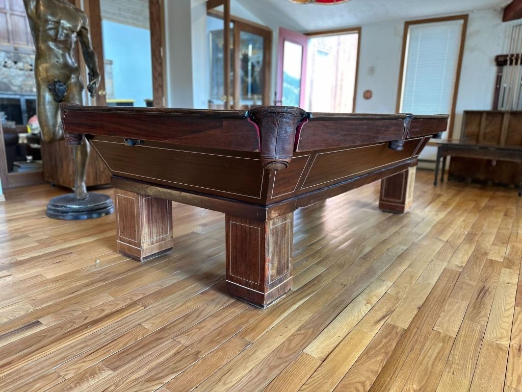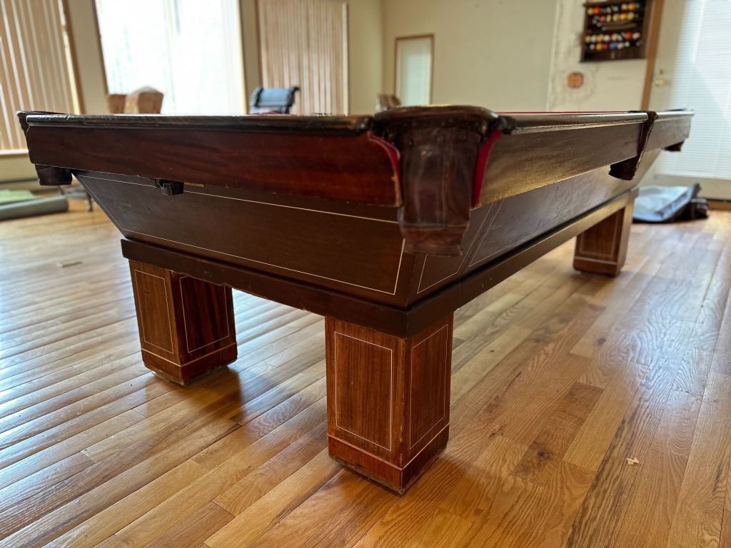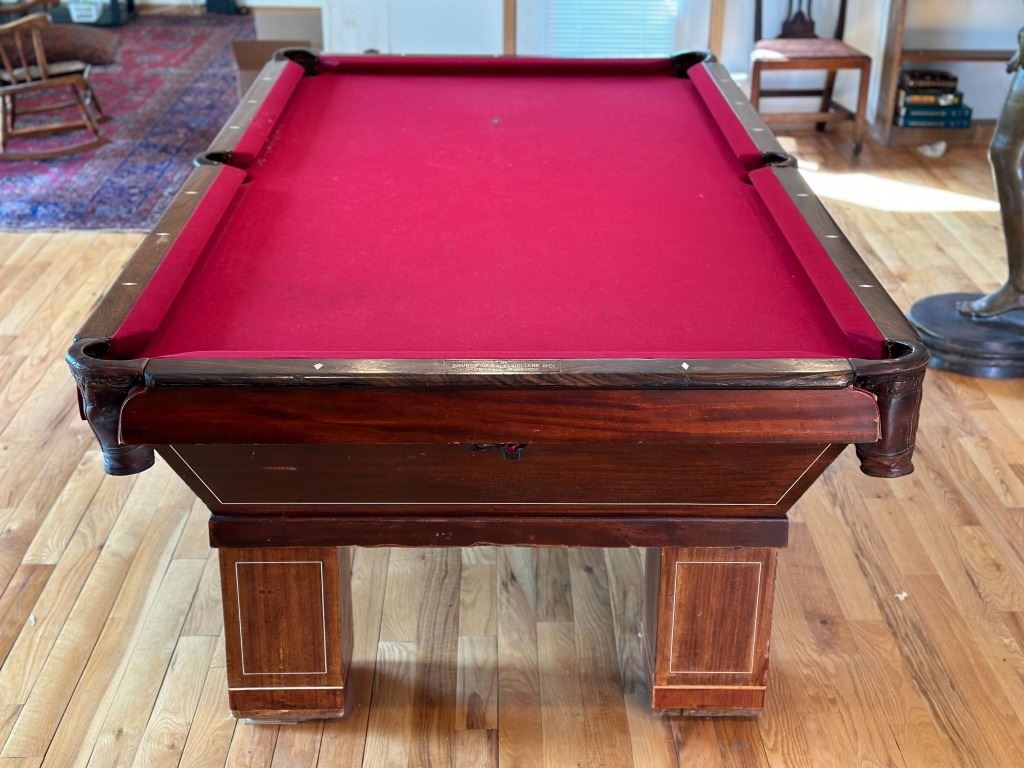 The lot features an original Brunswick-Balke-Collender pool table dating to circa 1912, in original condition. The pool table is either a Richelieu, Homewood, Coreno, or The Reno model. The table shows four large rectangular legs with a thin white line inlay matching the rectangular shape on all four sides of each leg. The sides are at an angle and show three inlaid sections at the long sides and a single inlaid section at each end. The top edge is squared off with heavy thick original leather pockets and a mother of pearl like inlaid diamonds along the top edge. Brunswick Balke Collender manufactured some of the finest large mercantile and gaming cabinets and tables. The top is inlaid with "The Brunswick-Balke-Collender Co. Monarch Cushions". The table shows cast iron original Brunswick swing out pool cue chalk holders on the end. One end shows the original gold label with the Patent dates with the last patent date being May 7, 1912. The table presumably has the original slate, but not confirmed. Nice condition for its historic age. The table has been professionally dissembled for easier transport and shipping.*