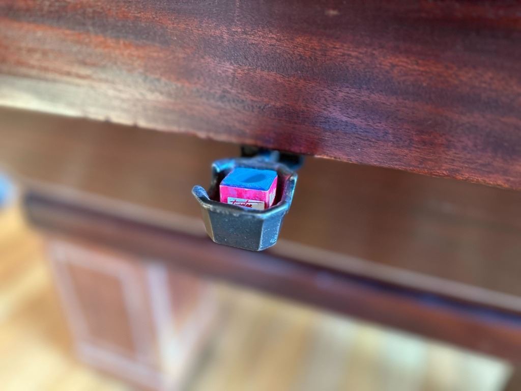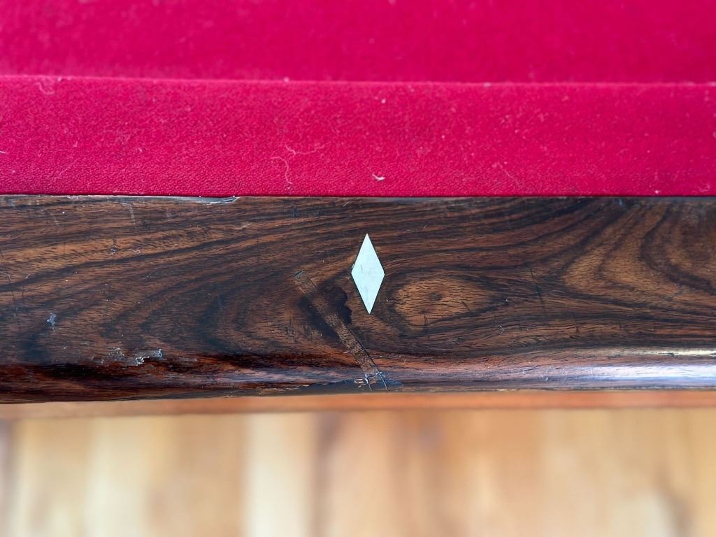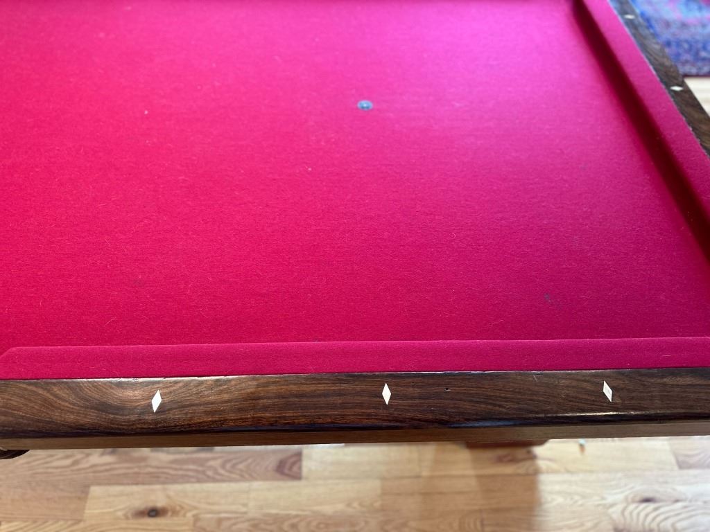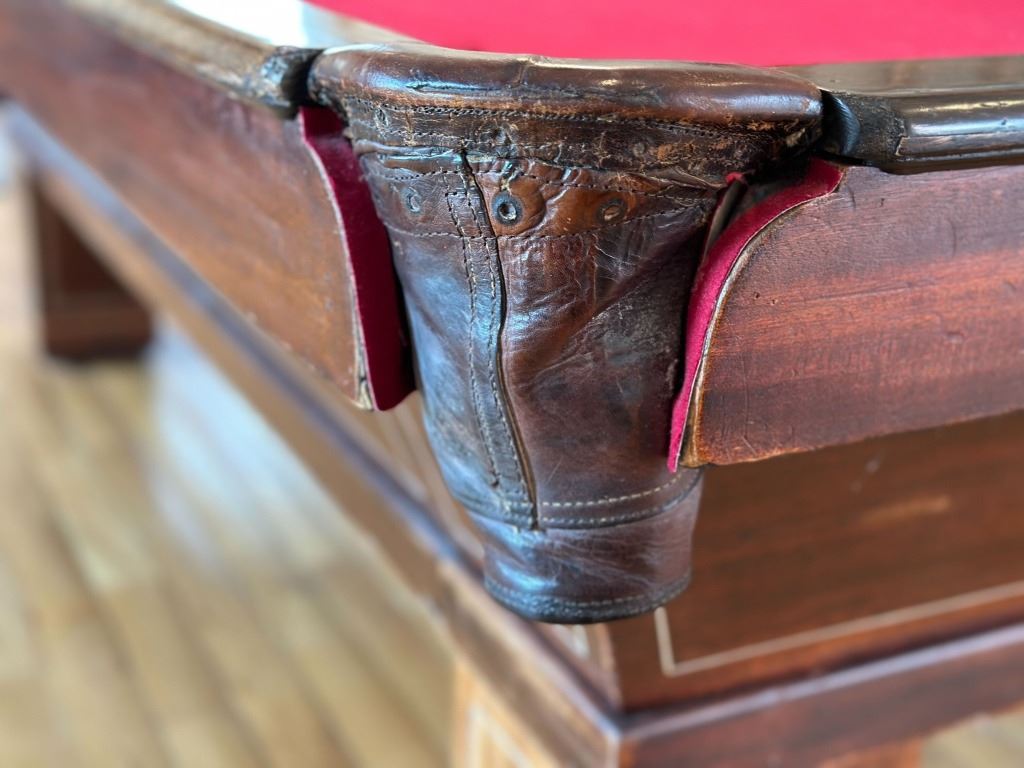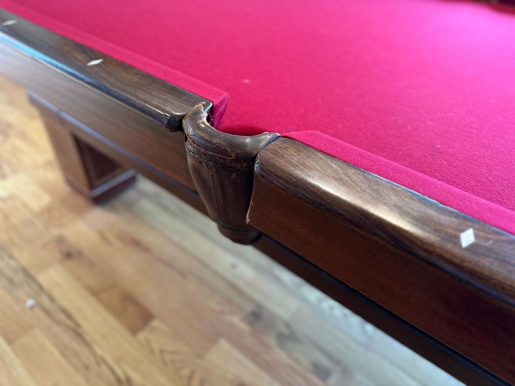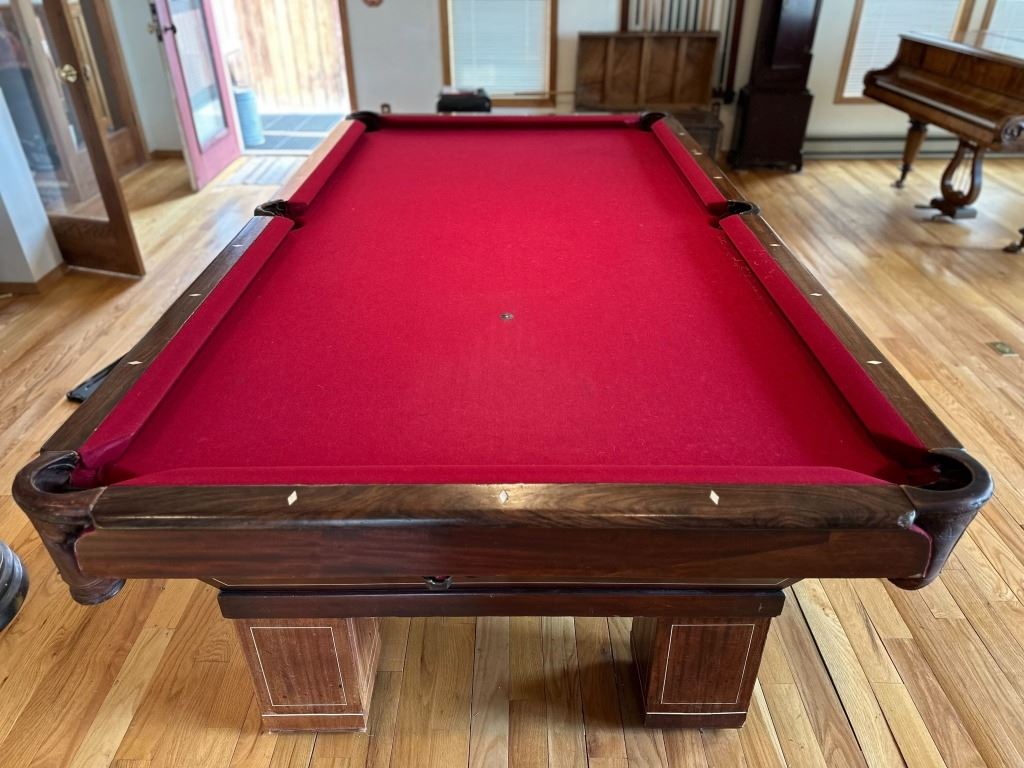The lot features an original Brunswick-Balke-Collender pool table dating to circa 1912, in original condition. The pool table is either a Richelieu, Homewood, Coreno, or The Reno model. The table shows four large rectangular legs with a thin white line inlay matching the rectangular shape on all four sides of each leg. The sides are at an angle and show three inlaid sections at the long sides and a single inlaid section at each end. The top edge is squared off with heavy thick original leather pockets and a mother of pearl like inlaid diamonds along the top edge. Brunswick Balke Collender manufactured some of the finest large mercantile and gaming cabinets and tables. The top is inlaid with "The Brunswick-Balke-Collender Co. Monarch Cushions". The table shows cast iron original Brunswick swing out pool cue chalk holders on the end. One end shows the original gold label with the Patent dates with the last patent date being May 7, 1912. The table presumably has the original slate, but not confirmed. Nice condition for its historic age. The table has been professionally dissembled for easier transport and shipping.*