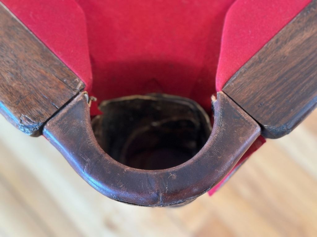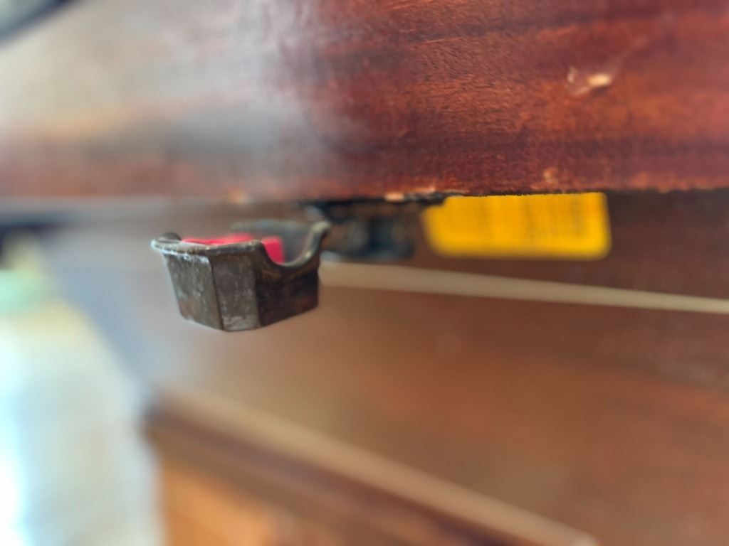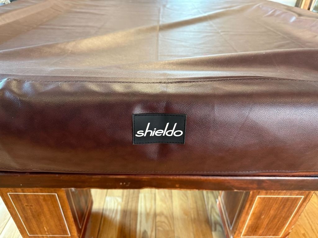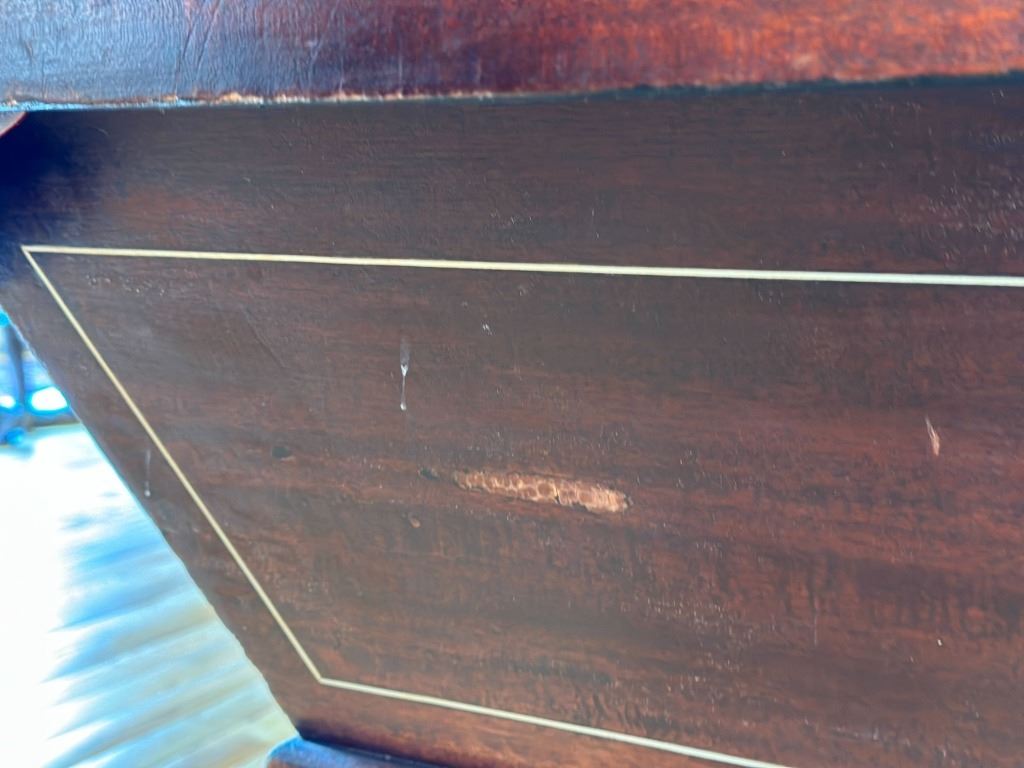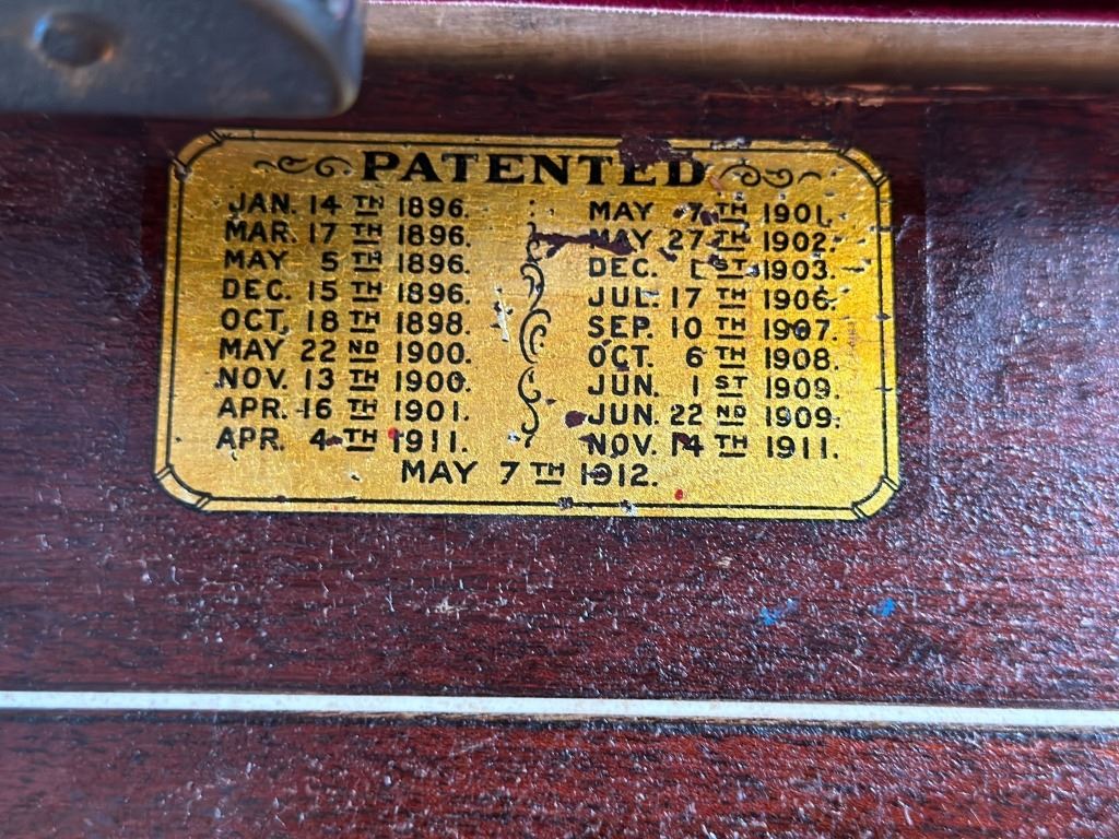 The lot features an original Brunswick-Balke-Collender pool table dating to circa 1912, in original condition. The pool table is either a Richelieu, Homewood, Coreno, or The Reno model. The table shows four large rectangular legs with a thin white line inlay matching the rectangular shape on all four sides of each leg. The sides are at an angle and show three inlaid sections at the long sides and a single inlaid section at each end. The top edge is squared off with heavy thick original leather pockets and a mother of pearl like inlaid diamonds along the top edge. Brunswick Balke Collender manufactured some of the finest large mercantile and gaming cabinets and tables. The top is inlaid with "The Brunswick-Balke-Collender Co. Monarch Cushions". The table shows cast iron original Brunswick swing out pool cue chalk holders on the end. One end shows the original gold label with the Patent dates with the last patent date being May 7, 1912. The table presumably has the original slate, but not confirmed. Nice condition for its historic age. The table has been professionally dissembled for easier transport and shipping.*