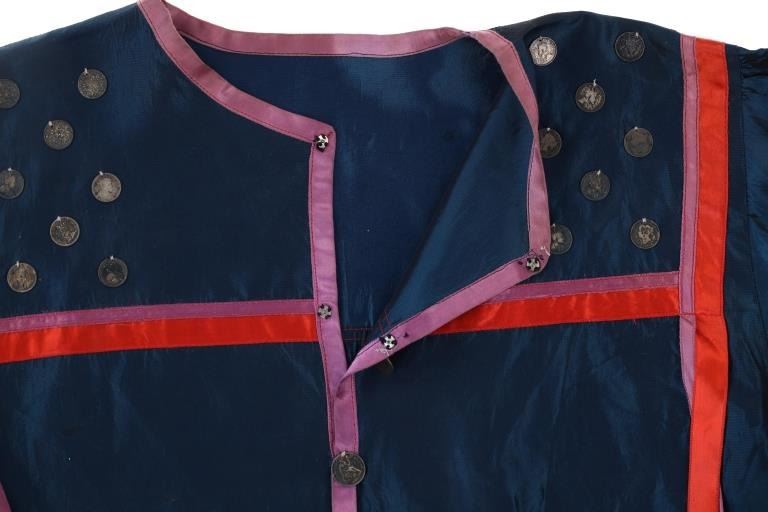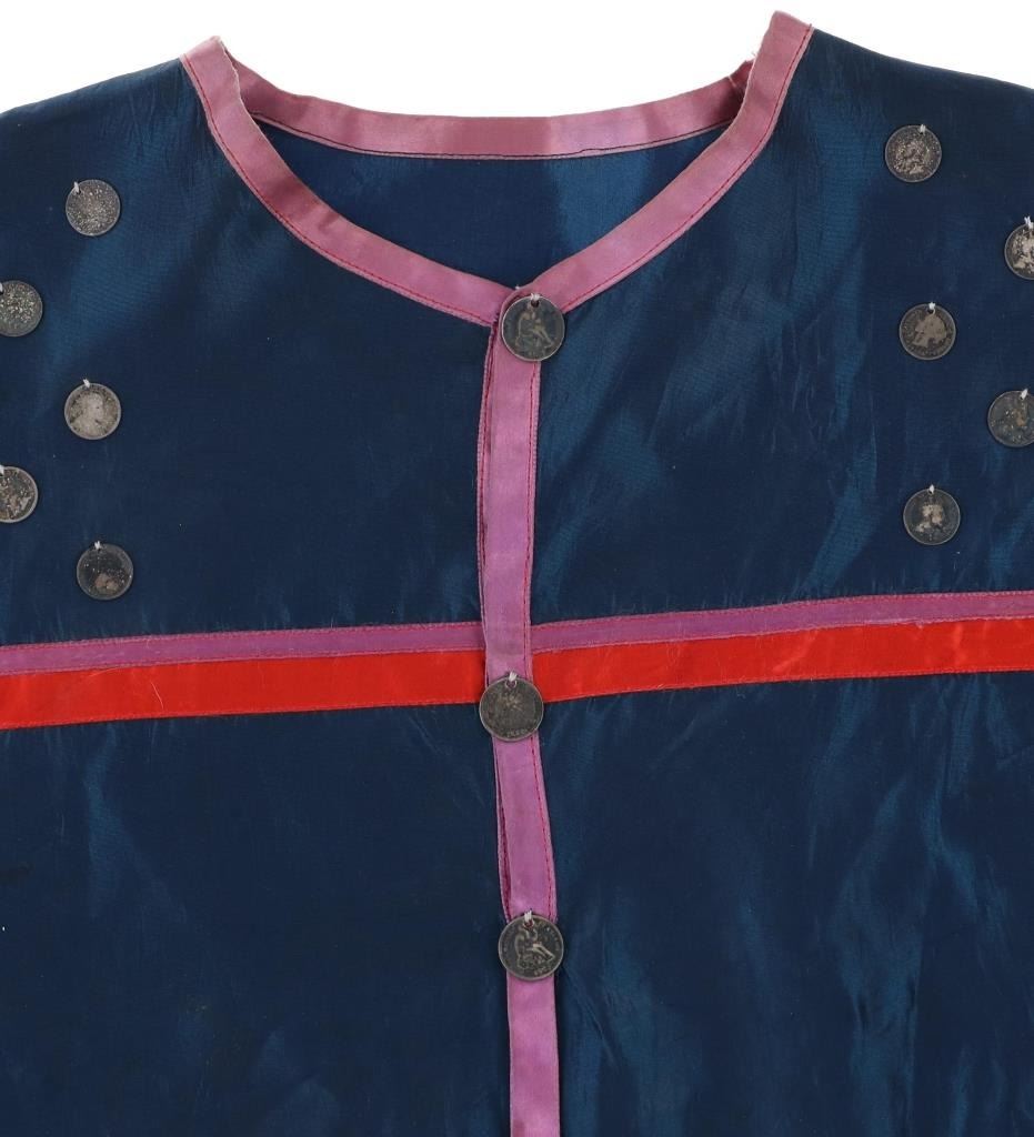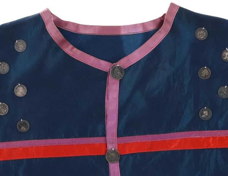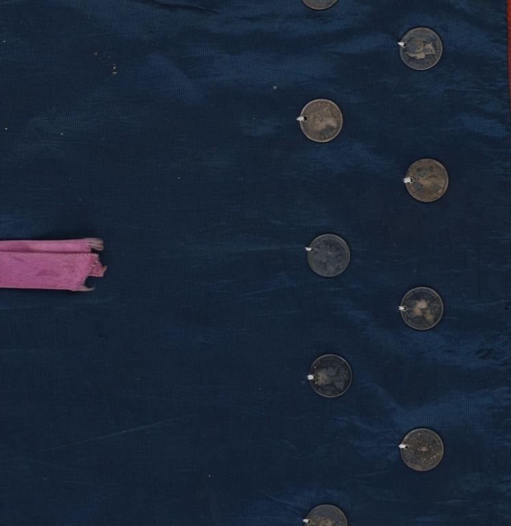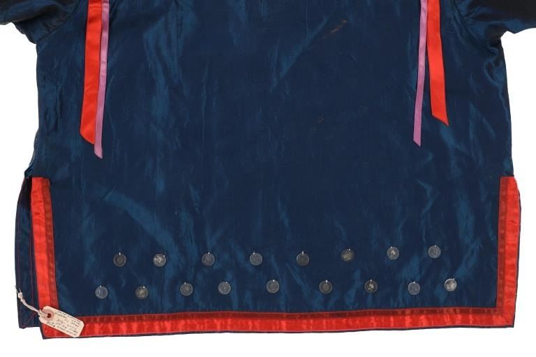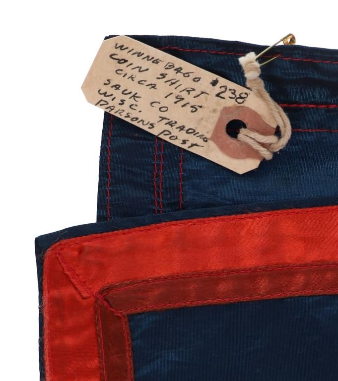 Featured in this lot is this Ojibwa coin Parson's Trading Post shirt circa 1915. The shirt features a wonderfully and professionally crafted polyester and Canadian nickel construction. The war shirt shows coloration of blue, red, and purple; and consists of a total of 71 Canadian nickel's attached to the shirt. The shirt is tagged with the original identification tag that identifies is as coming from the Sauk County Wisconsin Parson's Trading Post and circa 1915. The condition of this of this coin war shirt is good with no obvious signs of damage and shows good overall condition. The measurements of this war shirt are 26" x 19 1/4".