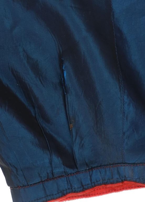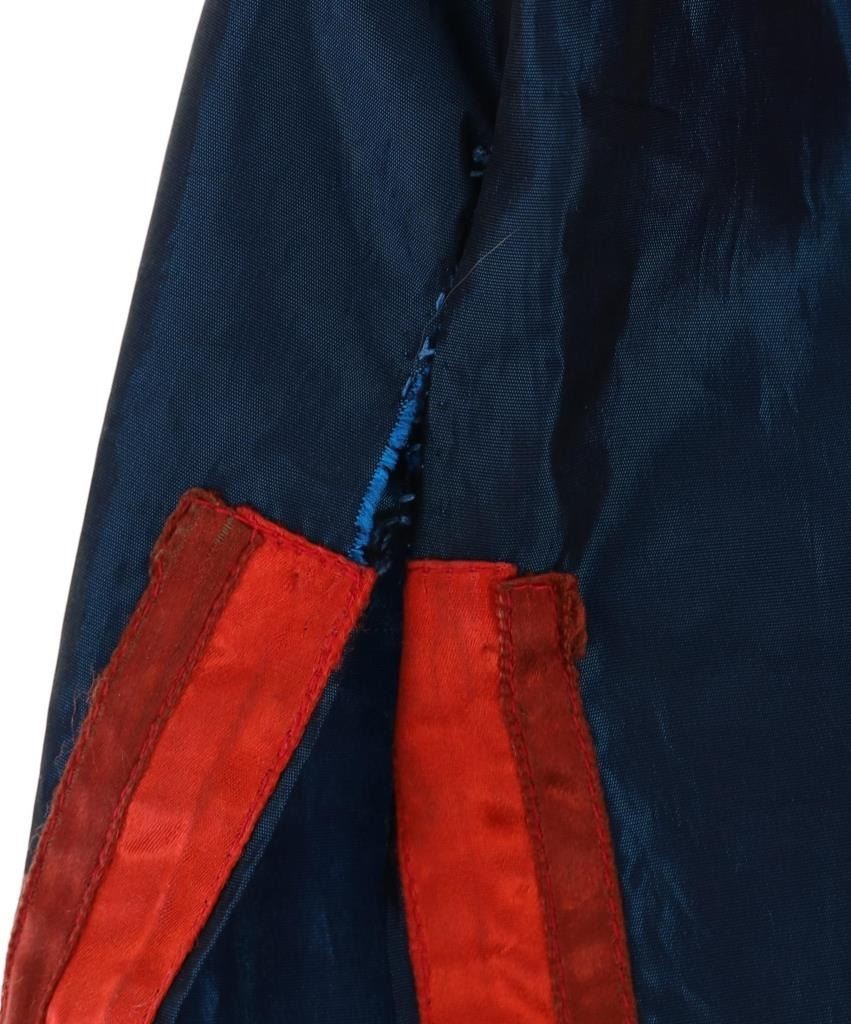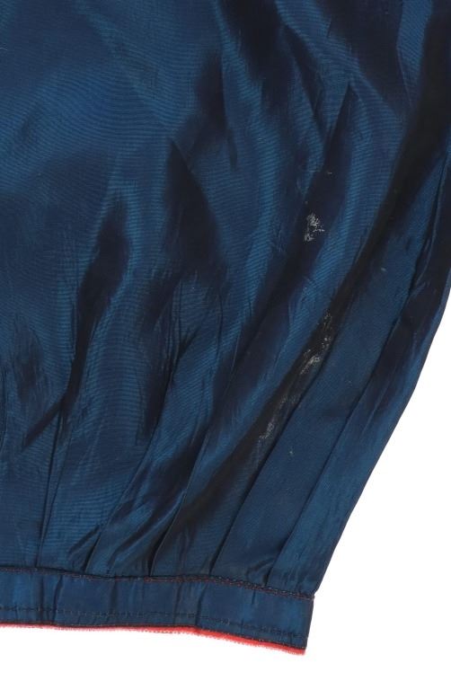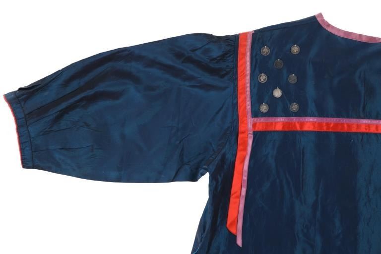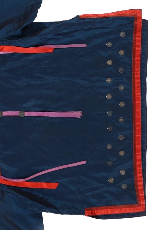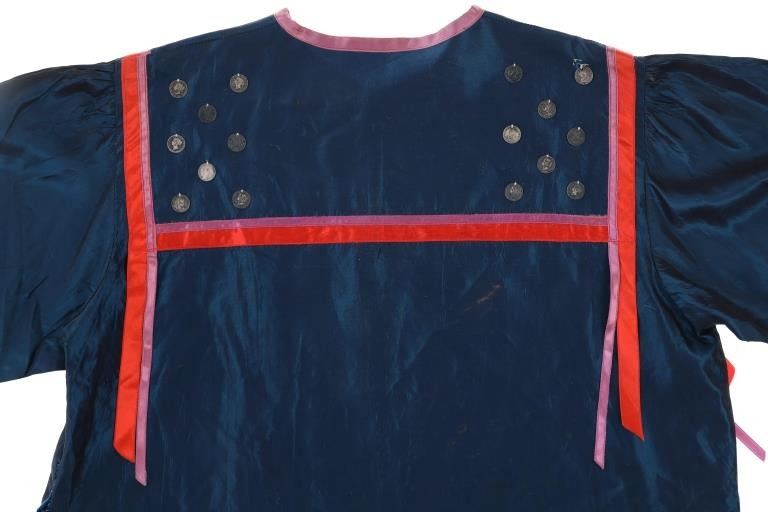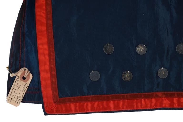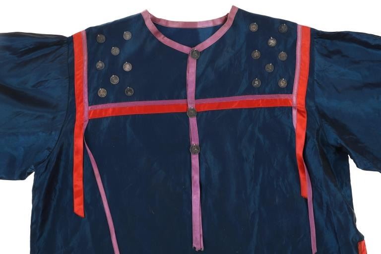 Featured in this lot is this Ojibwa coin Parson's Trading Post shirt circa 1915. The shirt features a wonderfully and professionally crafted polyester and Canadian nickel construction. The war shirt shows coloration of blue, red, and purple; and consists of a total of 71 Canadian nickel's attached to the shirt. The shirt is tagged with the original identification tag that identifies is as coming from the Sauk County Wisconsin Parson's Trading Post and circa 1915. The condition of this of this coin war shirt is good with no obvious signs of damage and shows good overall condition. The measurements of this war shirt are 26" x 19 1/4".