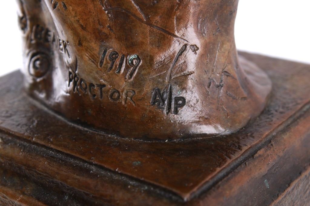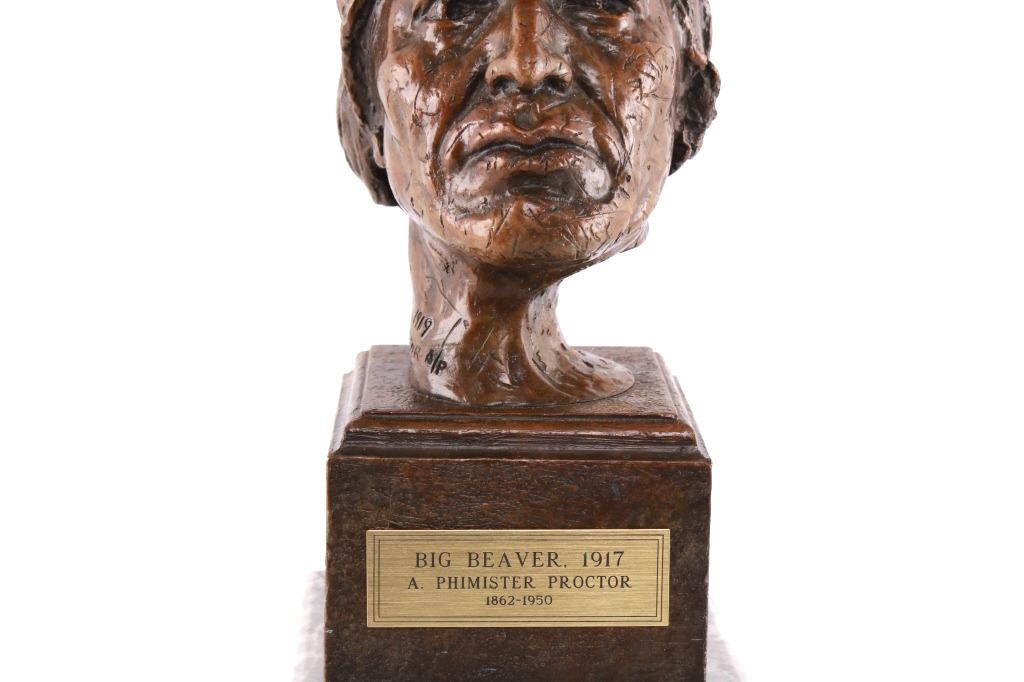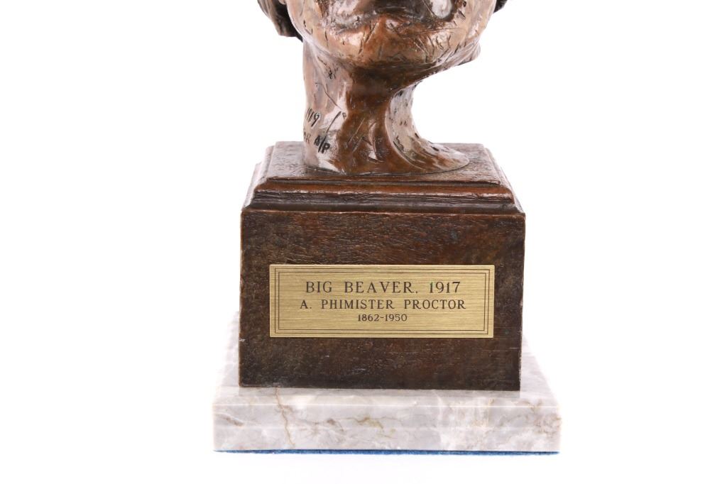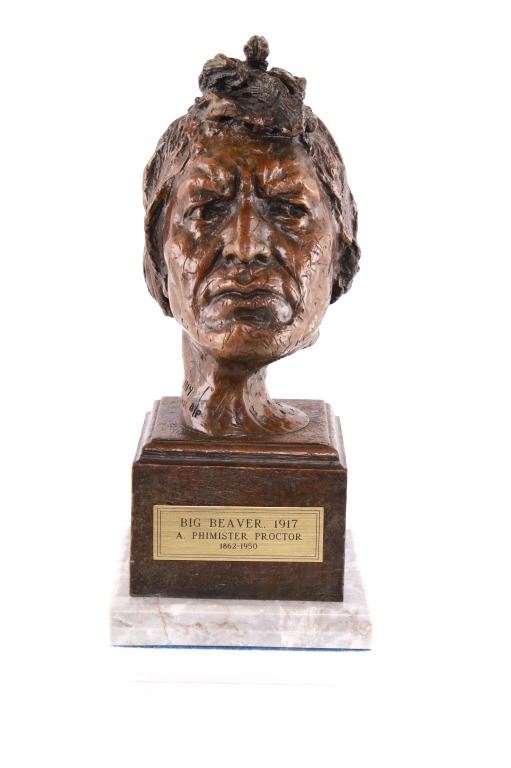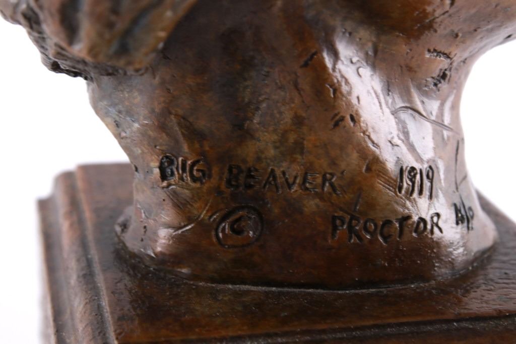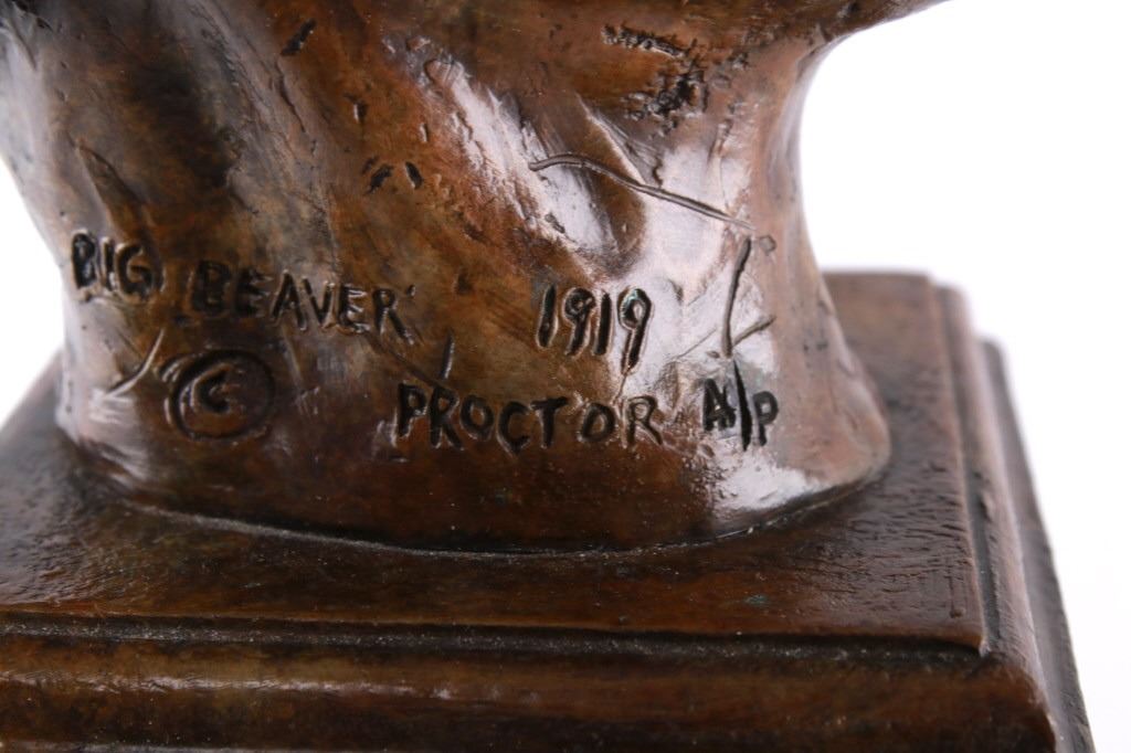 Featured in this lot is this Artist Proof bronze sculpture called "Big Beaver," circa 1919 from atist Alexander Phimister Proctor born in 1860 and died in 1950. This is believed to be an original bronze done during the artist lifetime. The bronze sculpture of Native American called Big Beaver. Big Beaver, a Blackfoot Indian, traveled with Proctor in a car from Montana to California to complete On the War Trail. The bronze is marked along the neck as follows: Big Beaver - Proctor - 1919 - A/P; and shows a plaque on the front that reads as follows: Big Beaver. 1917 - A. Phimister Proctor - 1862-1950. Alexander Phimister Proctor (September 27, 1860 – September 5, 1950) was an American sculptor with the contemporary reputation as one of the nation's foremost animaliers. His ability to capture animals in action, garnered in part from his days tracking them, coupled with his interest in all things Native American, opened a niche for Proctor, one that he parlayed into a long, successful career. The condition of this bronze sculpture is good with no obvious signs of damage and shows good overall condition. The measurements of this bronze sculpture is 10 3/4" x 4 7/8" x 4 3/4".