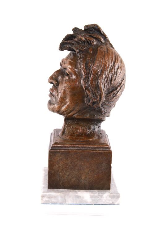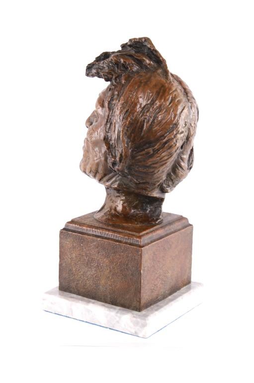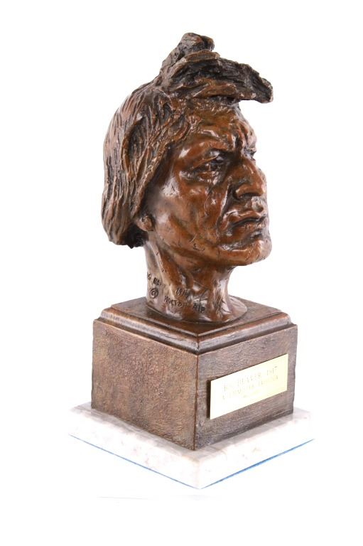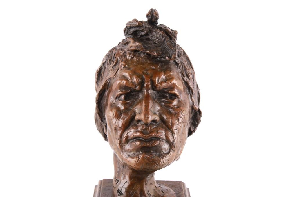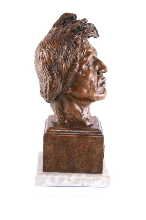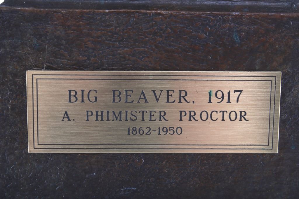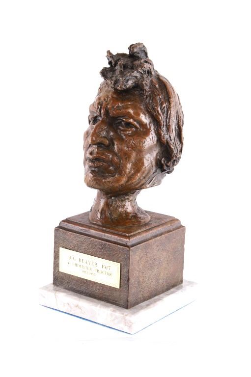 Featured in this lot is this Artist Proof bronze sculpture called "Big Beaver," circa 1919 from atist Alexander Phimister Proctor born in 1860 and died in 1950. This is believed to be an original bronze done during the artist lifetime. The bronze sculpture of Native American called Big Beaver. Big Beaver, a Blackfoot Indian, traveled with Proctor in a car from Montana to California to complete On the War Trail. The bronze is marked along the neck as follows: Big Beaver - Proctor - 1919 - A/P; and shows a plaque on the front that reads as follows: Big Beaver. 1917 - A. Phimister Proctor - 1862-1950. Alexander Phimister Proctor (September 27, 1860 – September 5, 1950) was an American sculptor with the contemporary reputation as one of the nation's foremost animaliers. His ability to capture animals in action, garnered in part from his days tracking them, coupled with his interest in all things Native American, opened a niche for Proctor, one that he parlayed into a long, successful career. The condition of this bronze sculpture is good with no obvious signs of damage and shows good overall condition. The measurements of this bronze sculpture is 10 3/4" x 4 7/8" x 4 3/4".