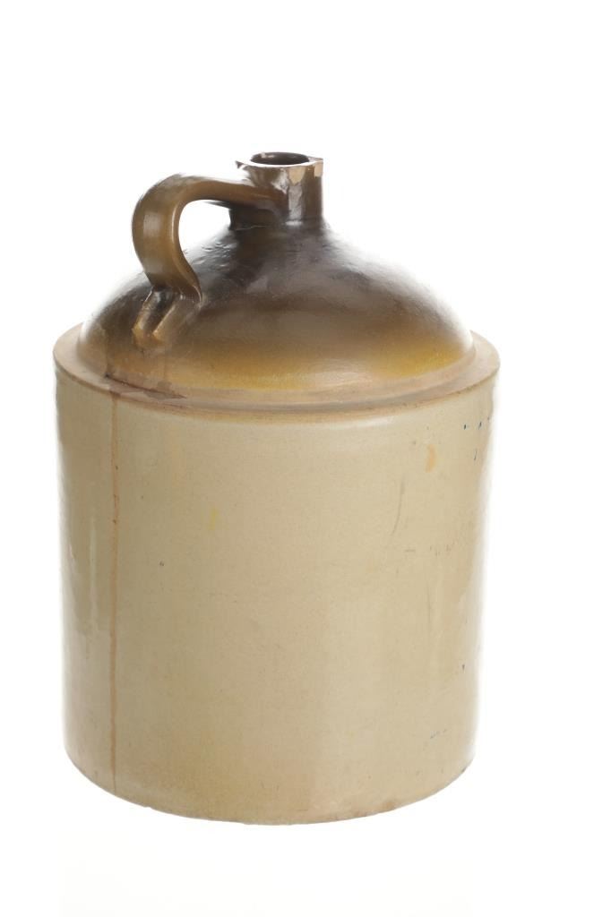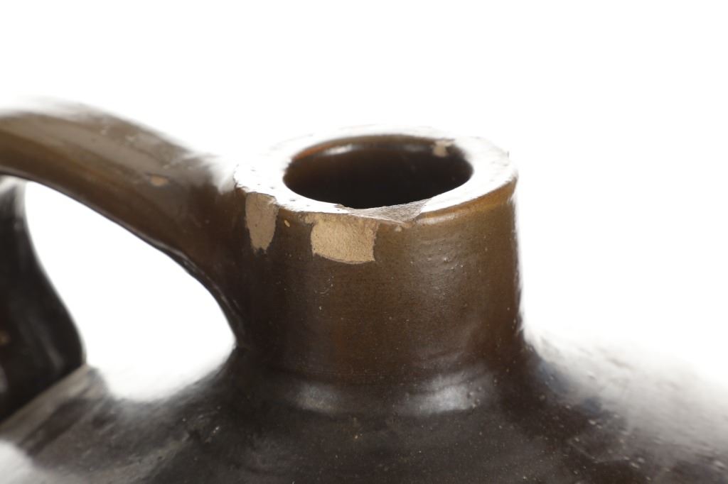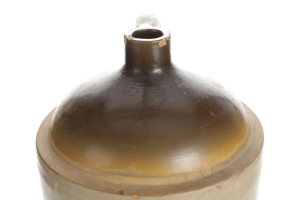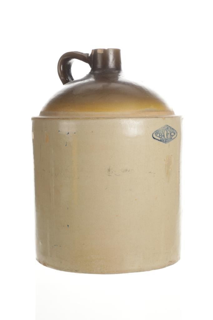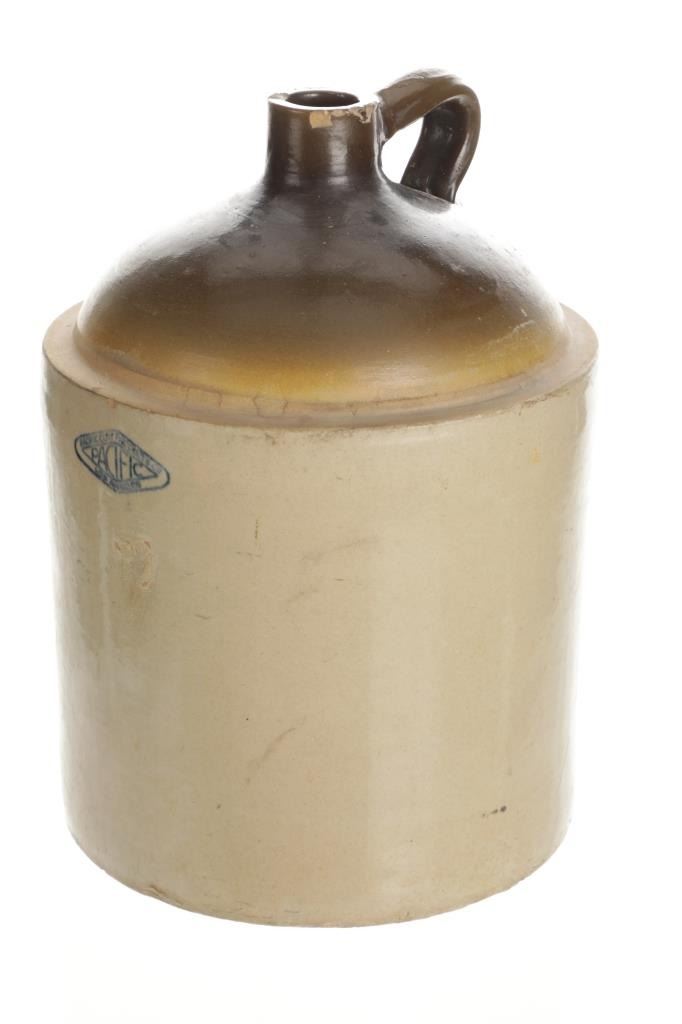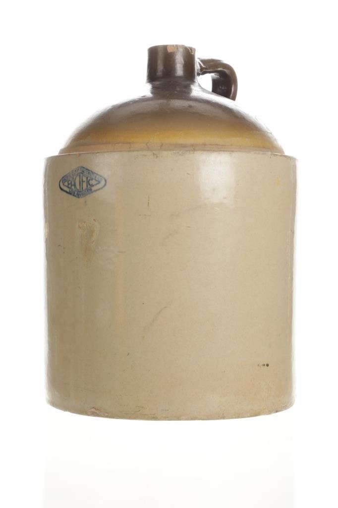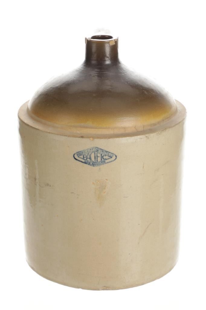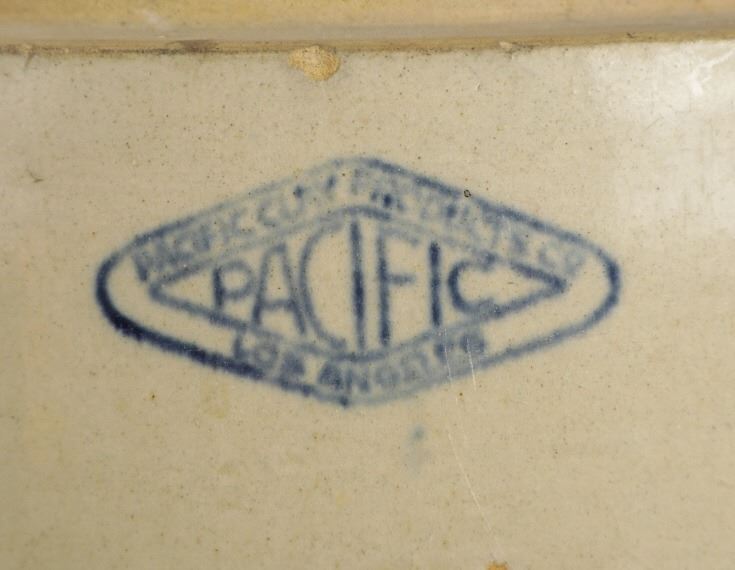 This is an original early circa 1920-1930’s Pacific Clay Products Los Angelese, California stoneware jug. The jar displays thick pottery construction with a carry loop across the top. The top of the jar shows a short round throat and is missing its cork stopper. The jar is colored with a dark brown across the top with a salt glaze protective coating across the exterior. The jug is marked on the front as follows: Pacific Clay Product Co. - Pacific - Los Angeles. Pacific Clay Products was founded in 1892 from the merger of several Southern California potteries and later started producing utilitarian pottery in the 1920’s and solid color earthenware dinnerware in 1932 with the primary site being in Los Angeles until about 1942 when they focused on sewer tile and brick. The condition of this jug is good with some small chips to the rim of the jug but otherwise is in good overall condition. The measurements of this jug are 17" x 10 3/4" x 10 3/4"