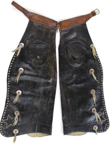 unmarked with tooled leather belt, outside pockets, 5 conchos down each leg, spotted border and 5 point star. Great pair of youth chaps, NO repairs or alterations, 30" long.