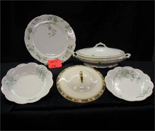 C.1920, AMERICAN IRONSTONE TRANSFER DESIGN IN GREEN INCLUDES (2) CARROLLTON 8 1/4in SERVING BOWLS, (1) TUREEN, (1) WARWICK 10 3/8in FLORAL PLATE, (1) LID #W7977M, 5 PCS