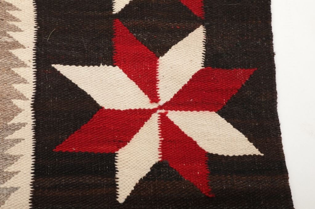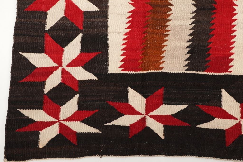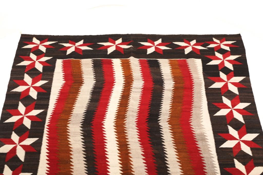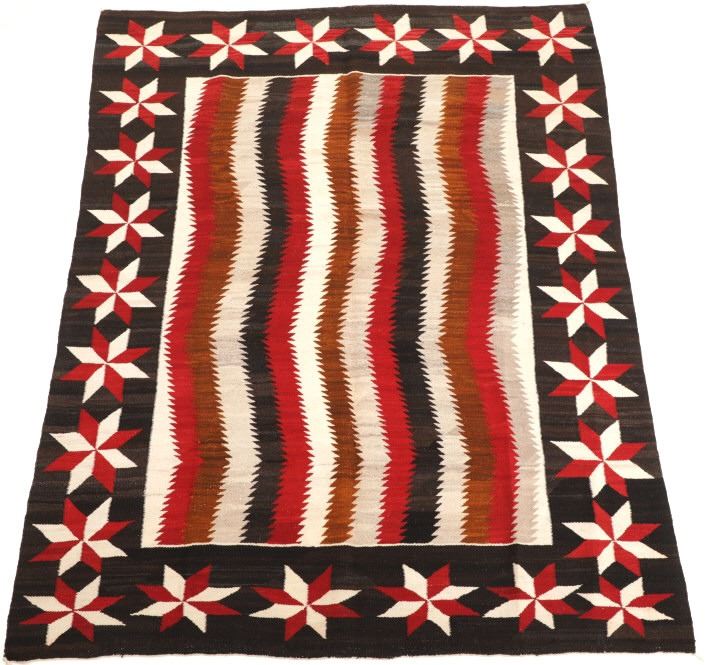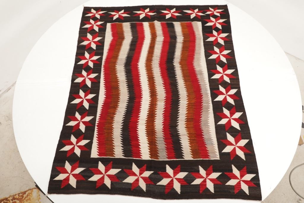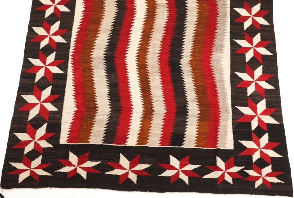Featured in this lot is a Navajo Valero Stars Eye Dazzler rug, circa 1920s. The rug features a wonderfully and professionally crafted wool construction. This is a very sturdy heavy rug that presents Valero Stars along the outside border of the rug that become more squat to the ending of the rug and shows eye dazzler decoration throughout the central portion of the rug with coloration of black, bright brown, heathered grey, red, and off white. The rug is hand spun with naturally dyed wool with natural dyes. The rug features a Lazy Lines throughout the rug consistent with showing age and authenticity of the rug. The condition of this Navajo rug shows a tight weave with a heavy representation and has some of the dye to the field and some crystal eye dazzler decoration that shows discoloration, denoting it was hand dyed. The measurements of this rug are 82"L x 56"W.*