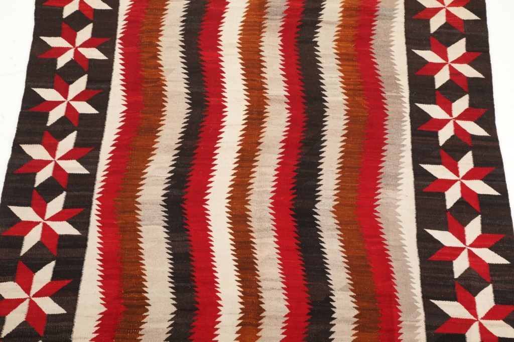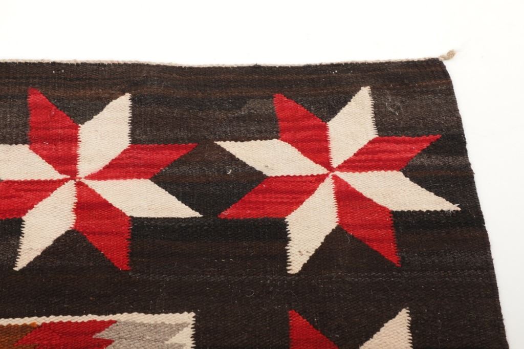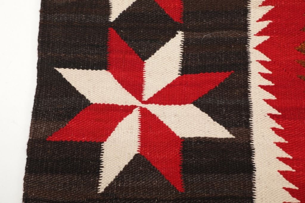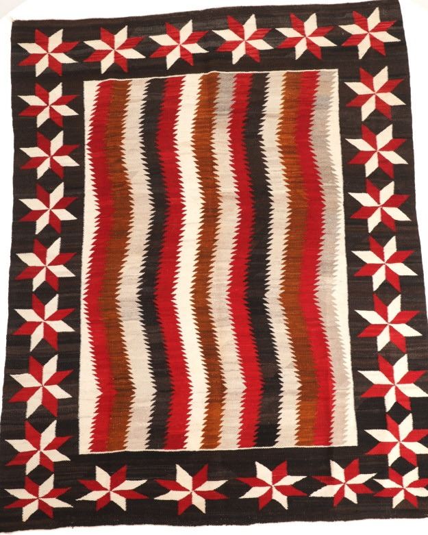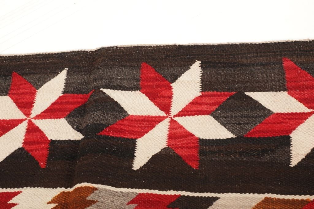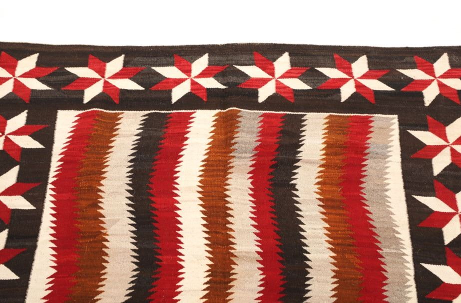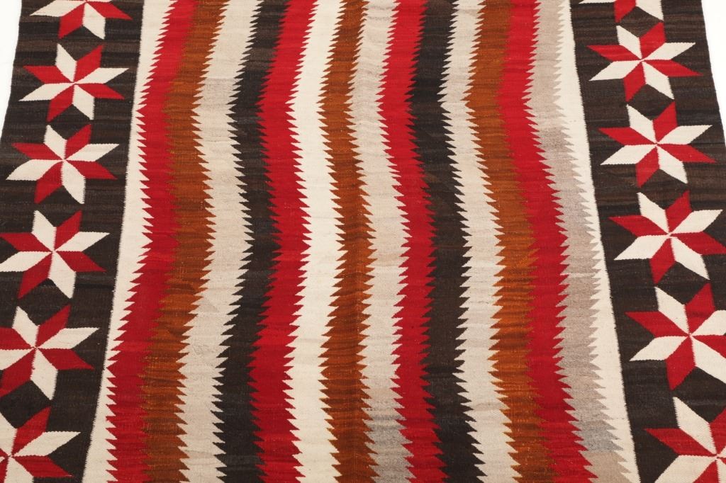Featured in this lot is a Navajo Valero Stars Eye Dazzler rug, circa 1920s. The rug features a wonderfully and professionally crafted wool construction. This is a very sturdy heavy rug that presents Valero Stars along the outside border of the rug that become more squat to the ending of the rug and shows eye dazzler decoration throughout the central portion of the rug with coloration of black, bright brown, heathered grey, red, and off white. The rug is hand spun with naturally dyed wool with natural dyes. The rug features a Lazy Lines throughout the rug consistent with showing age and authenticity of the rug. The condition of this Navajo rug shows a tight weave with a heavy representation and has some of the dye to the field and some crystal eye dazzler decoration that shows discoloration, denoting it was hand dyed. The measurements of this rug are 82"L x 56"W.*
