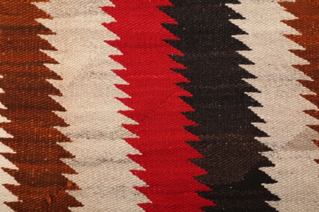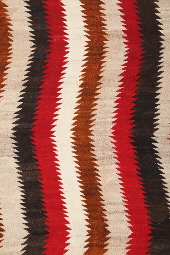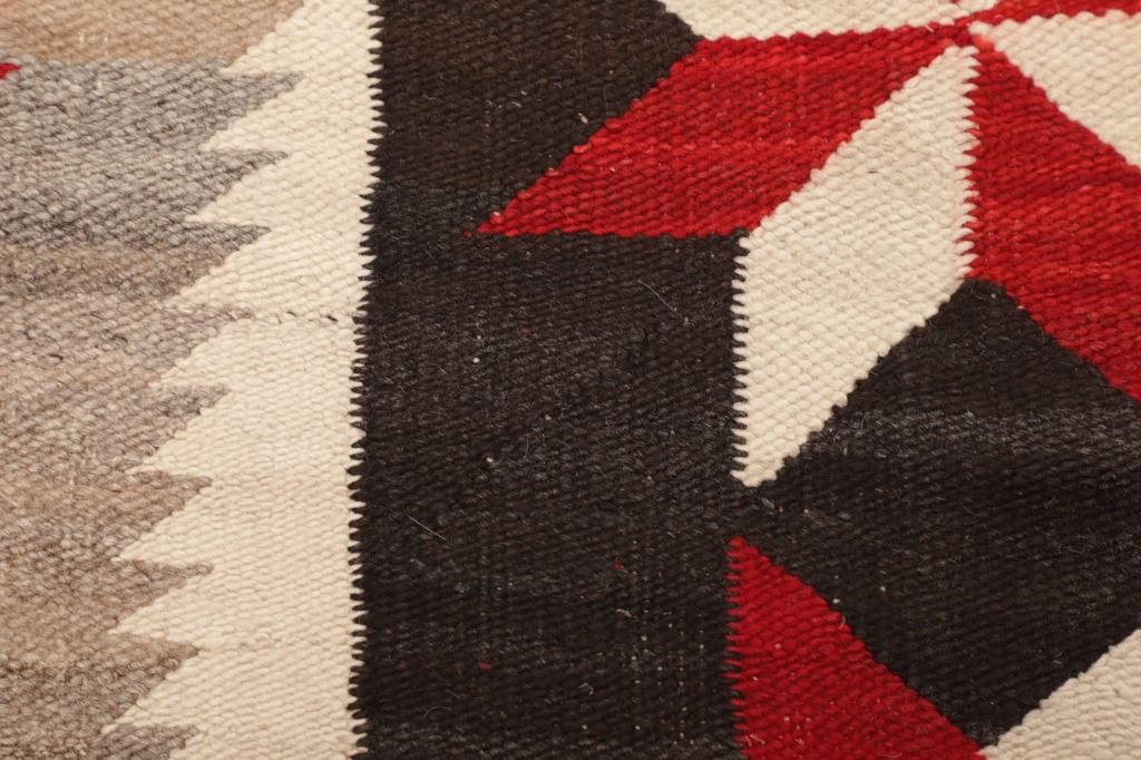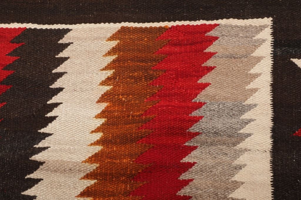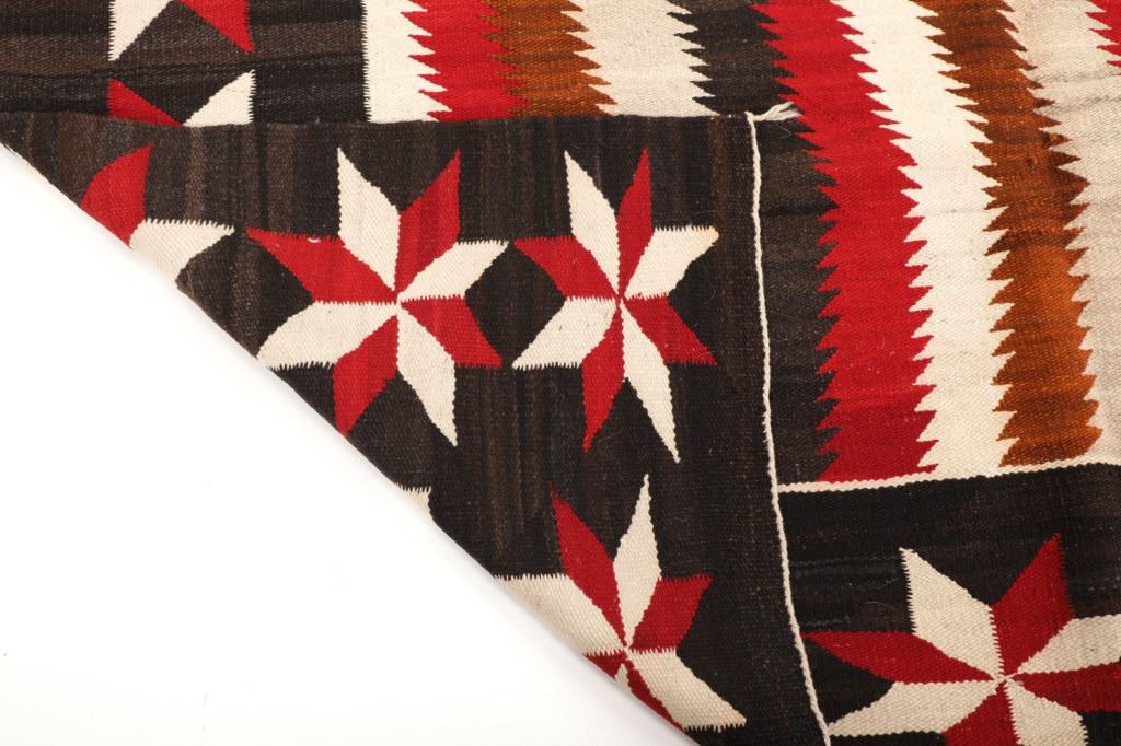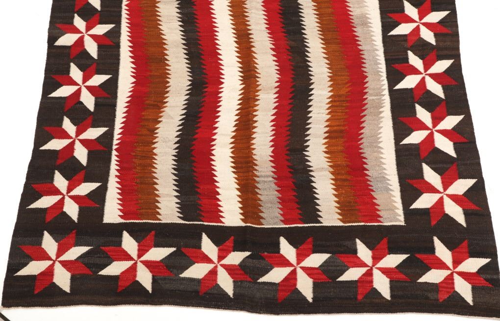 Featured in this lot is a Navajo Valero Stars Eye Dazzler rug, circa 1920s. The rug features a wonderfully and professionally crafted wool construction. This is a very sturdy heavy rug that presents Valero Stars along the outside border of the rug that become more squat to the ending of the rug and shows eye dazzler decoration throughout the central portion of the rug with coloration of black, bright brown, heathered grey, red, and off white. The rug is hand spun with naturally dyed wool with natural dyes. The rug features a Lazy Lines throughout the rug consistent with showing age and authenticity of the rug. The condition of this Navajo rug shows a tight weave with a heavy representation and has some of the dye to the field and some crystal eye dazzler decoration that shows discoloration, denoting it was hand dyed. The measurements of this rug are 82"L x 56"W.*