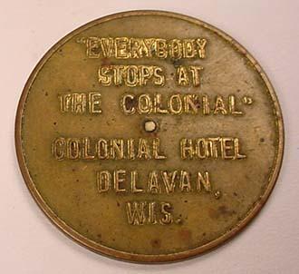 C. 1920'S COLONIAL HOTEL DELEVAN, WI TOKEN