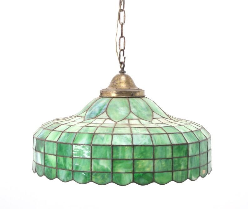 Featured in this lot is this Tiffany art deco style stained glass chandelier circa 1920's. The chandelier features a wonderfully and professionally crafted lead lined and shale stained glass construction and features whirls of green coloration throughout fading to blue in area. The condition of this lamp is good with no obvious signs of damage for its age and in good overall condition and has been tested as working. The measurements of this chandelier are 15" x 23" x 23".