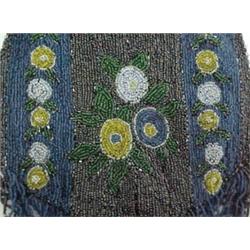 C. 1920 beaded evening bag, body measures 9 1/2" long with fringe and handle is 14", background is steel gray with blue panels and white and yellow flowers, drawstring has beaded tassels Estimate 80/140