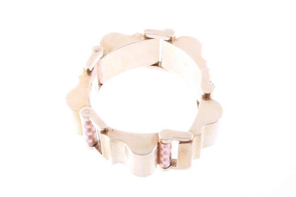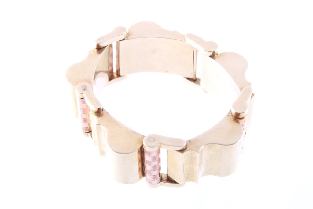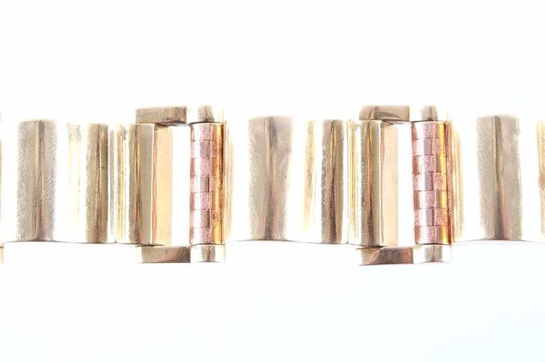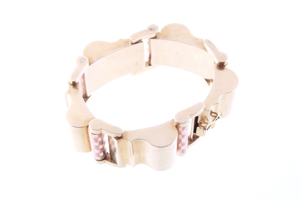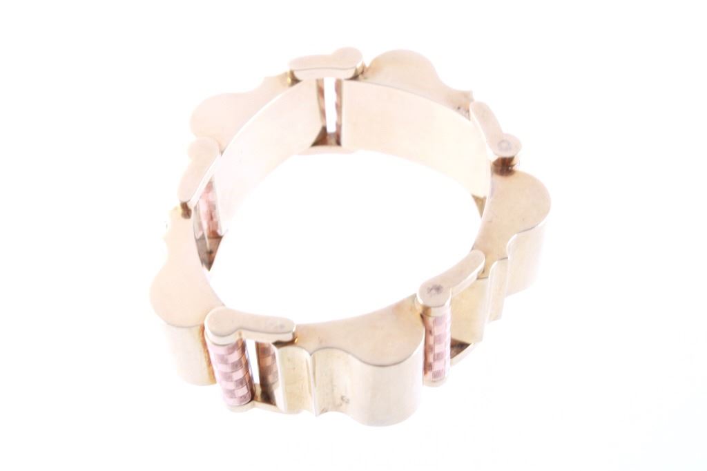 This is an original circa 1920's Art Deco bracelet in 585 (14 karart) yellow and rose gold. This is an iconic Art Deco piece with highly figured articulated links in both yellow and rose or red gold. The bracelet is stamped "585 F&P) as well as another horn "W" like hallmark. 585 is a slightly higher gold content than 14 karat gold and is an earlier and sometimes European mark. The piece features a large classic Art Deco pattern with yellow and rose gold with beautiful checkered etching design. Truly a very rare original piece. Total weight of 1.92 ounces. This is an original circa 1920's antique estate piece showing good condition with no major damages and well preserved with obvious signs of use. Measures overall from end to end when open 8 1/8"L by 1 1/8"W by 5/8"D.