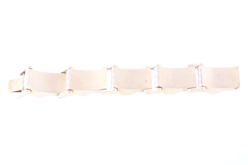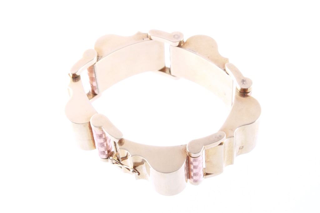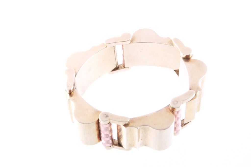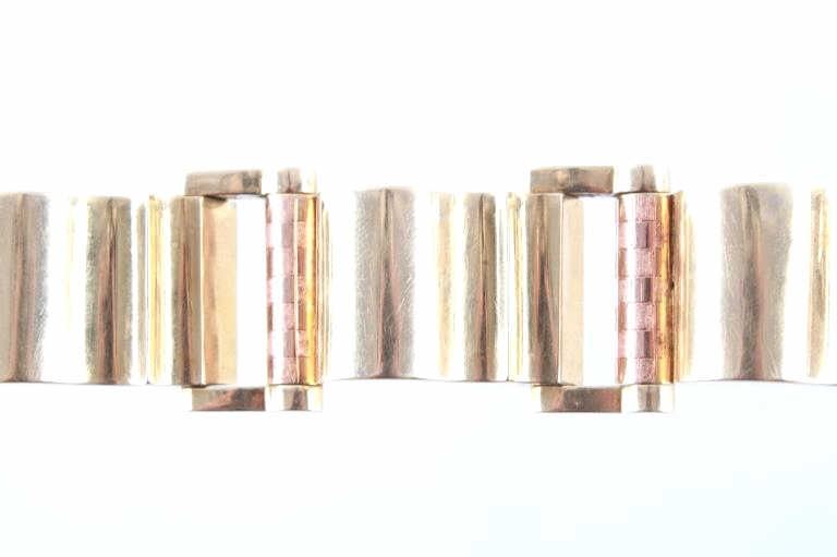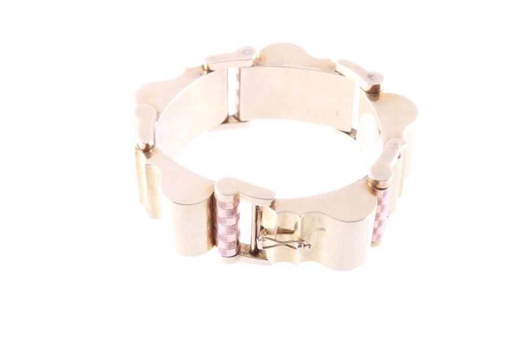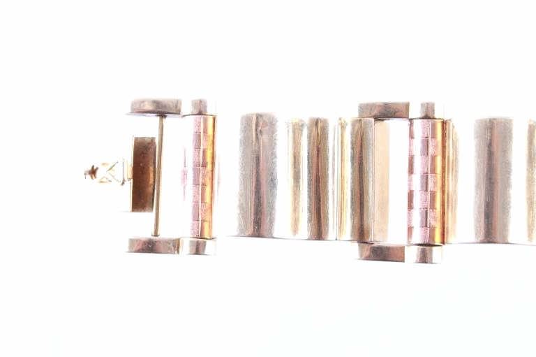 This is an original circa 1920's Art Deco bracelet in 585 (14 karart) yellow and rose gold. This is an iconic Art Deco piece with highly figured articulated links in both yellow and rose or red gold. The bracelet is stamped "585 F&P) as well as another horn "W" like hallmark. 585 is a slightly higher gold content than 14 karat gold and is an earlier and sometimes European mark. The piece features a large classic Art Deco pattern with yellow and rose gold with beautiful checkered etching design. Truly a very rare original piece. Total weight of 1.92 ounces. This is an original circa 1920's antique estate piece showing good condition with no major damages and well preserved with obvious signs of use. Measures overall from end to end when open 8 1/8"L by 1 1/8"W by 5/8"D.