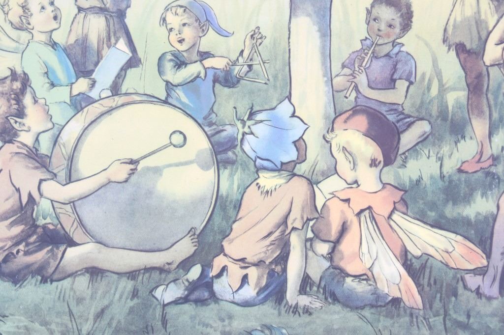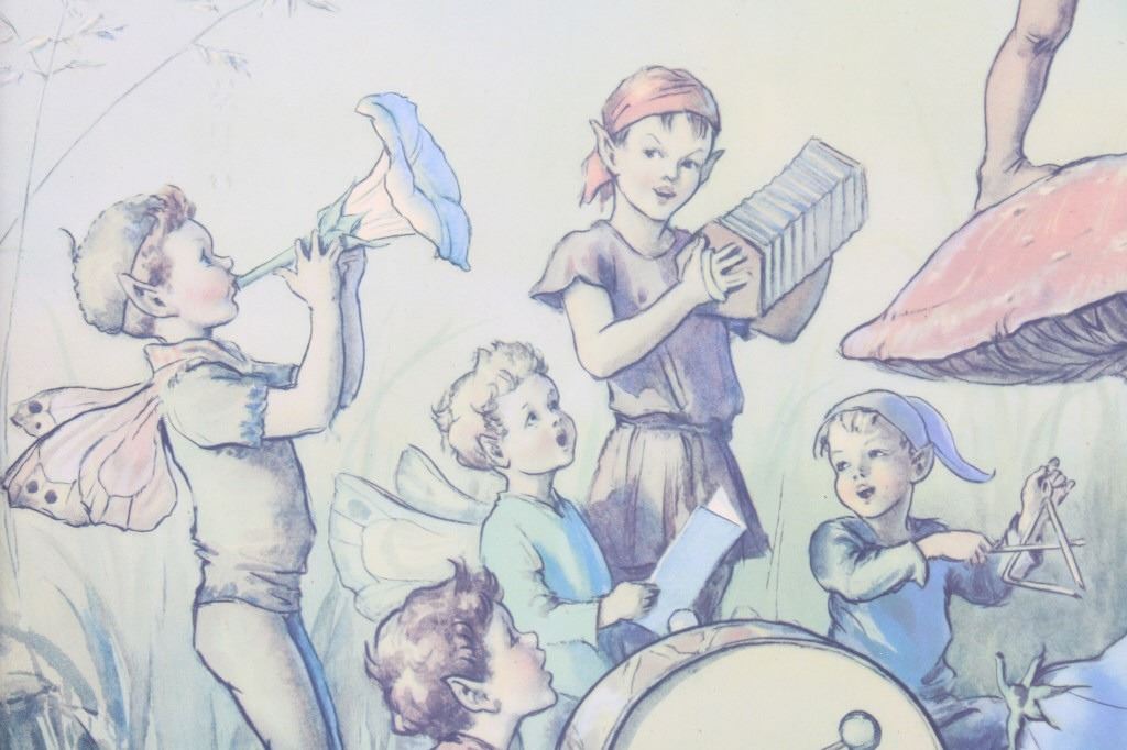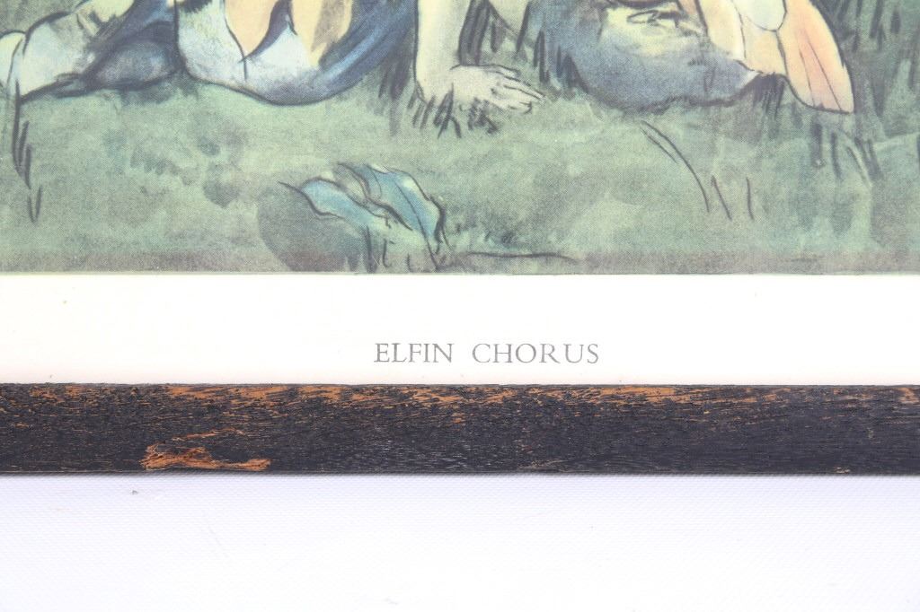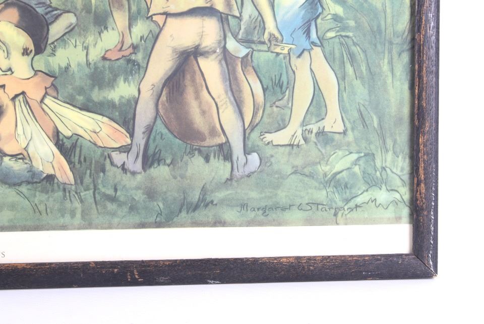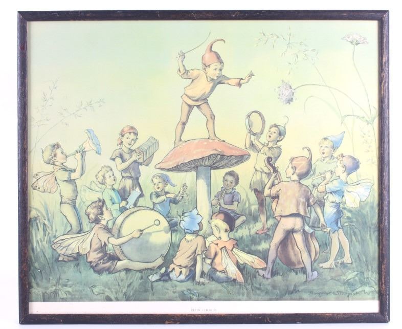 Offered in this lot is Margaret Tarrant’s magical illustration "Elfin Chorus". Margaret W. Tarrant (1888 – 1959) was an English illustrator, and children's author, specializing in depictions of fairy-like children and religious subjects. She began her career at the age of 20, and painted and published into the early 1950s. She was known for her children's books, postcards, calendars, and print reproductions. This print has art that is shown measuring 21 3/4" x 18". The print shows a dozen "Elves" playing instruments and singing under the direction of an Elf conductor standing on a mushroom. The print is signed in the lower right corner, the base color is a pale green and the frame is dark wood. The print appears to be in good condition, the frame shows a fair amount of wear.