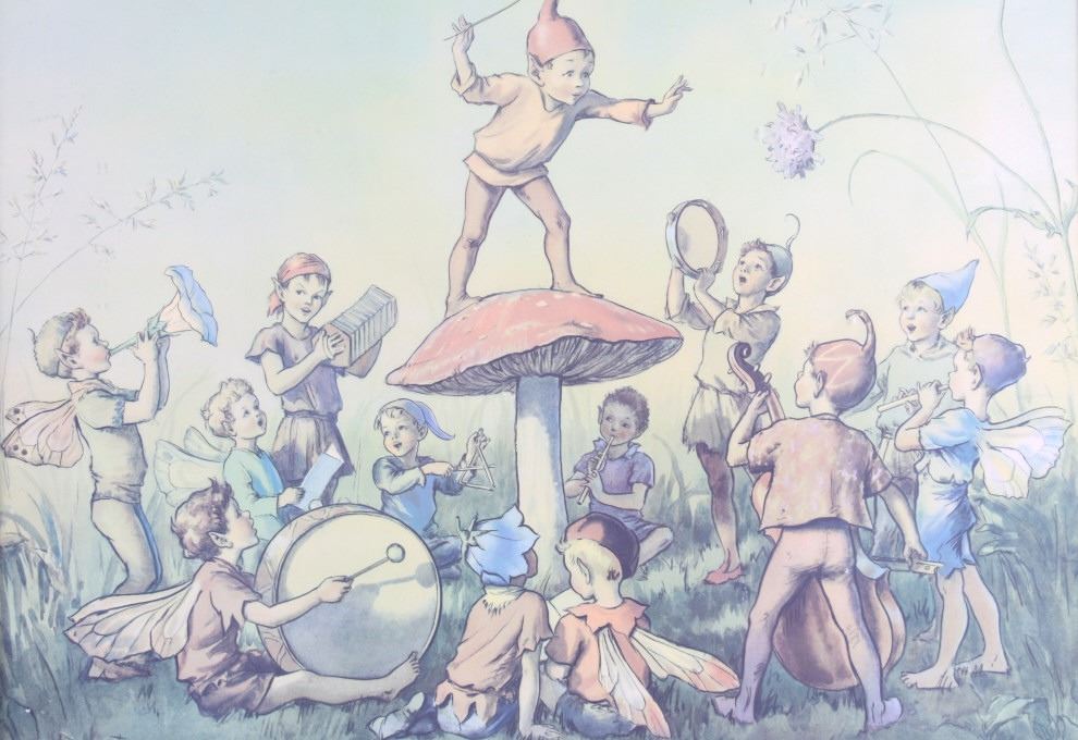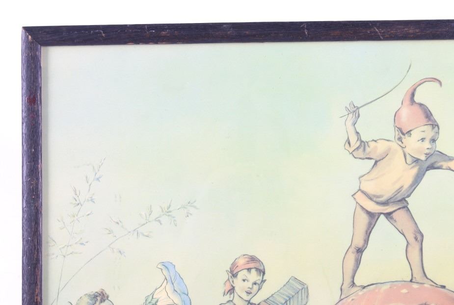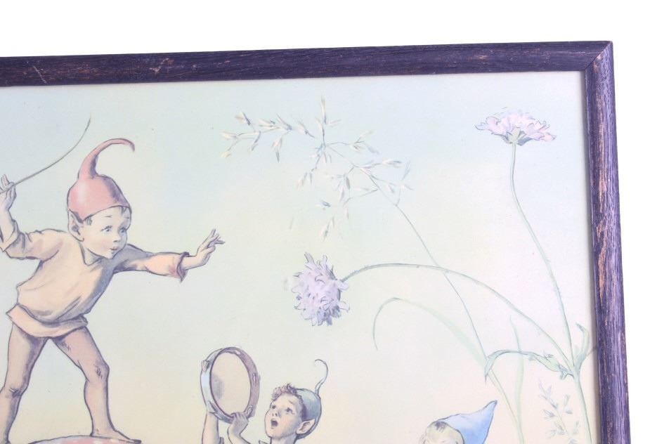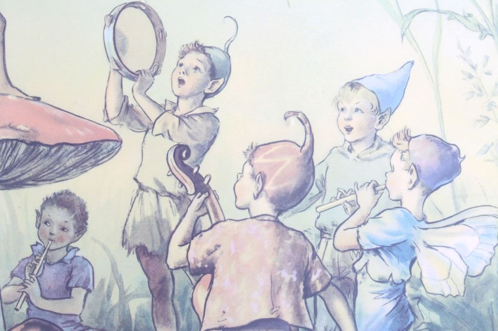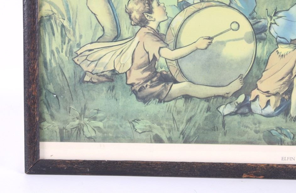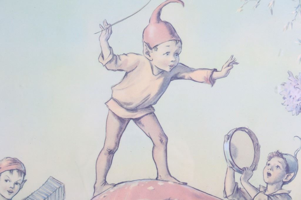 Offered in this lot is Margaret Tarrant’s magical illustration "Elfin Chorus". Margaret W. Tarrant (1888 – 1959) was an English illustrator, and children's author, specializing in depictions of fairy-like children and religious subjects. She began her career at the age of 20, and painted and published into the early 1950s. She was known for her children's books, postcards, calendars, and print reproductions. This print has art that is shown measuring 21 3/4" x 18". The print shows a dozen "Elves" playing instruments and singing under the direction of an Elf conductor standing on a mushroom. The print is signed in the lower right corner, the base color is a pale green and the frame is dark wood. The print appears to be in good condition, the frame shows a fair amount of wear.