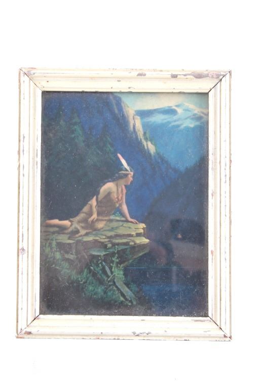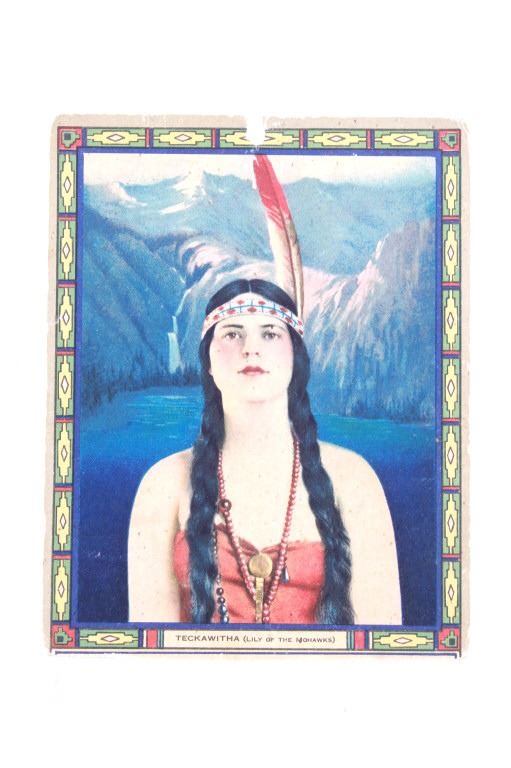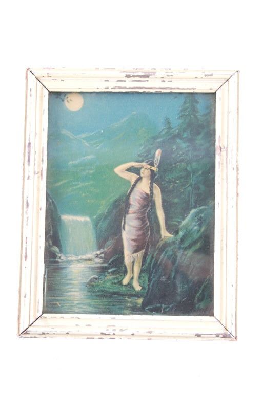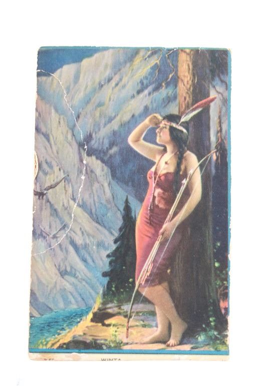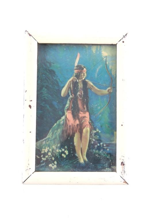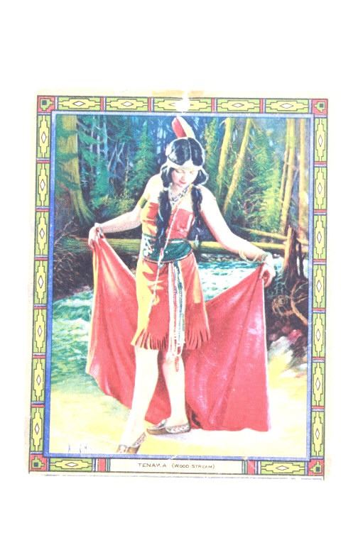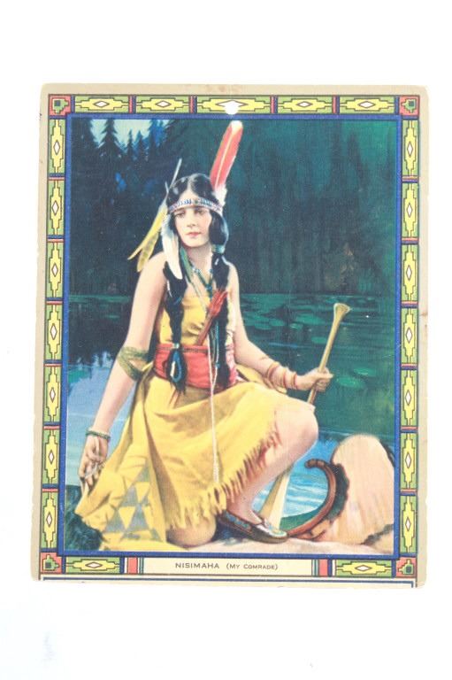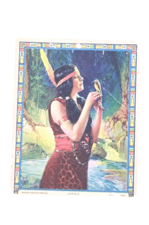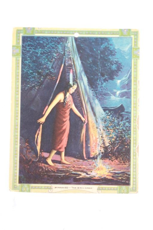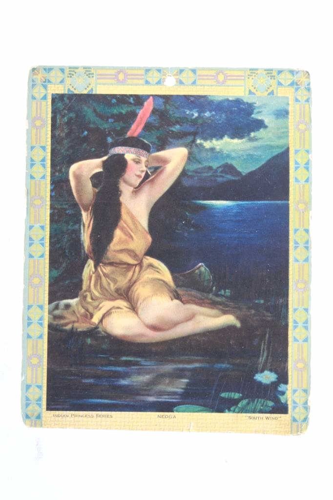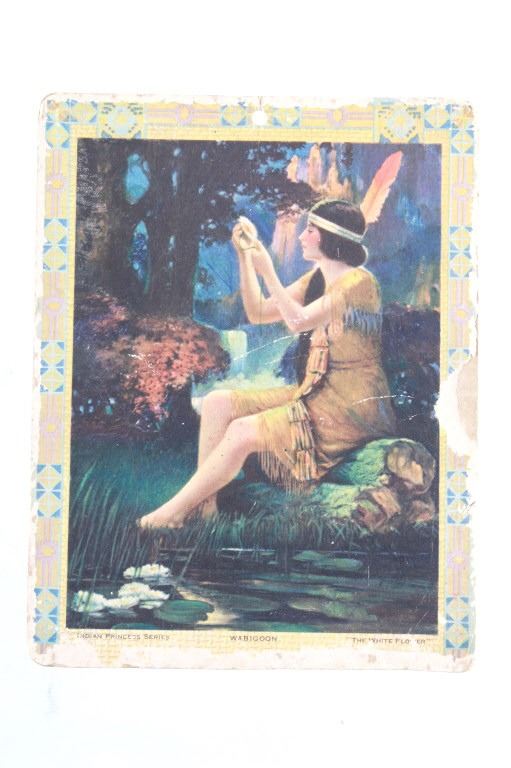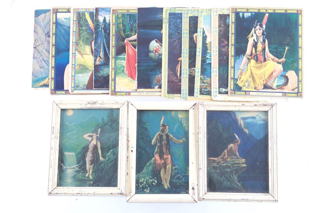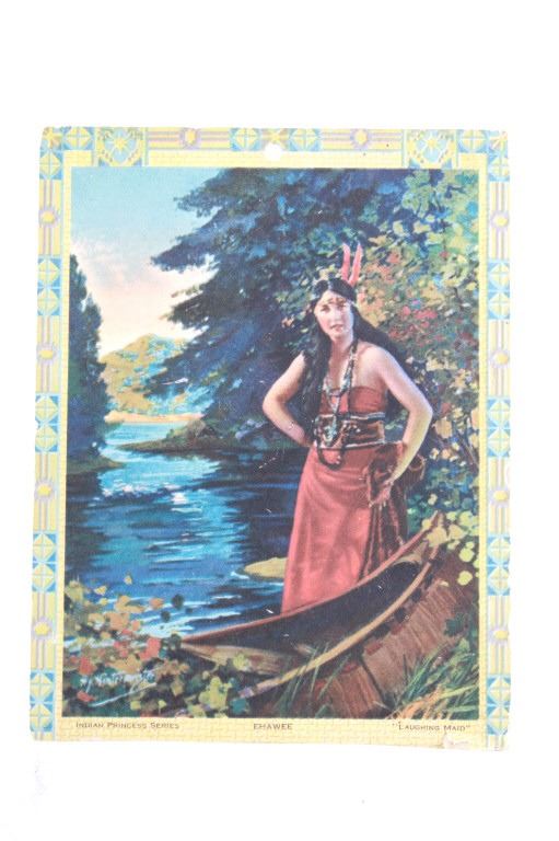 Featured in this lot is this Hintermeister "Indian Princess Series," collection circa 1920's. There are 14 framed and unframed cardstock advertisements in this collection. The collection depicts numerous Indian princesses with titles and marked Indian Princess Series, and shows three of them framed. All of them include advertisements on the back of the cardstock portraits. The condition of these cardstock series is good with no obvious signs of damage and shows good overall condition. The measurements of these cardstock portraits range from 6 1/4" x 4 3/8" and the visible art measures 5 1/8" x 3 1/4" to 5 1/2" x 3 1/2".