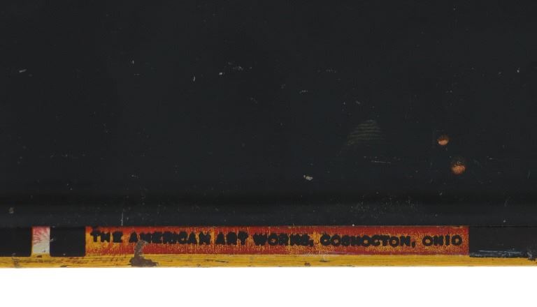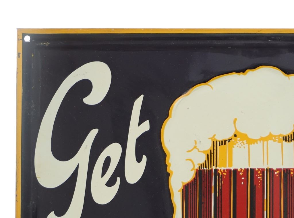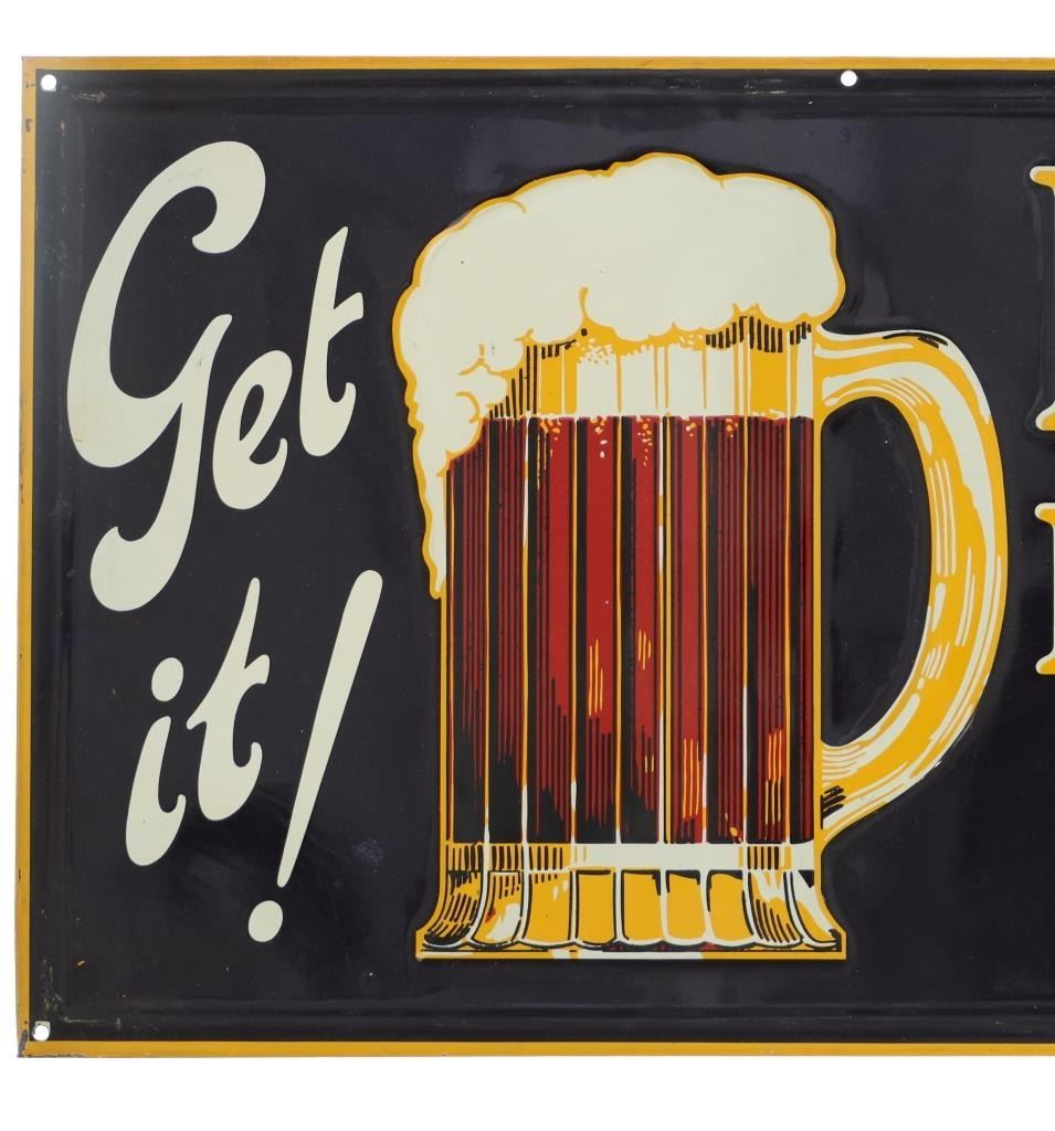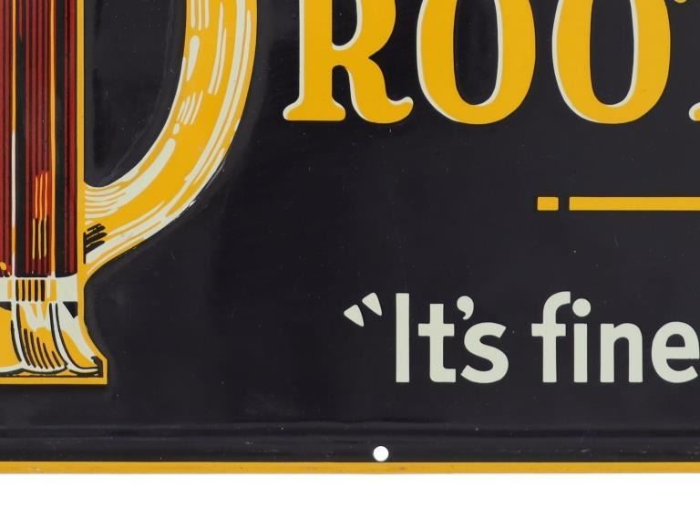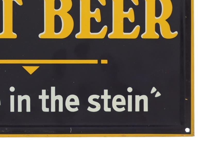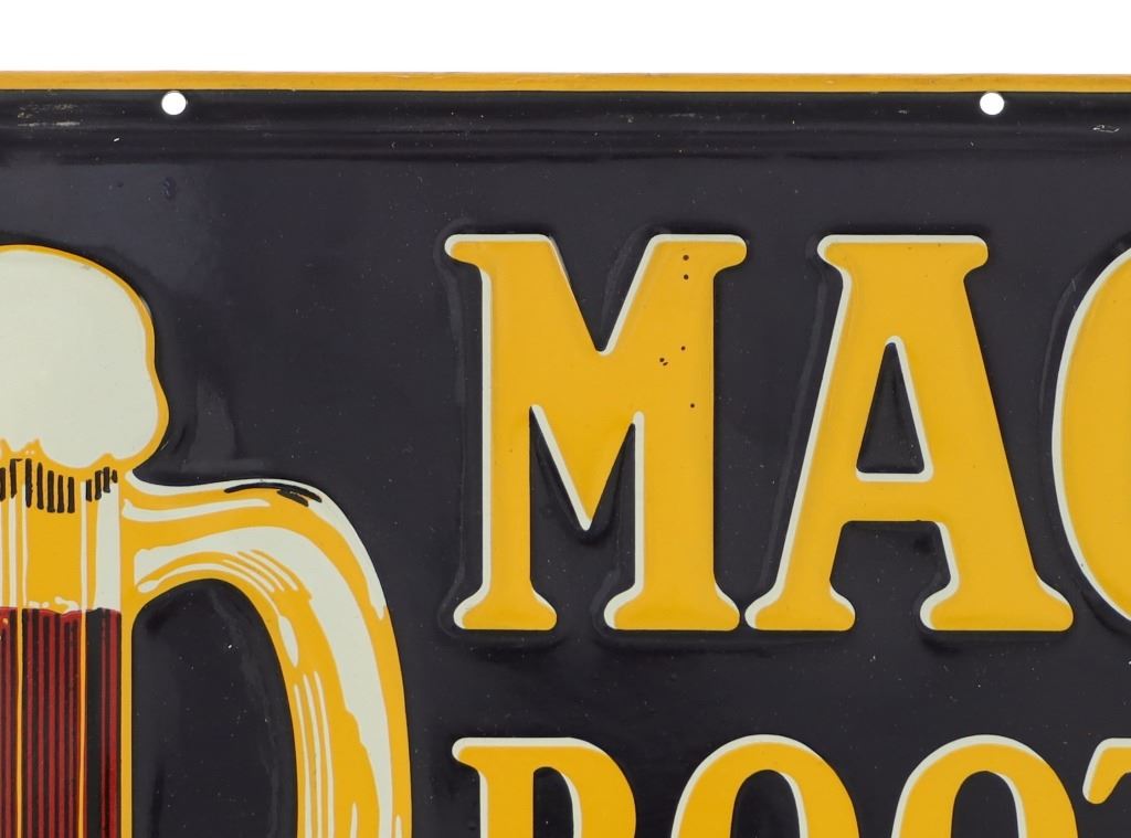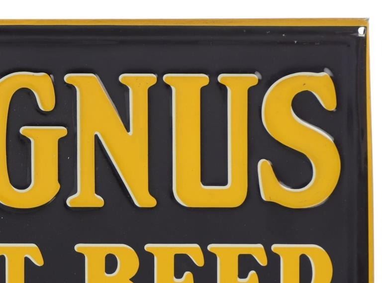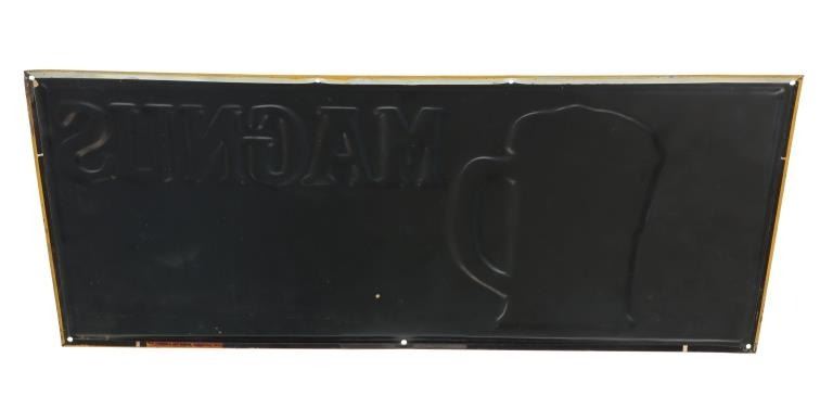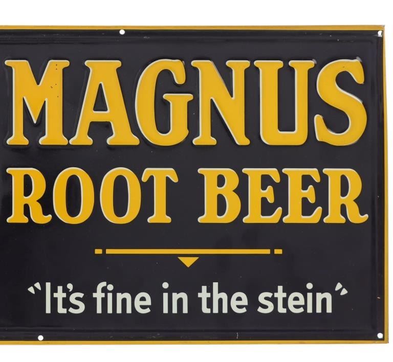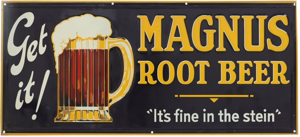 Presented in this lot is a Rare Magnus Root Beer "It's fine in the stein" Single-sided Embossed Tin Sign with Root Beer Mug Stein Graphic, circa 1920s-1930s. A powerful and impressive piece, appears never used. The Magnus Root Beer Co. was started by Joseph A Magnus. Prior to prohibition the family was in the spirits business. With prohibition they started making root beer rather then whiskey which lasted until the mid to late 1930's. Eventually the business name was changed to the Magnus Fruit Products Co of San Franciso California. The reverse side bottom left seam edge has The American Art Works, Coshocton, Ohio as sign maker. Sign shows excellent color & gloss, with a super clean frothy mug stein graphic. Some paint scuffing along edges, slight oxidation noted on rear, slight scratches noted. Measures 8.75"W x 19.25"L