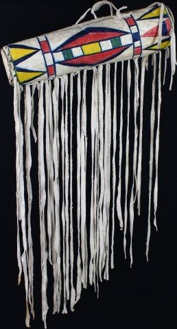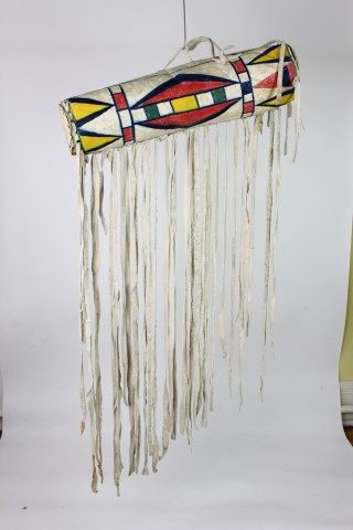 either for ceremonial items or bonnets, includes provenance from Kenneth Canfield Gallery indicating the cylinder was made by Annie Johnson 1880-1974 who was married to a Cayuse Indian man and original purchased from the grand daughter. Overall near fine condition, 21" long X 36" with fringe. Displays beautifully. Est. 1500-2500