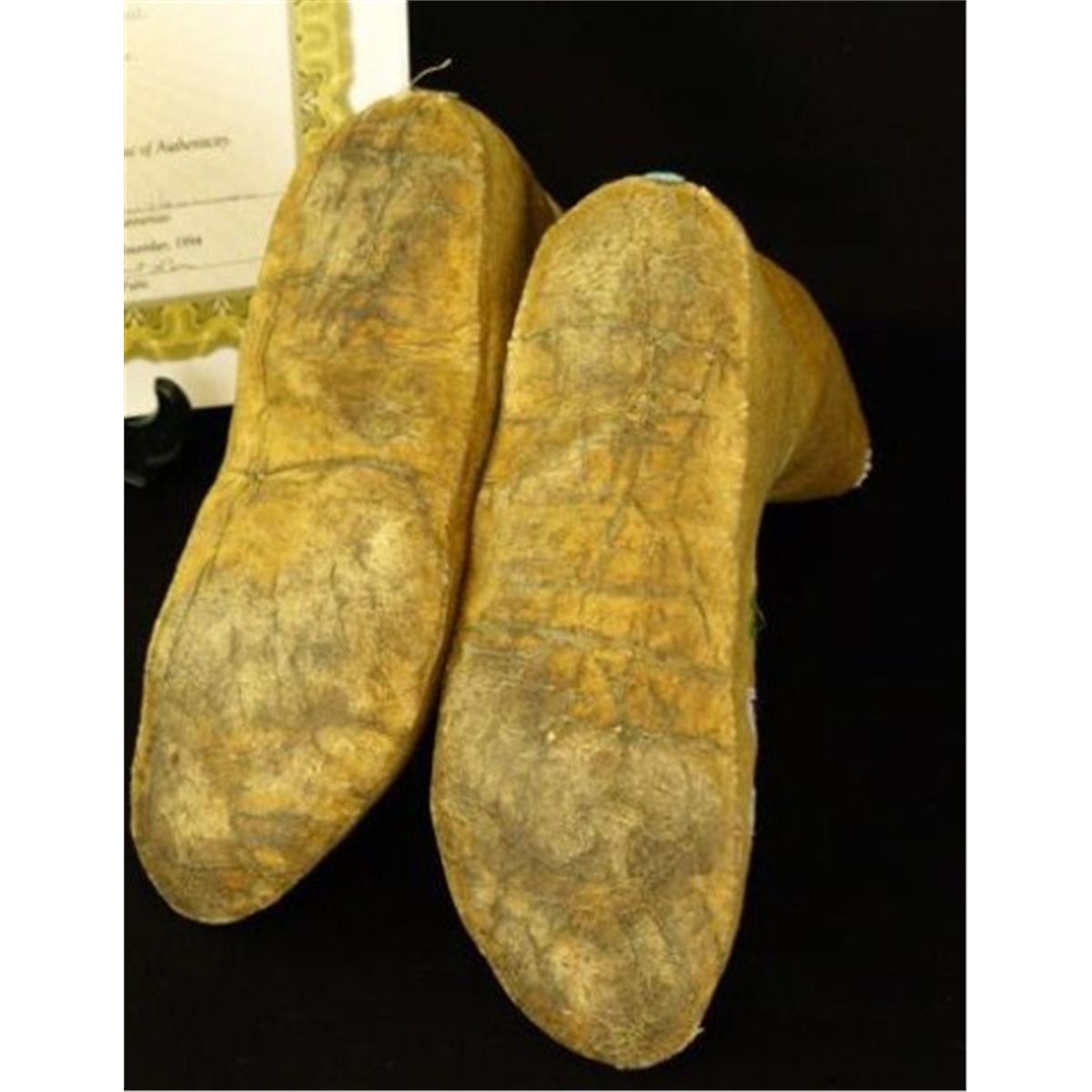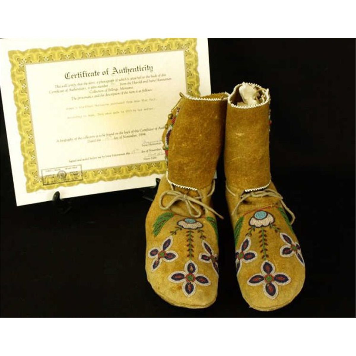 C. 1923 Blackfoot high top moccasins from the Harold Hannemann collection with certificate of provenance, signed dated and notarized. Finely beaded floral uppers, back, ankles openings, remain soft and supple. Slight bead loss to right upper edge and rear heel area. Overall 9" X 7" high.