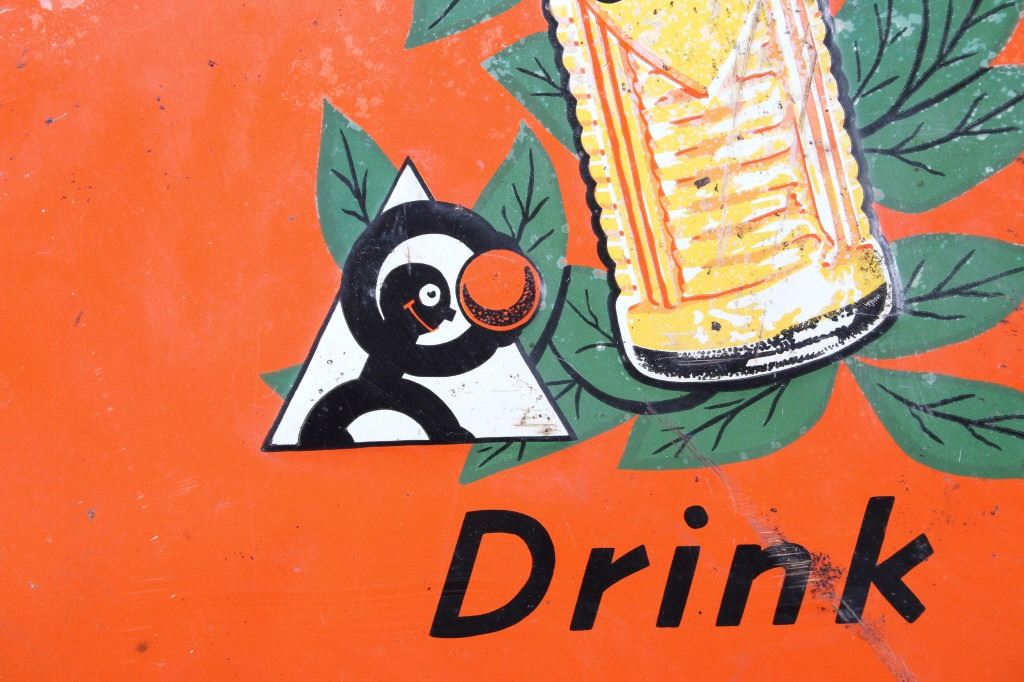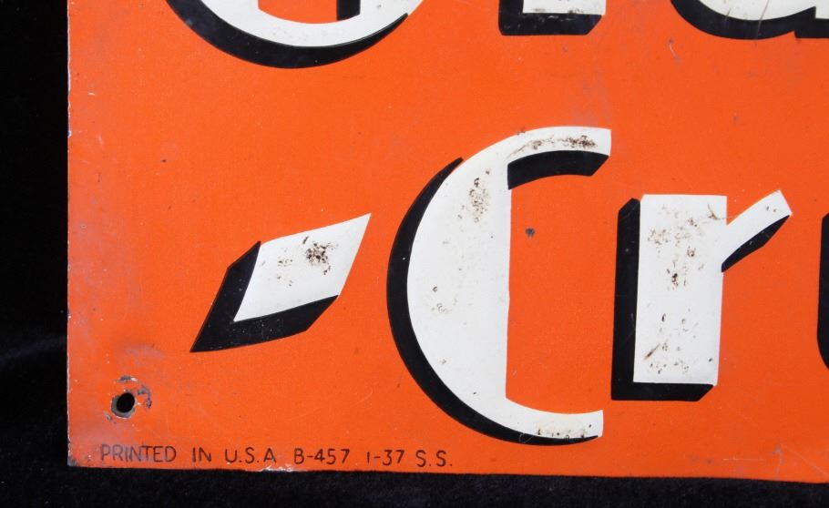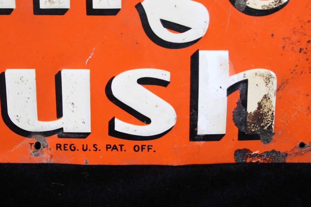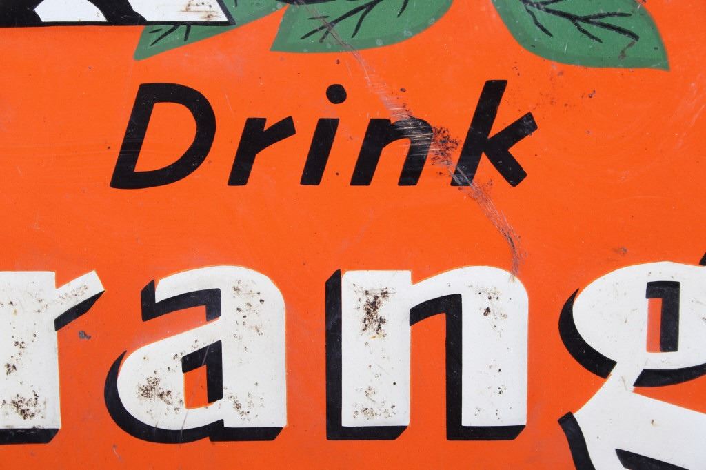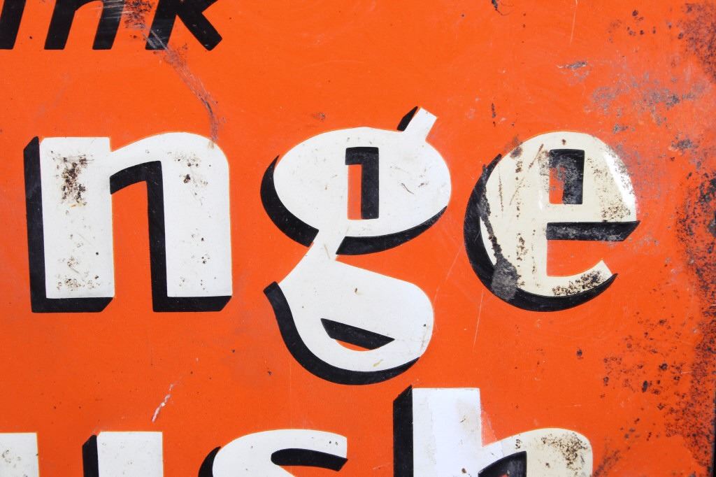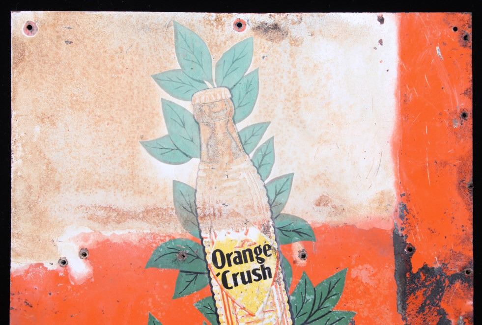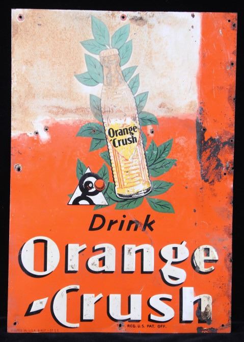 Featured in this lot is an Original Embossed Chromolithographed Tin Sign, circa 1929 to 1938; with illustration of bottle with orange leaves at top and text reading: Drink Orange Crush and features "Crushy", the advertising logo, which was a symbol of Orange Crush and appeared on Orange Crush bottle labels, signs in auto garages and stores, and pinback buttons. Crushy squeezing the flavor out of an orange became the symbol of the soda. Crushy’s appearance changed slightly over the years. Orange Crush was created in 1911 by beverage and extract chemist Neil C. Ward. Most flavors of Crush are caffeine-free. In 1911, Clayton J. Howel, president and founder of the Orange Crush Company, partnered with Neil C. Ward and incorporated the company. Ward made the recipe for Orange Crush. Howel was not new to the soft drink business, having earlier introduced Howel's Orange Julep. Soft drinks of the time often carried the surname of the inventor along with the product name. Howel sold the rights to use his name in conjunction with his first brand; therefore, Ward was given the honours: Crush was first premiered as Ward's Orange Crush. Originally, Orange Crush included orange pulp in the bottles, giving it a "fresh squeezed" illusion, even though the pulp was added rather than remaining from squeezed oranges. Pulp has not been in the bottles for decades.